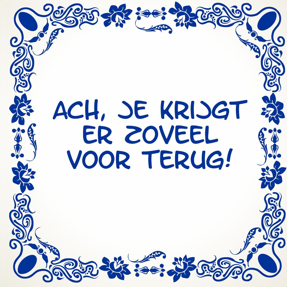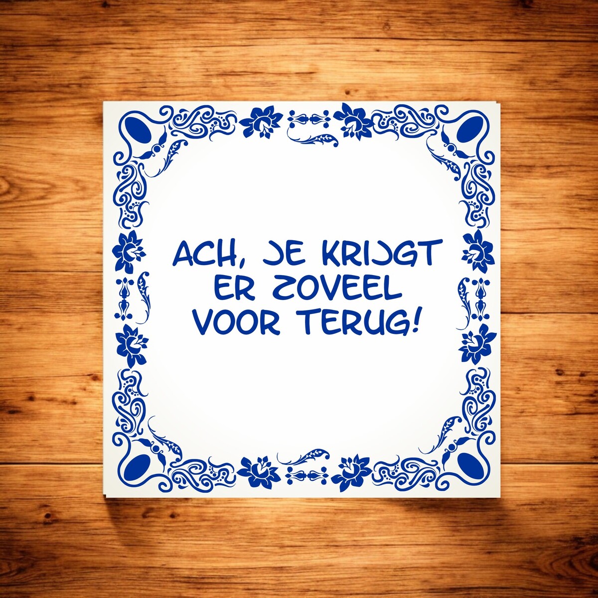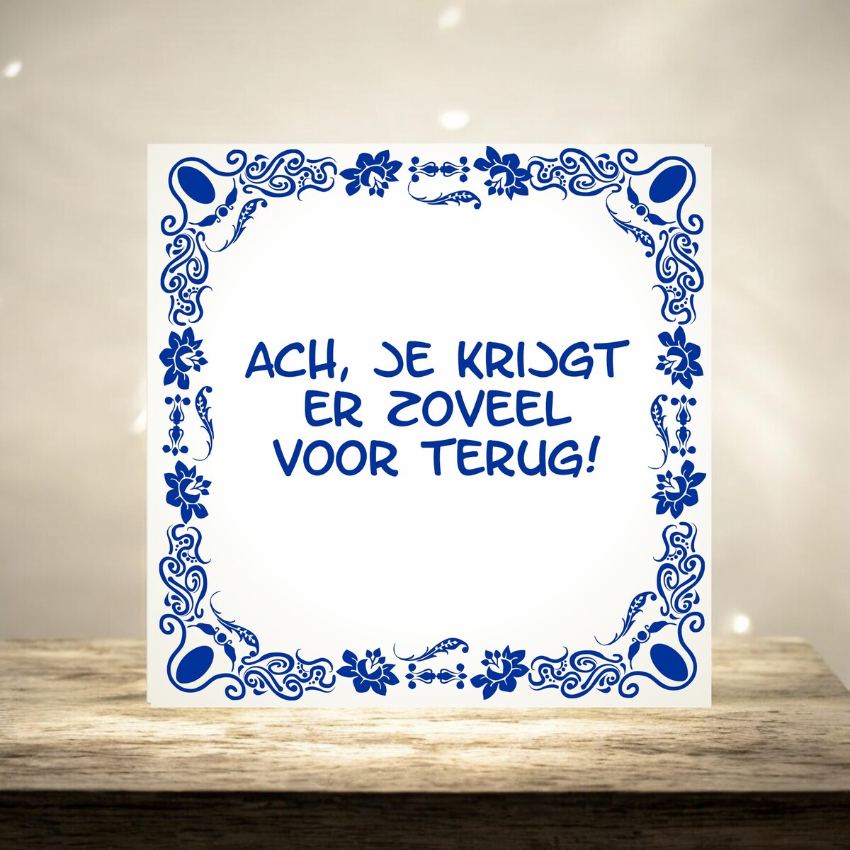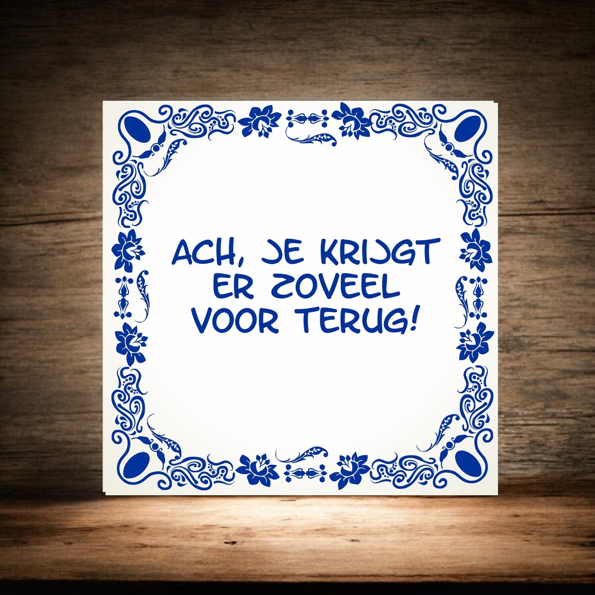 "Voeg een vleugje humor en liefde toe aan je interieur met dit charmante muurtegeltje: 'Ach, gelukkig krijg je er zóveel voor terug.' Deze tegel is een eerbetoon aan het avontuurlijke ouderschap, met een knipoog naar de uitdagende momenten die elke ouder tegenkomt. Hang dit tegeltje in je huis en herinner jezelf eraan dat, ondanks de ups en downs, de vreugde en liefde die kinderen brengen onbetaalbaar zijn. Het tegeltje is gemaakt van hoogwaardig materiaal en heeft een tijdloos ontwerp dat bij elk interieur past. Afmeting van het tegeltje is 15cm x 15cm.