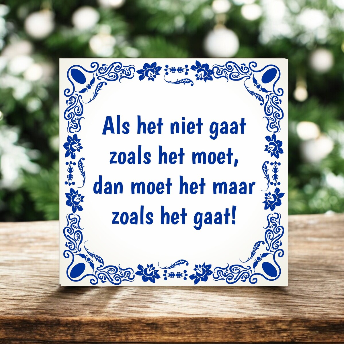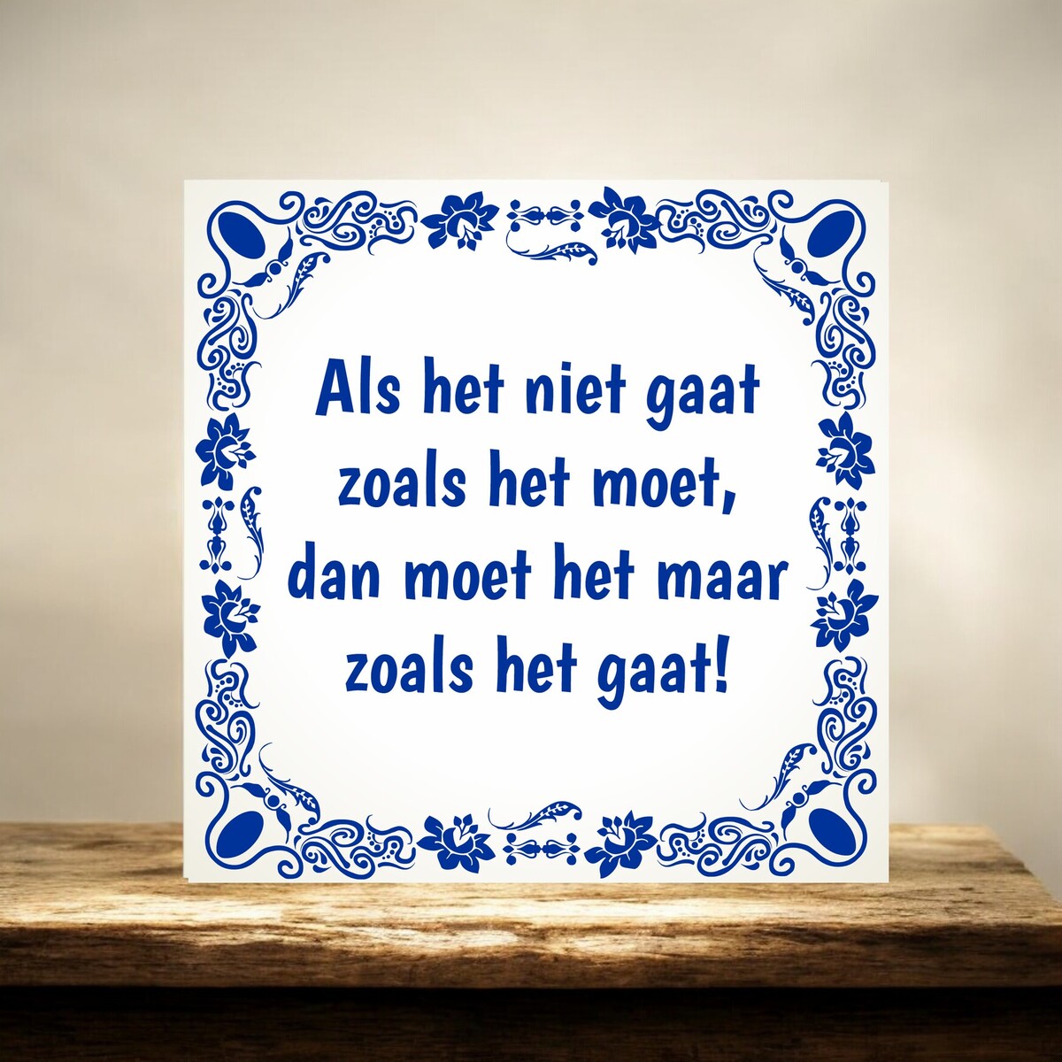 Tegeltje met een wijze spreuk : Als het niet gaat zoals het moet, dan moet het maar zoals het gaat! Het tegeltje heeft een formaat van 15cm x 15cm.