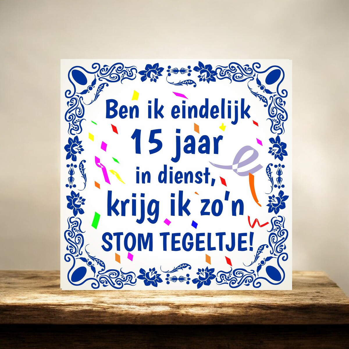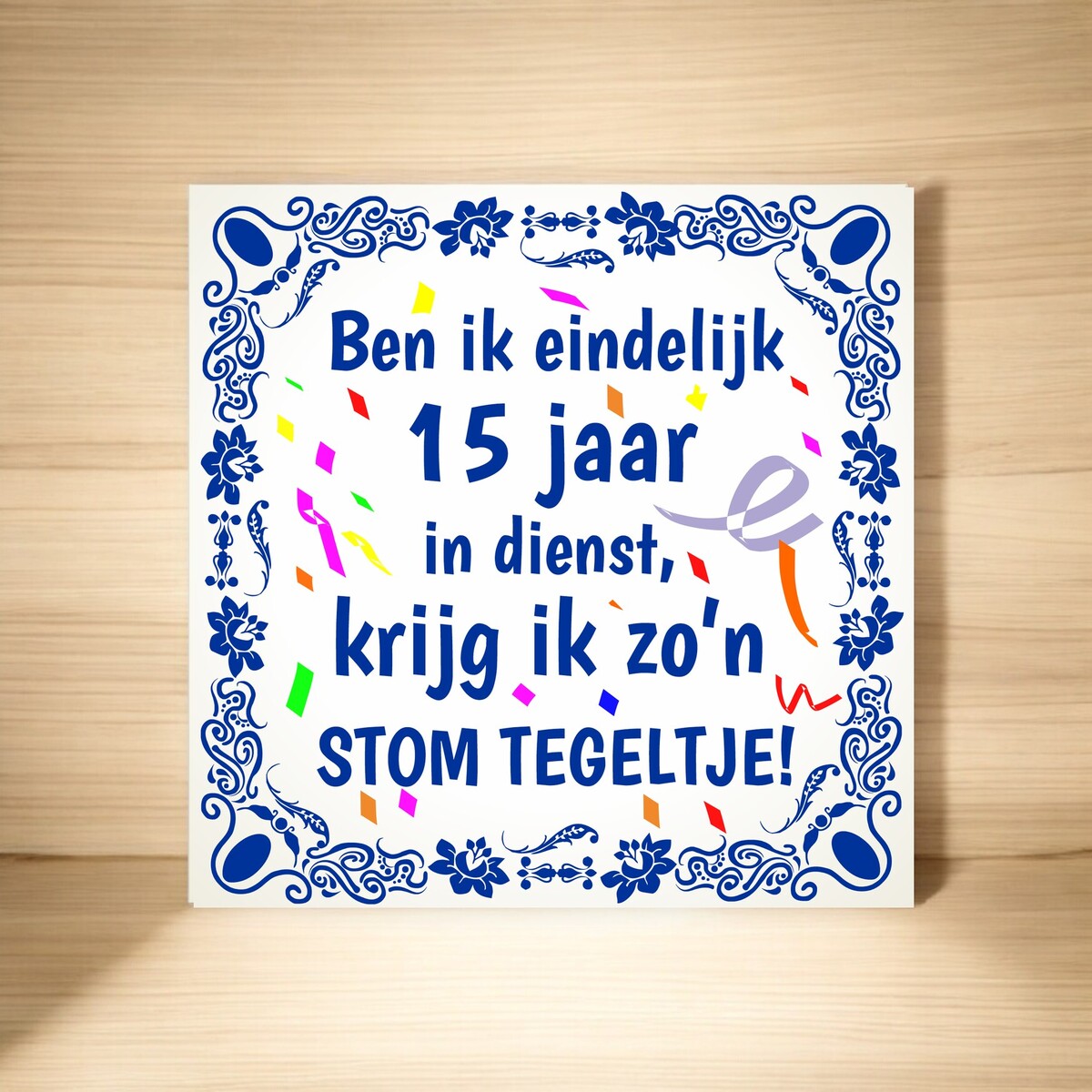 Een grappig cadeautje voor je collega die 15 jaar in dienst is. Het spreukentegeltje is voor zien van de opdruk 'Ben ik eindelijk 15 jaar in dienst, krijg ik zo'n stom tegeltje'. Het tegeltje heeft een afmeting van 15cm x 15cm.