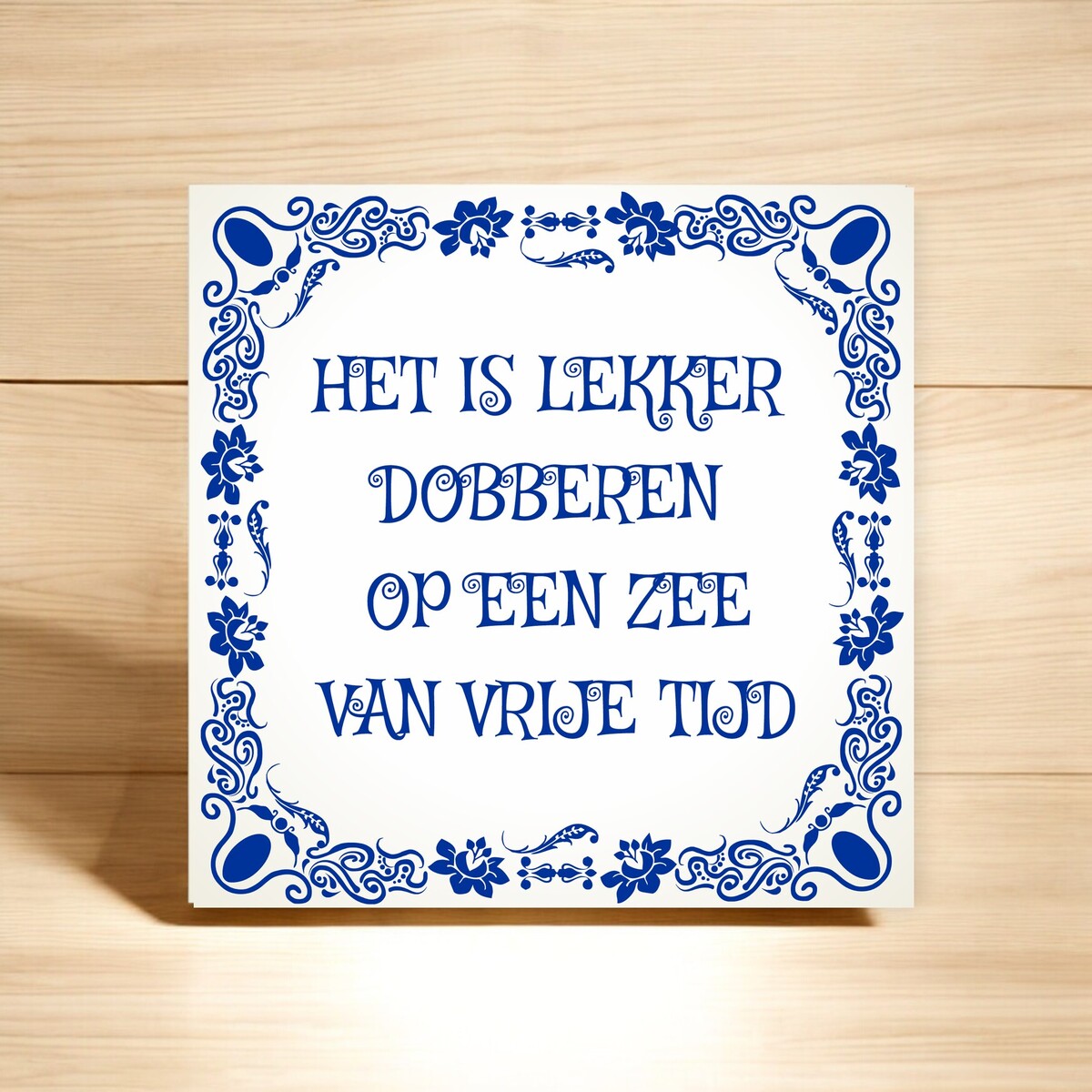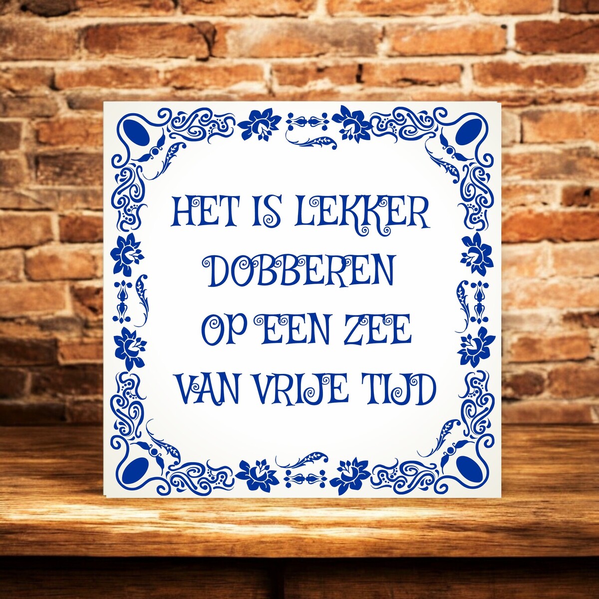 Een prachtig tegeltje om hem of haar te geven als hij of zij met pensioen gaat. Op het pensioen tegeltje staat de tekst "Het is lekker dobberen op een zee van vrije tijd".
