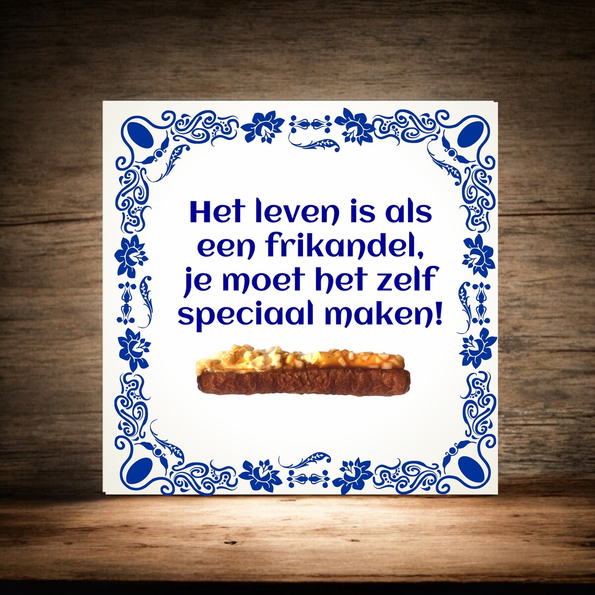 Tegeltje Het leven is als een frikandel , je moet het zelf speciaal maken! Het tegeltje heeft een format van 15cm x 15cm.
