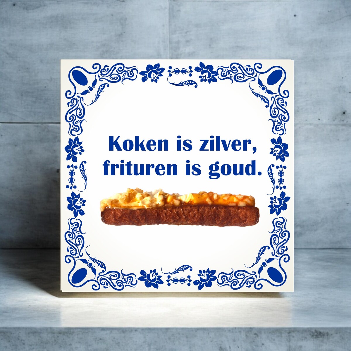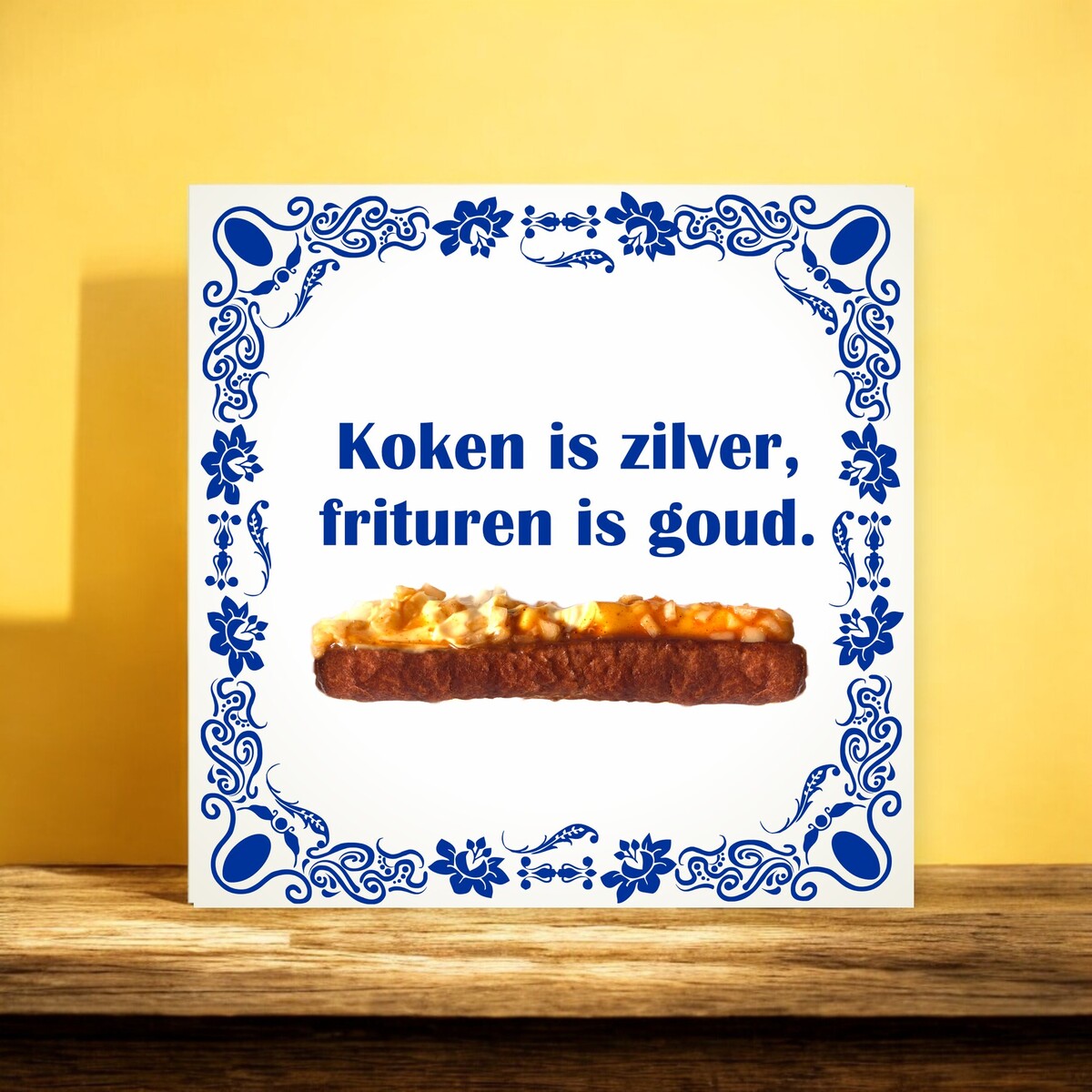 Fleur jouw patatzaak op met een leuk tegeltje aan de wand met de tekst: Koken is zilver, frituren is goud. Onze tegeltjes hebben een afmeting van 15cm x 15cm (exclusief bevestigingsmateriaal!)