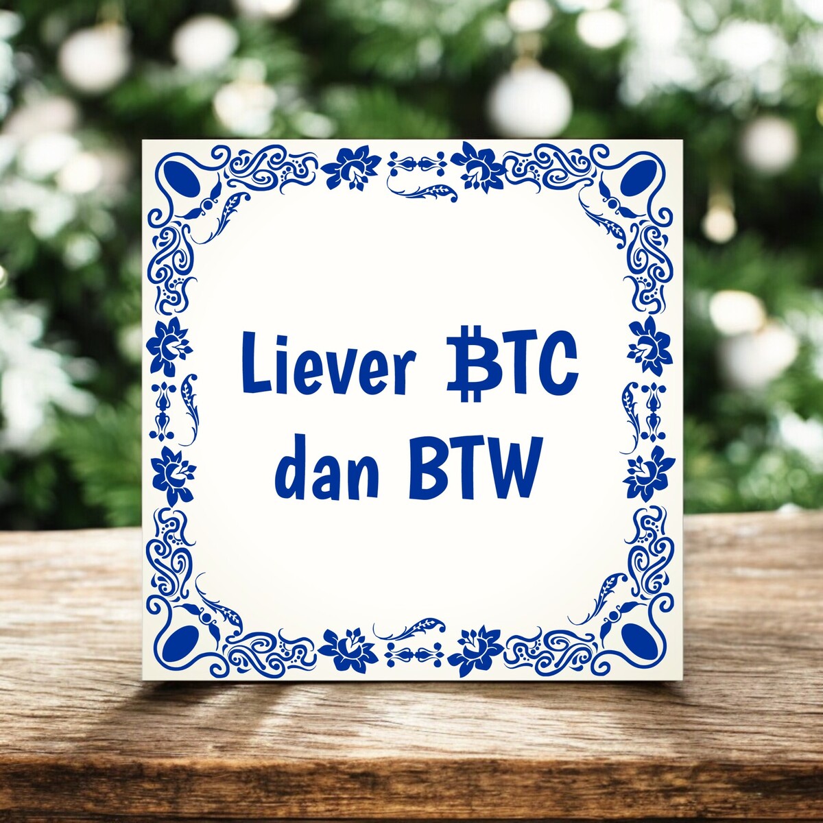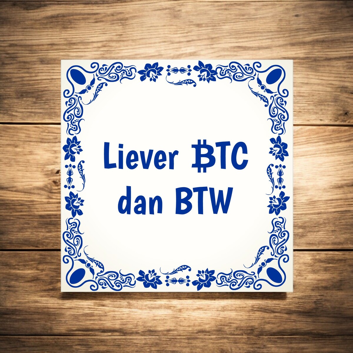 Een grappig Tegeltje met de tekst 'Liever BTC (Bitcoin) dan BTW'.