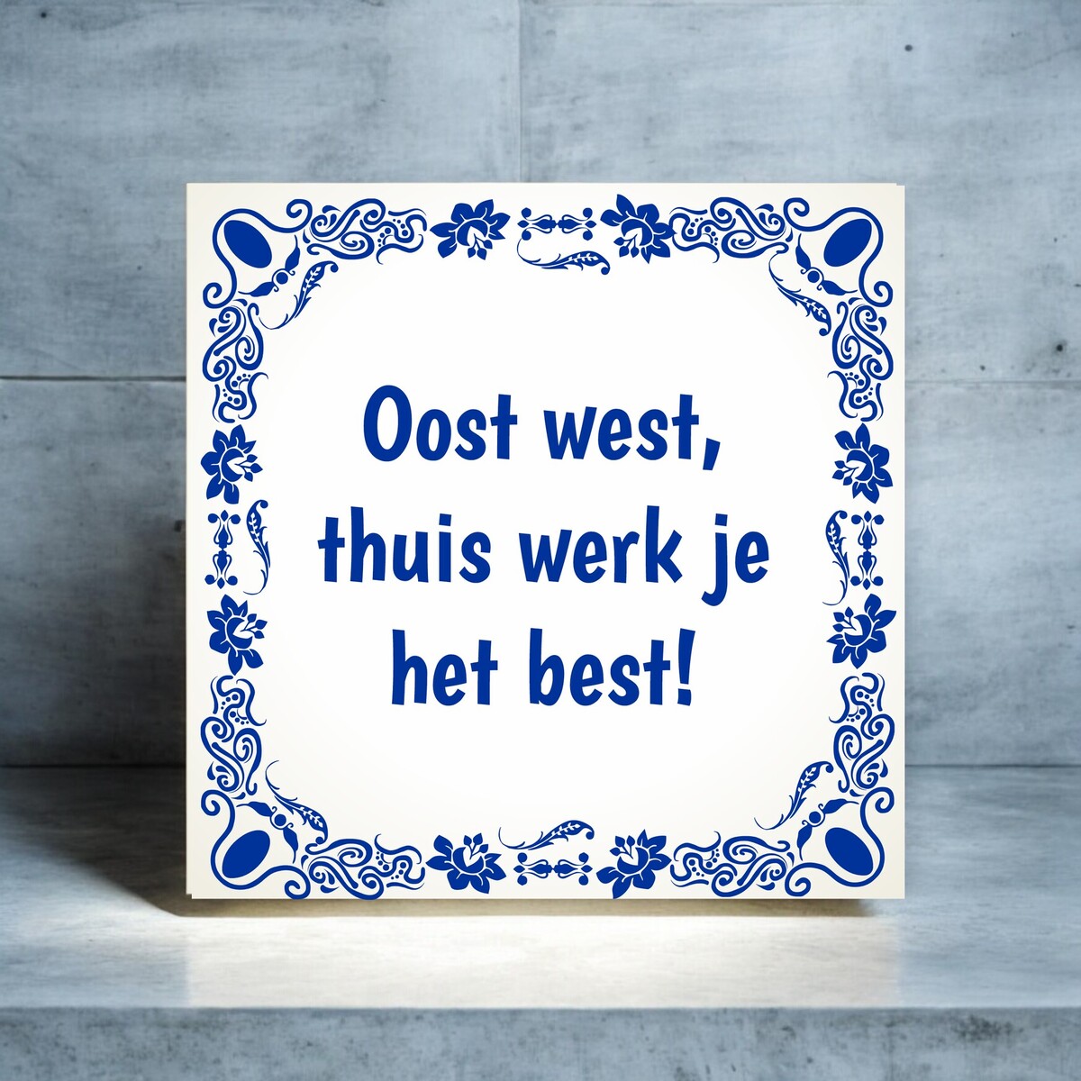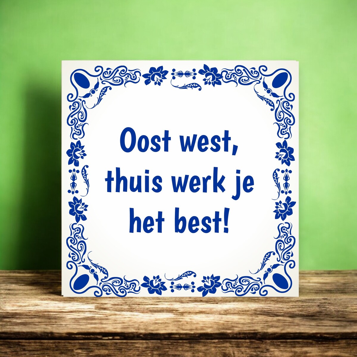 Een grappig thuiswerk tegeltje 'Oost west. thuis werk je het best!'. Het formaat van het tegeltje is 15cm x 15cm.