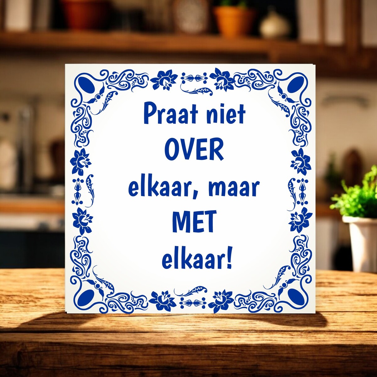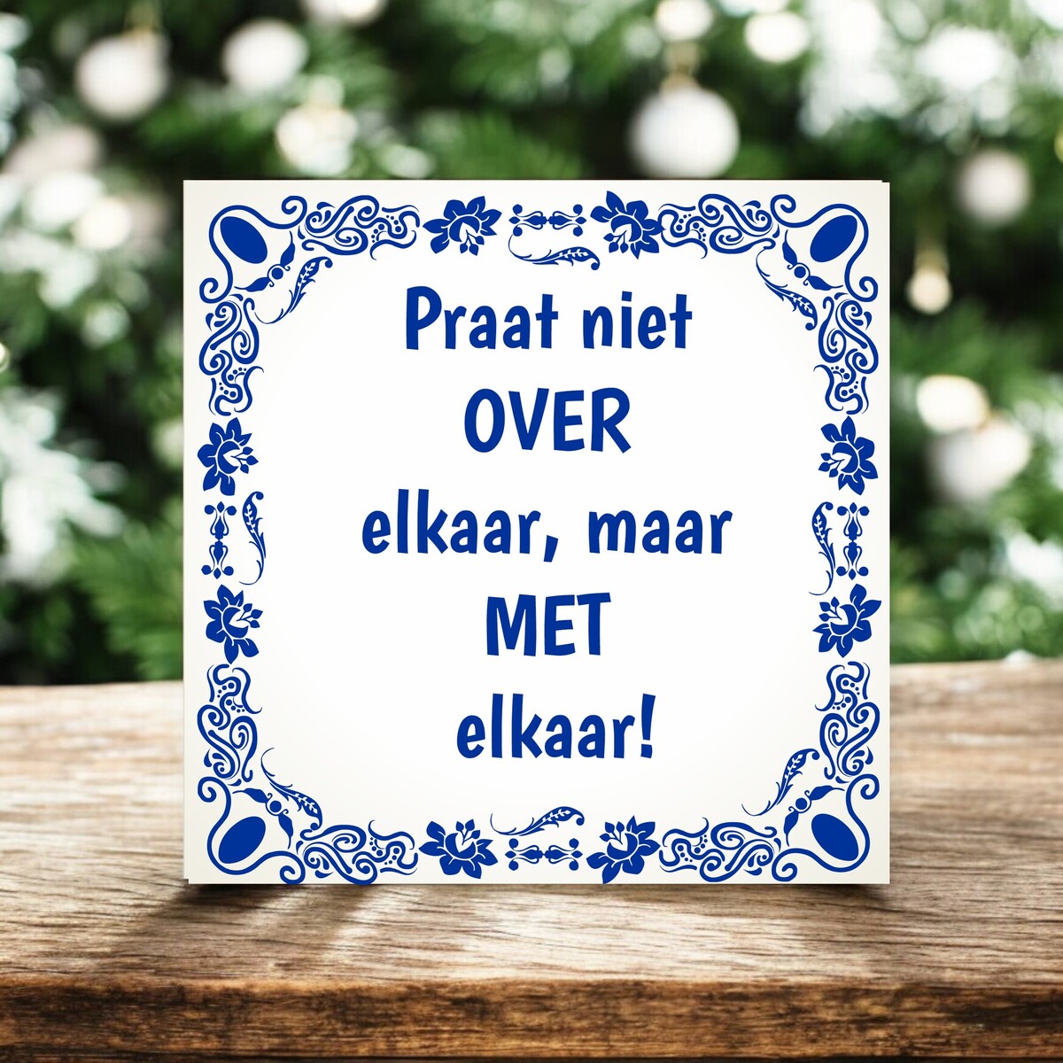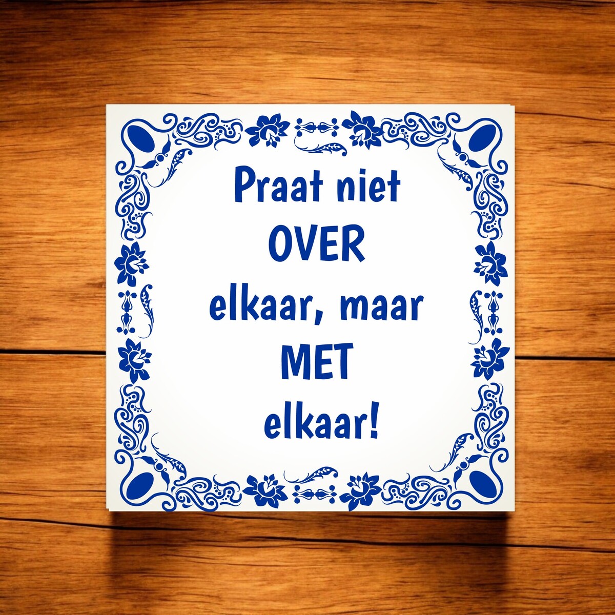 Tegeltje Praat niet over elkaar, maar met elkaar! Het tegeltje heeft een formaat van 15cm x 15cm.
