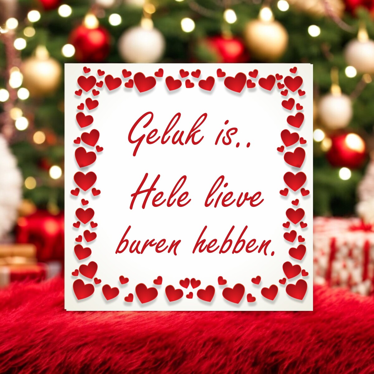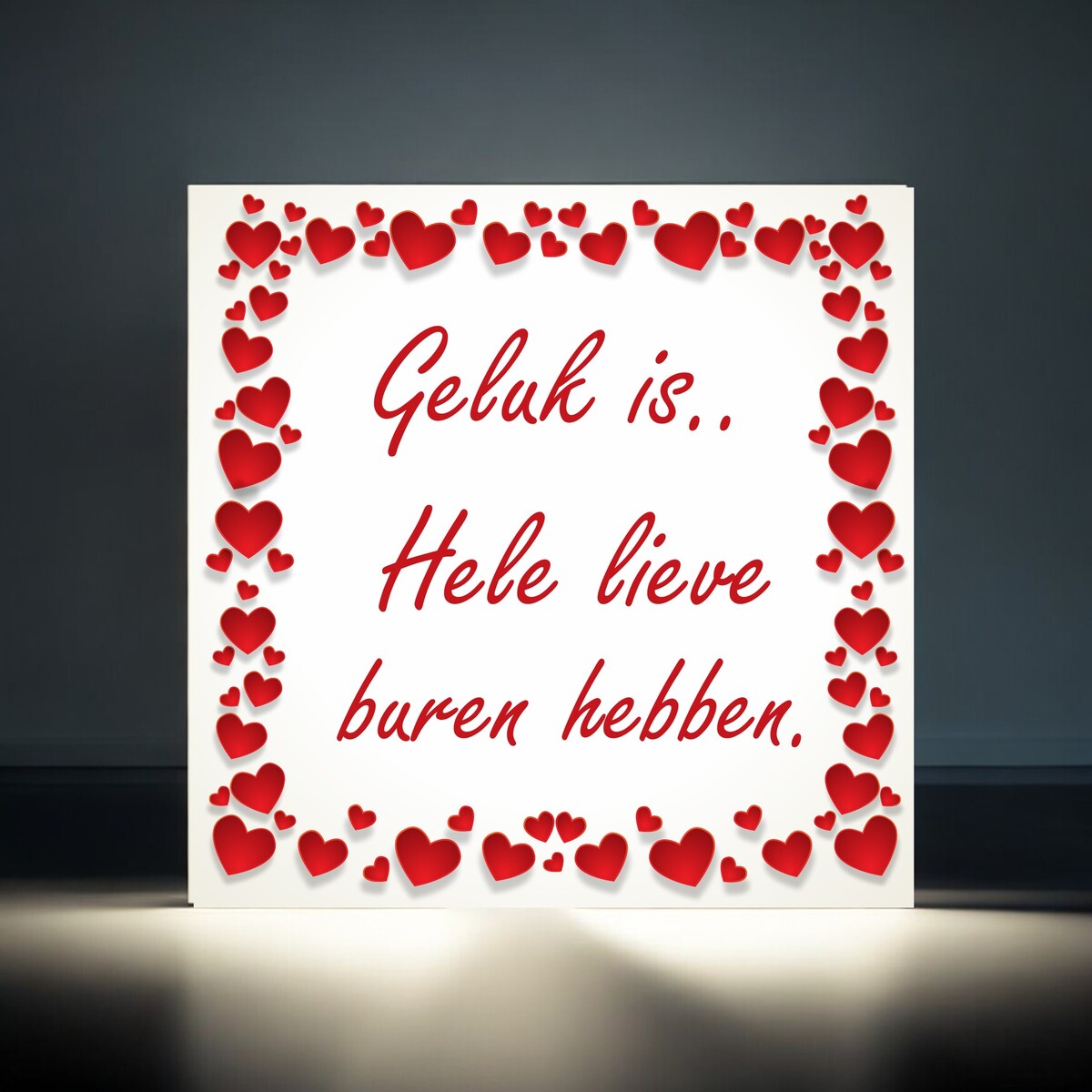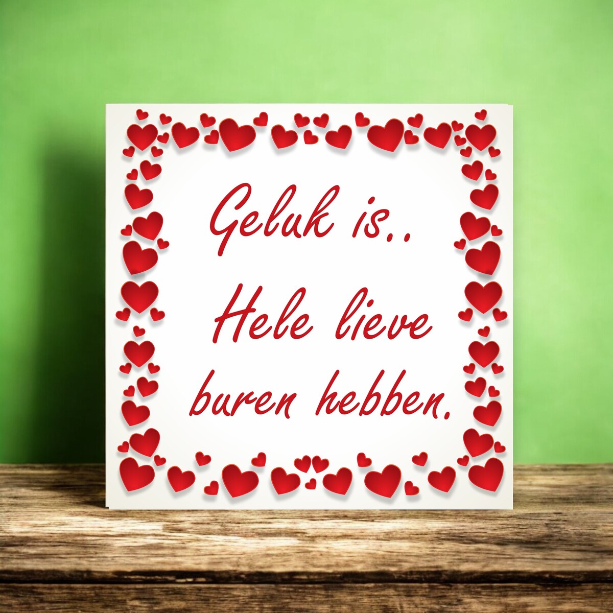 Tegeltje voor hele lieve buren! Op het tegeltje staat de tekst 'Geluk is ... Hele lieve buren hebben.' Dit tegeltje heeft een formaat van 15cm x 15cm.