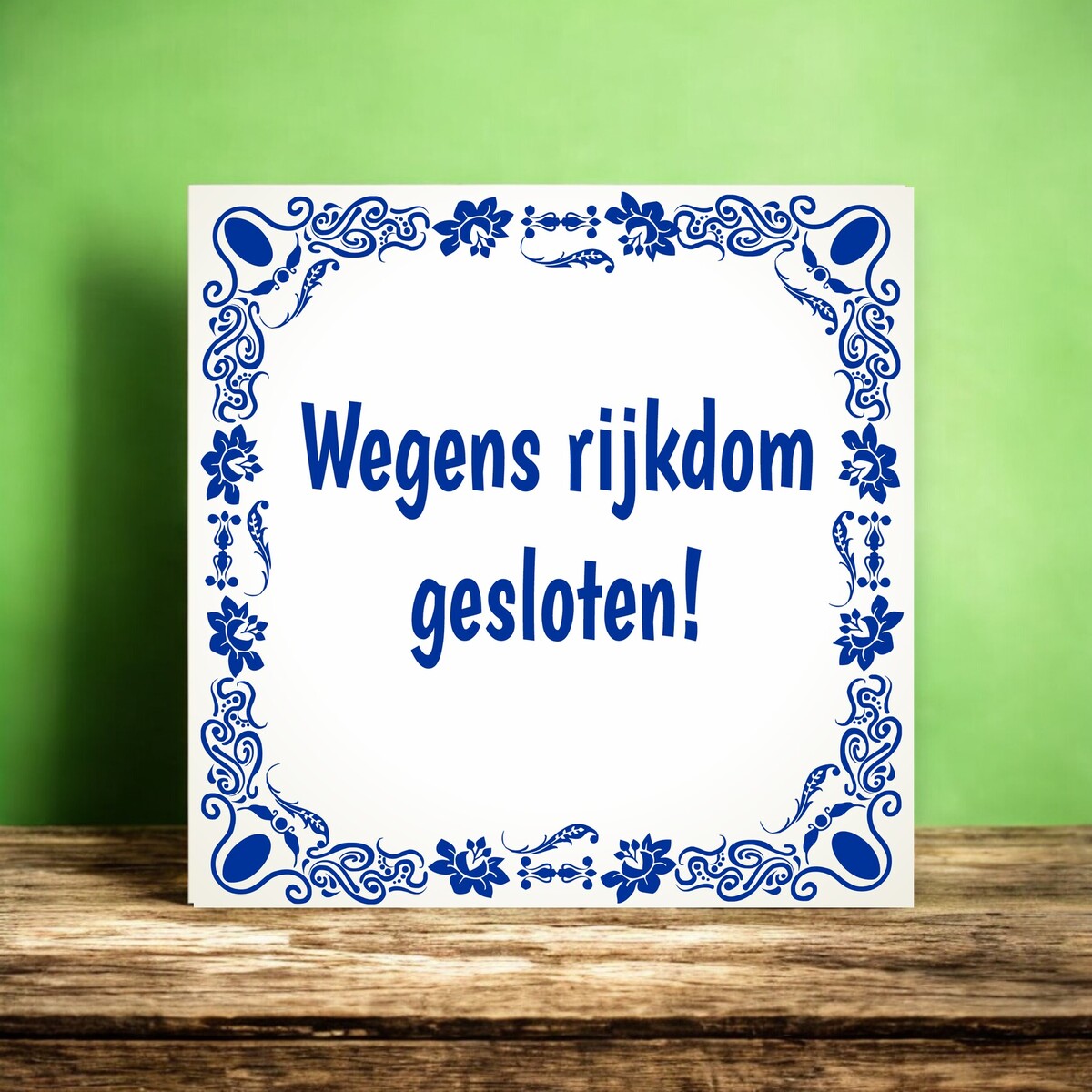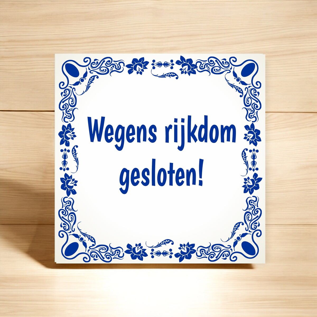 Een grappig Tegeltje voor op het werk : Wegens rijkdom gesloten! Het tegeltje heeft een formaat van 15cm x 15cm.