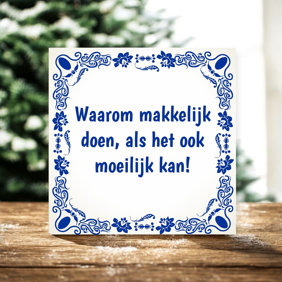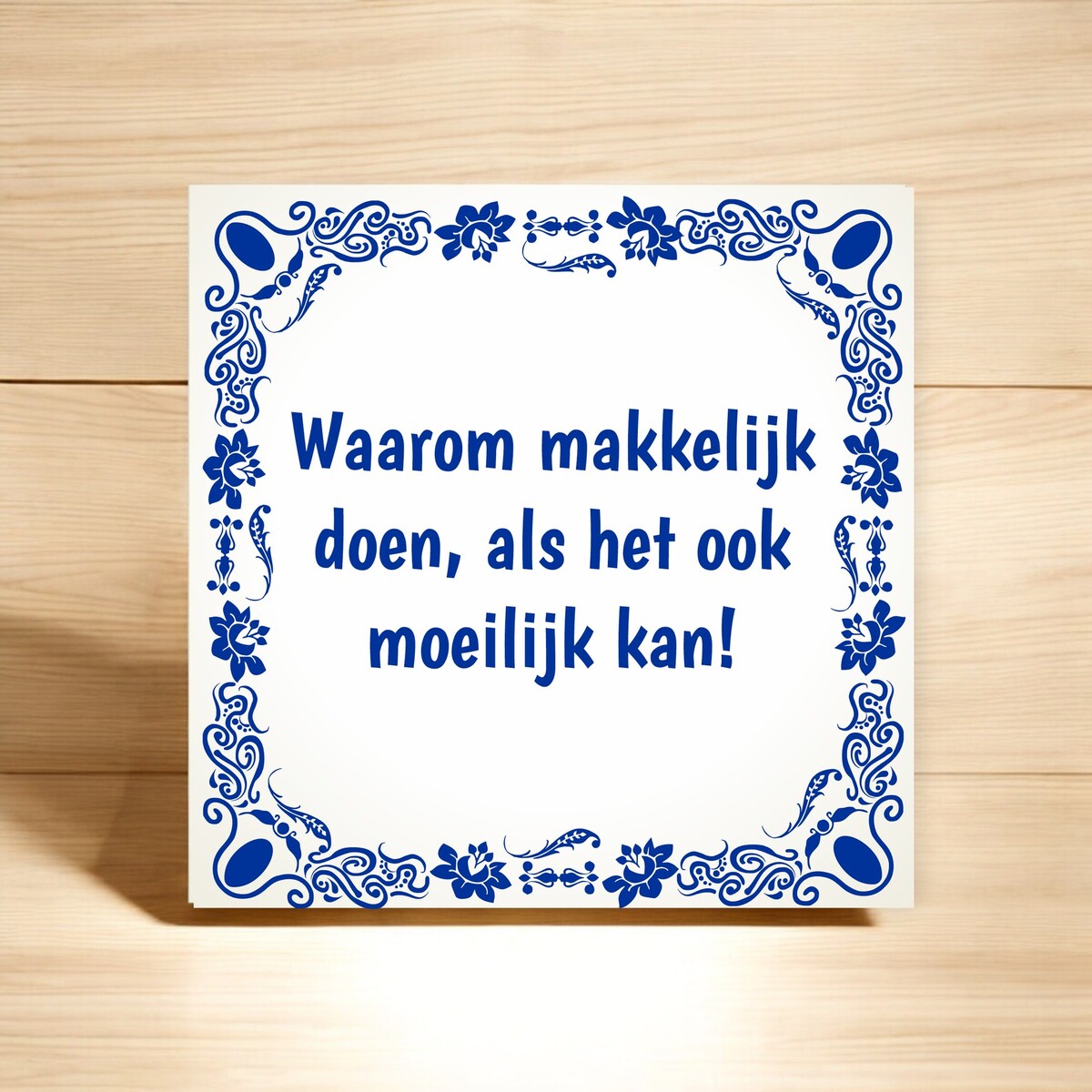 Een tegeltje met de opdruk 'Waarom makkelijk doen, als het ook moeilijk kan!'.