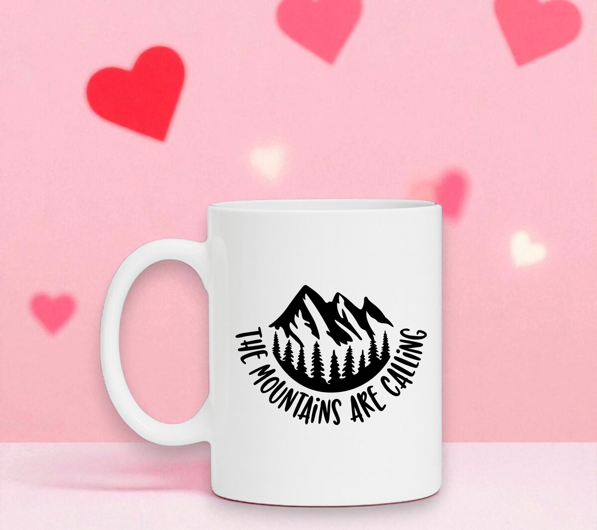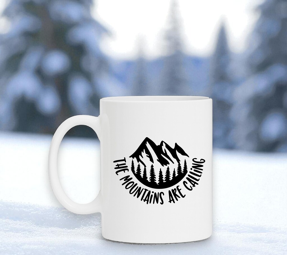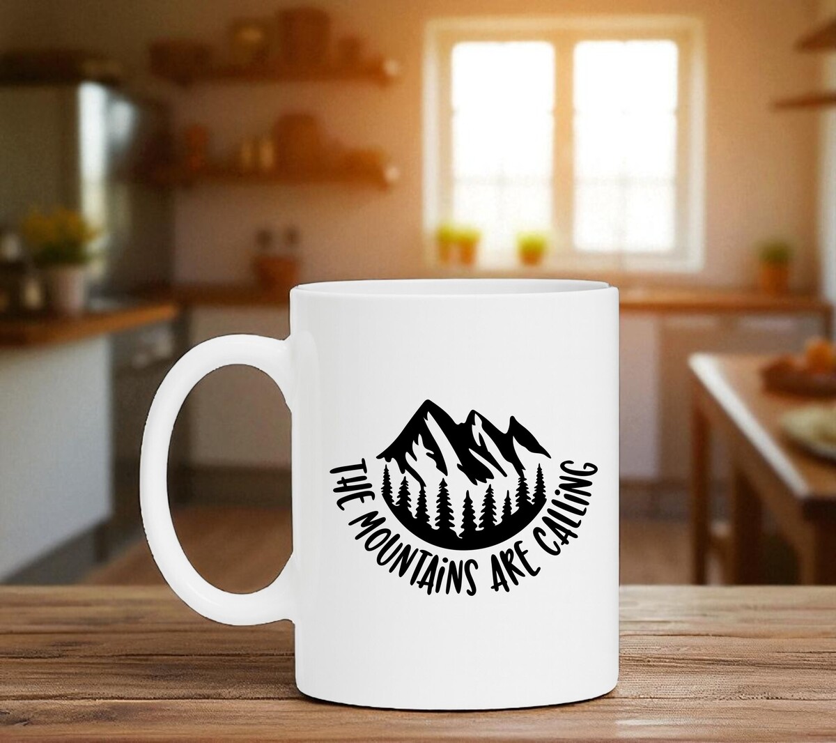 Prachtige witte koffiemok of theemok met de opdruk 'The mountains are calling'. De mok is vaatwasserbestendig, microgolfbestendig en heeft een hoogte van 96mm en een diameter van 80mm.