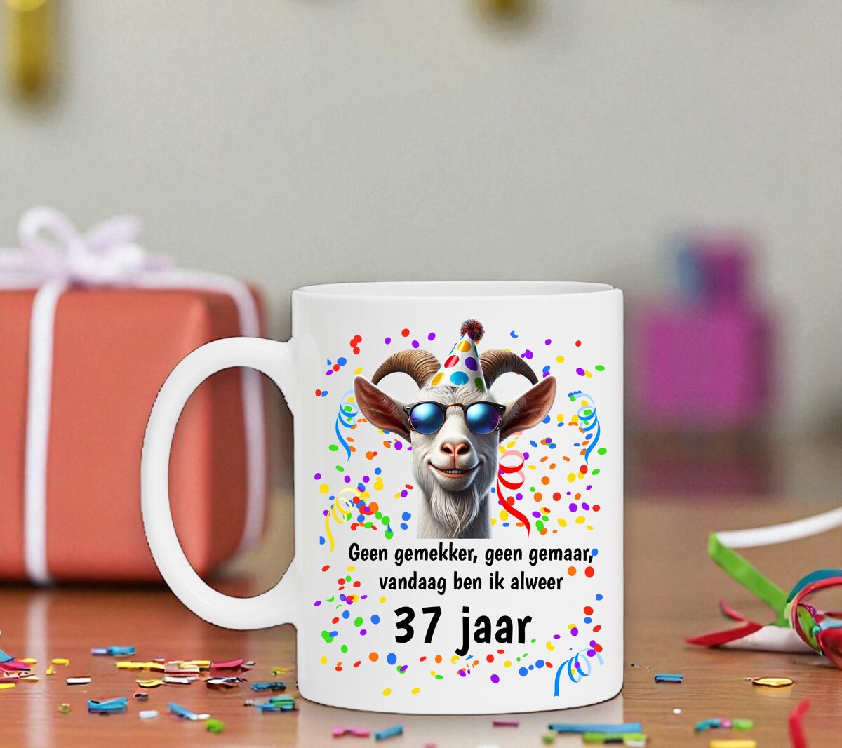 Op deze thee of koffie mok staat de volgende leuke grappige tekst: geen gemekker,geen gemaar vandaag ben ik 37 jaar.