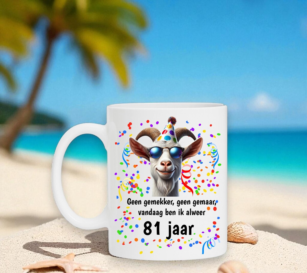 Deze grappige mok is een erg leuk en betaalbaar cadeau voor iemand die zijn of haar 81e verjaardag viert. Op deze mok staat de grappige tekst: geen gemekker, geen gemaar, vandaag ben ik alweer 81 jaar.