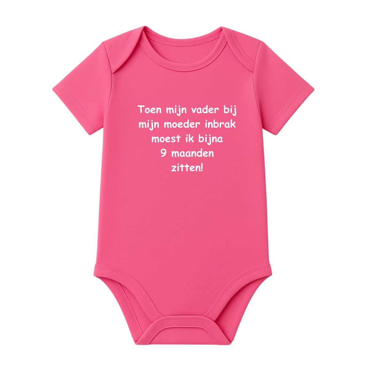 Leuke romper met de tekst :Toen mijn vader bij mijn moeder inbrak moest ik bijna 9 maanden zitten