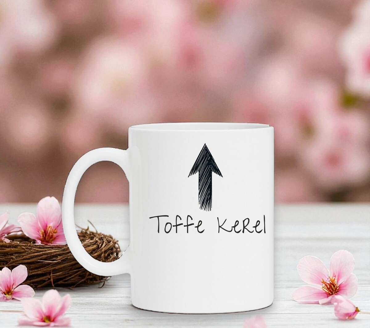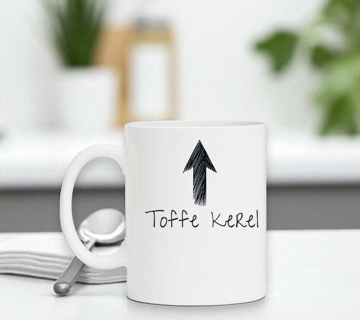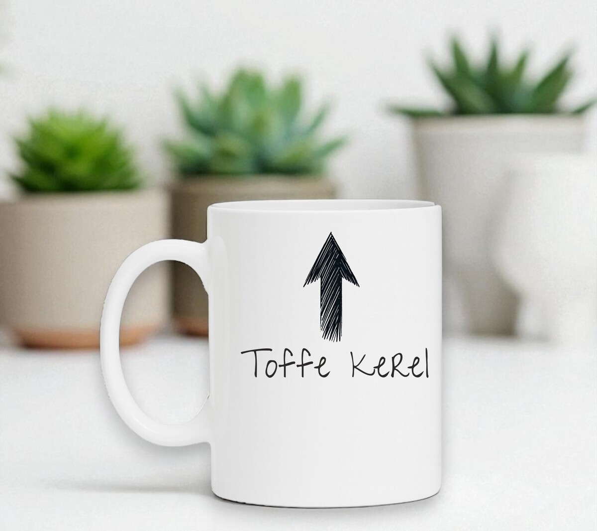 Een leuke en grappige koffiemok met de handgeschreven tekst toffe kerel en een pijl die wijst naar die toffe kerel!