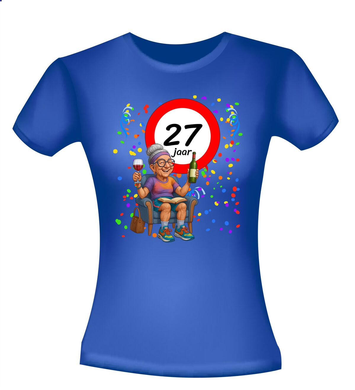 Vier de verjaardag van een echte levensgenieter met dit originele T-shirt waarop een sportieve oudere dame ontspannen in haar fauteuil zit, in haar sportkleding en met een glas én fles wijn in de hand. De feestelijke confetti en het bord met 27 laten meteen zien dat het om een bijzondere mijlpaal gaat. Een humoristisch en stijlvol cadeau dat perfect laat zien dat leeftijd vooral iets is om met volle teugen te vieren.