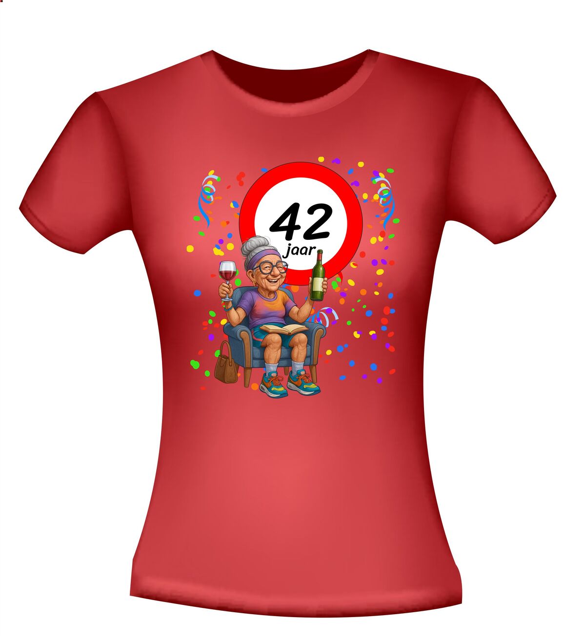 Vier de verjaardag van een echte levensgenieter met dit originele T-shirt waarop een sportieve oudere dame ontspannen in haar fauteuil zit, in haar sportkleding en met een glas én fles wijn in de hand. De feestelijke confetti en het bord met 42 laten meteen zien dat het om een bijzondere mijlpaal gaat. Een humoristisch en stijlvol cadeau dat perfect laat zien dat leeftijd vooral iets is om met volle teugen te vieren.