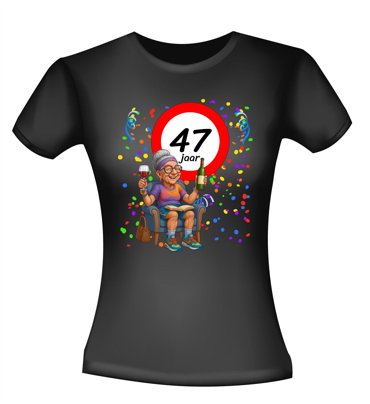 Vier de verjaardag van een echte levensgenieter met dit originele T-shirt waarop een sportieve oudere dame ontspannen in haar fauteuil zit, in haar sportkleding en met een glas én fles wijn in de hand. De feestelijke confetti en het bord met 47 laten meteen zien dat het om een bijzondere mijlpaal gaat. Een humoristisch en stijlvol cadeau dat perfect laat zien dat leeftijd vooral iets is om met volle teugen te vieren.