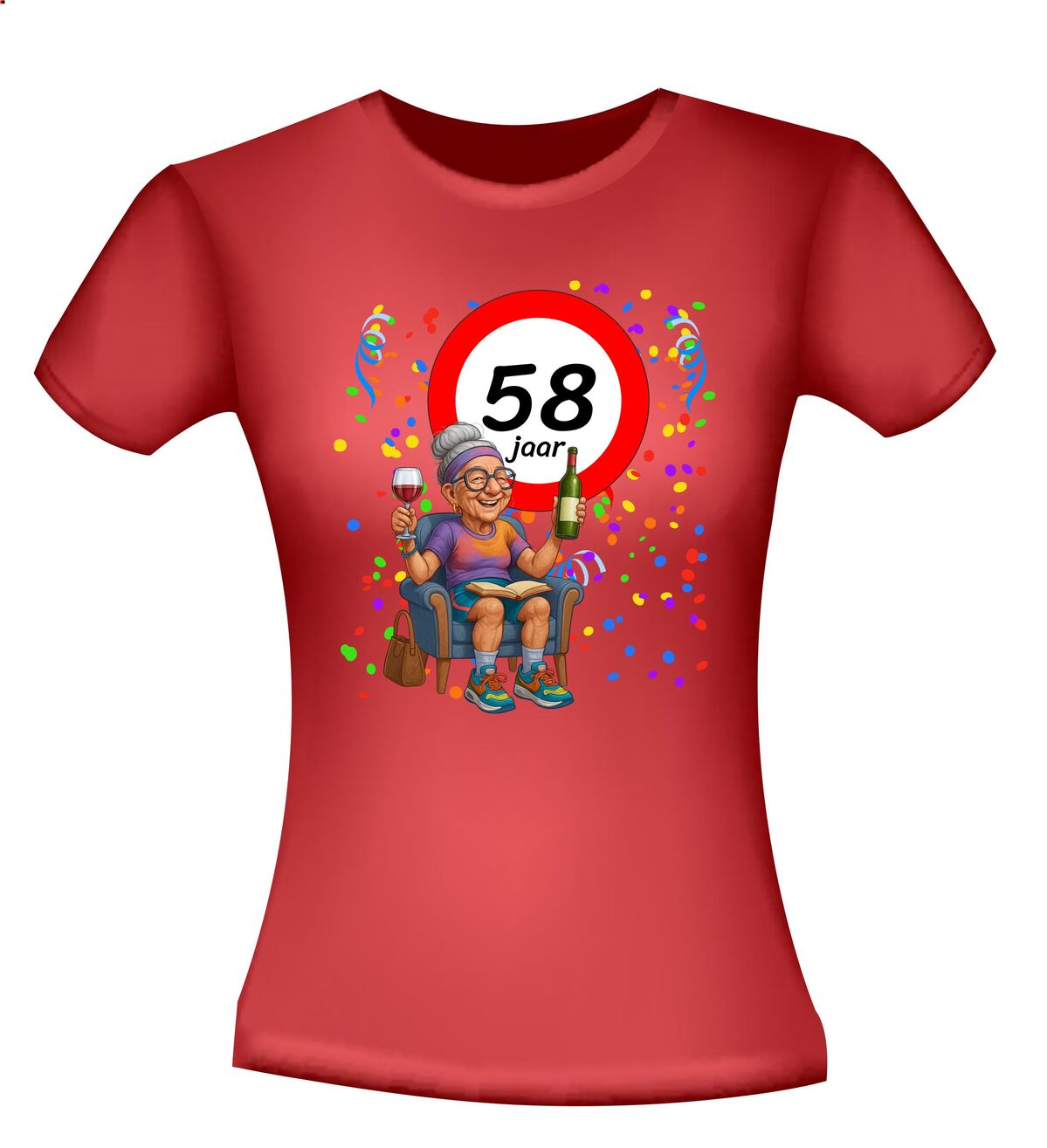 Vier de verjaardag van een echte levensgenieter met dit originele T-shirt waarop een sportieve oudere dame ontspannen in haar fauteuil zit, in haar sportkleding en met een glas én fles wijn in de hand. De feestelijke confetti en het bord met 58 laten meteen zien dat het om een bijzondere mijlpaal gaat. Een humoristisch en stijlvol cadeau dat perfect laat zien dat leeftijd vooral iets is om met volle teugen te vieren.