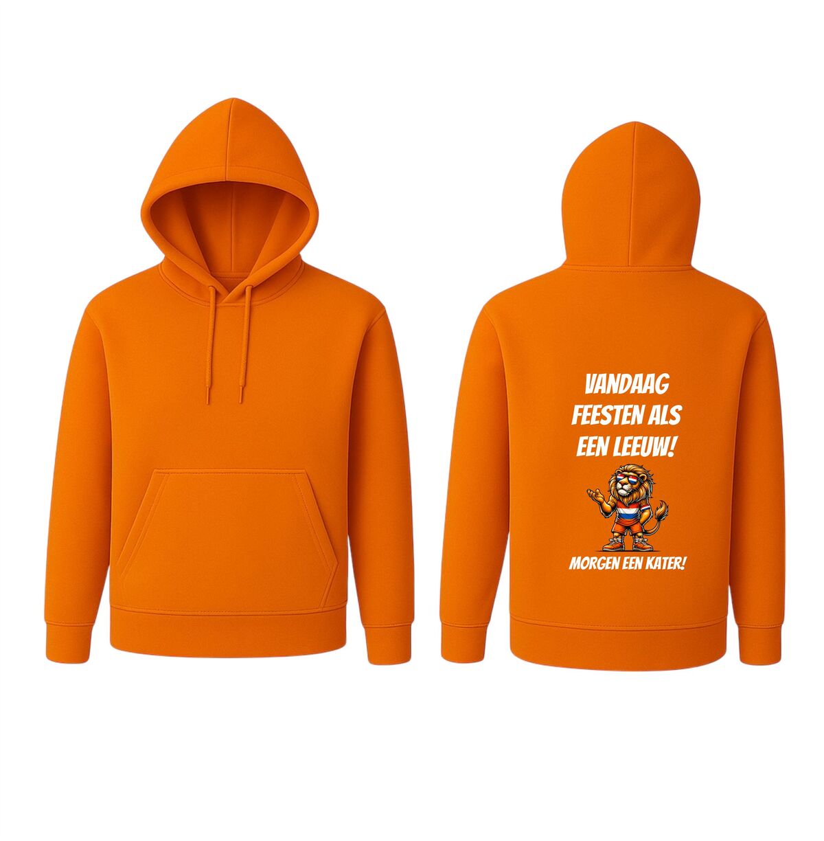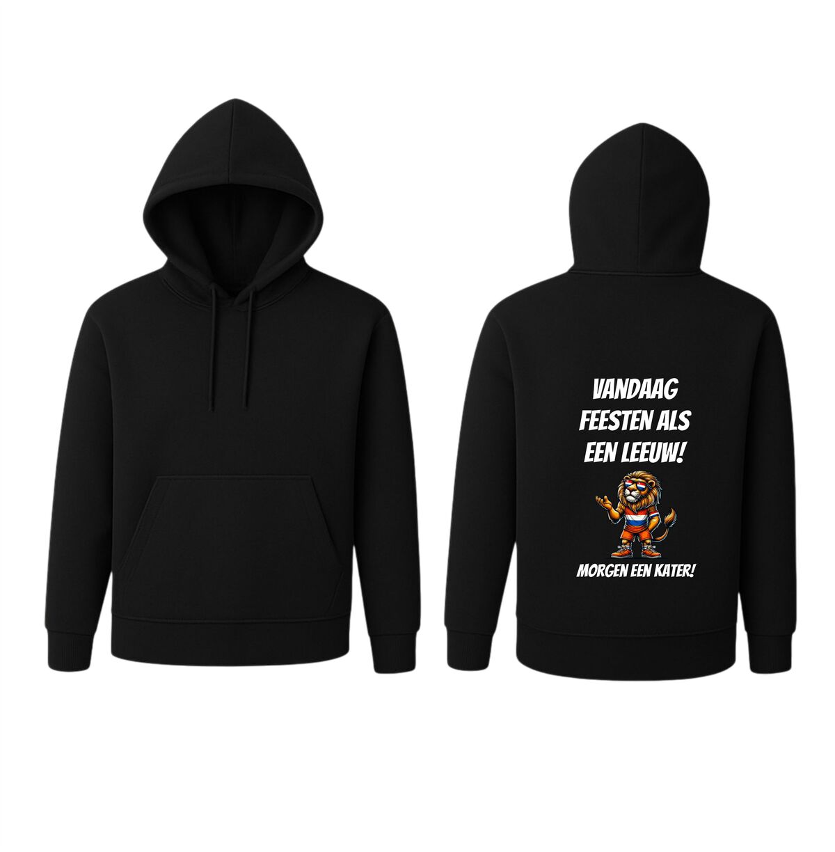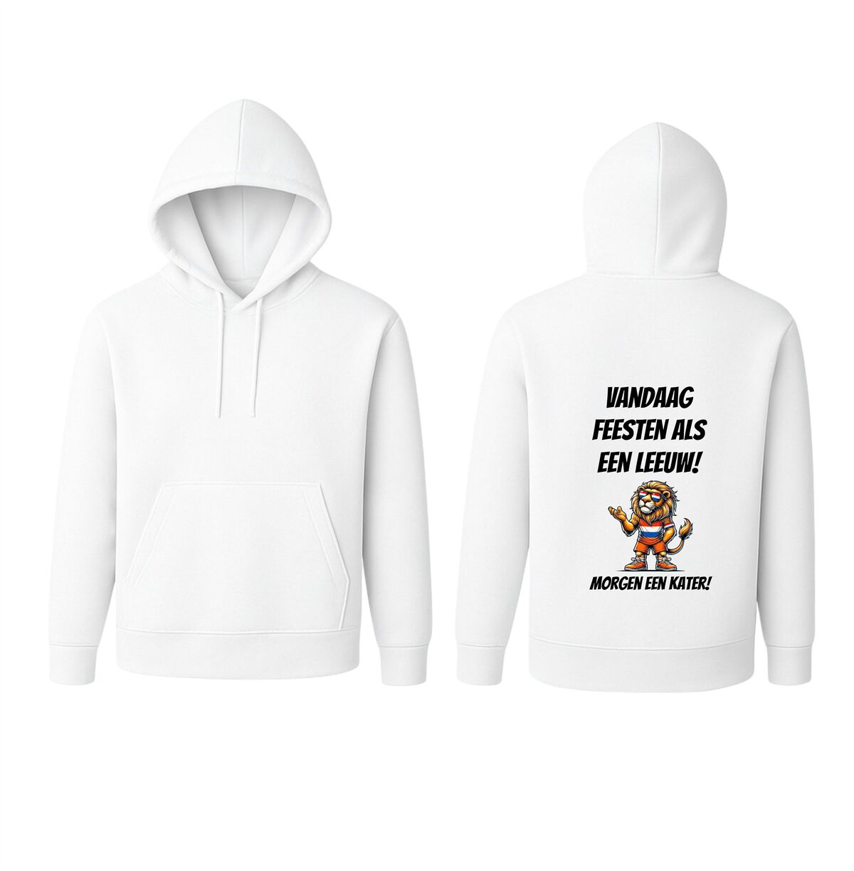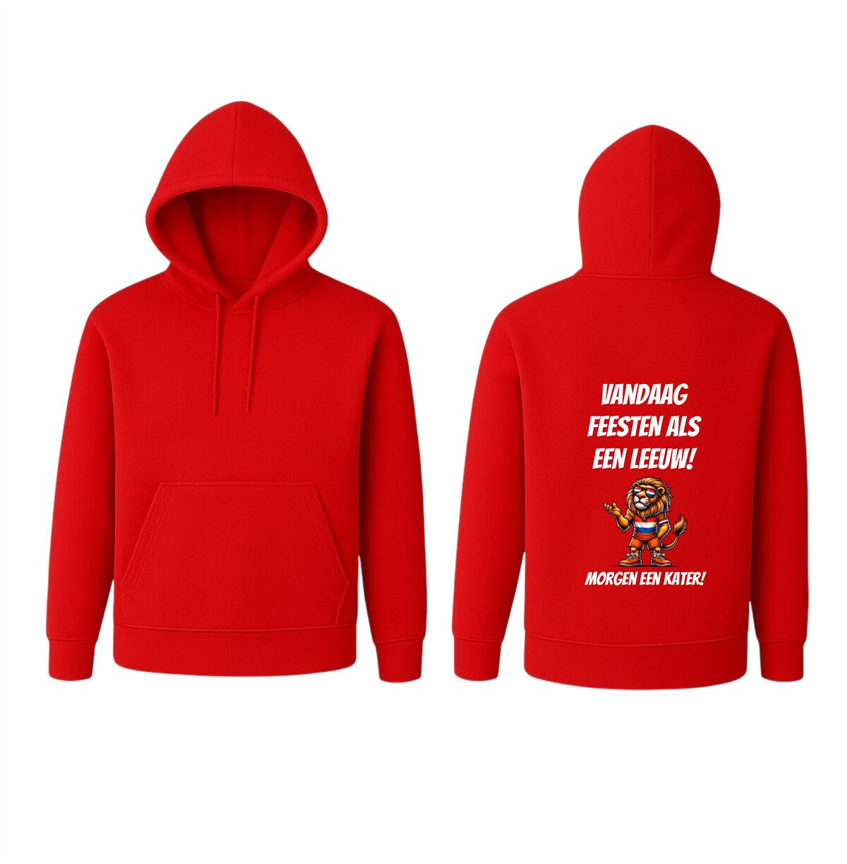 Deze unisex hoodie met de tekst vandaag feesten als een leeuw, morgen een kater. en een krachtige afbeelding van de Nederlandse leeuw in rood wit blauw is dé perfecte supporters hoodie voor iedereen die van feest en Hollandse gezelligheid houdt. De stoere leeuw print in de kleuren van de Nederlandse vlag maakt deze hoodie ideaal voor Koningsdag, EK, WK, voetbalwedstrijden en andere nationale evenementen. Met deze grappige feest spreuk laat je zien dat jij klaar bent om vol energie te vieren in echte Nederlandse stijl.