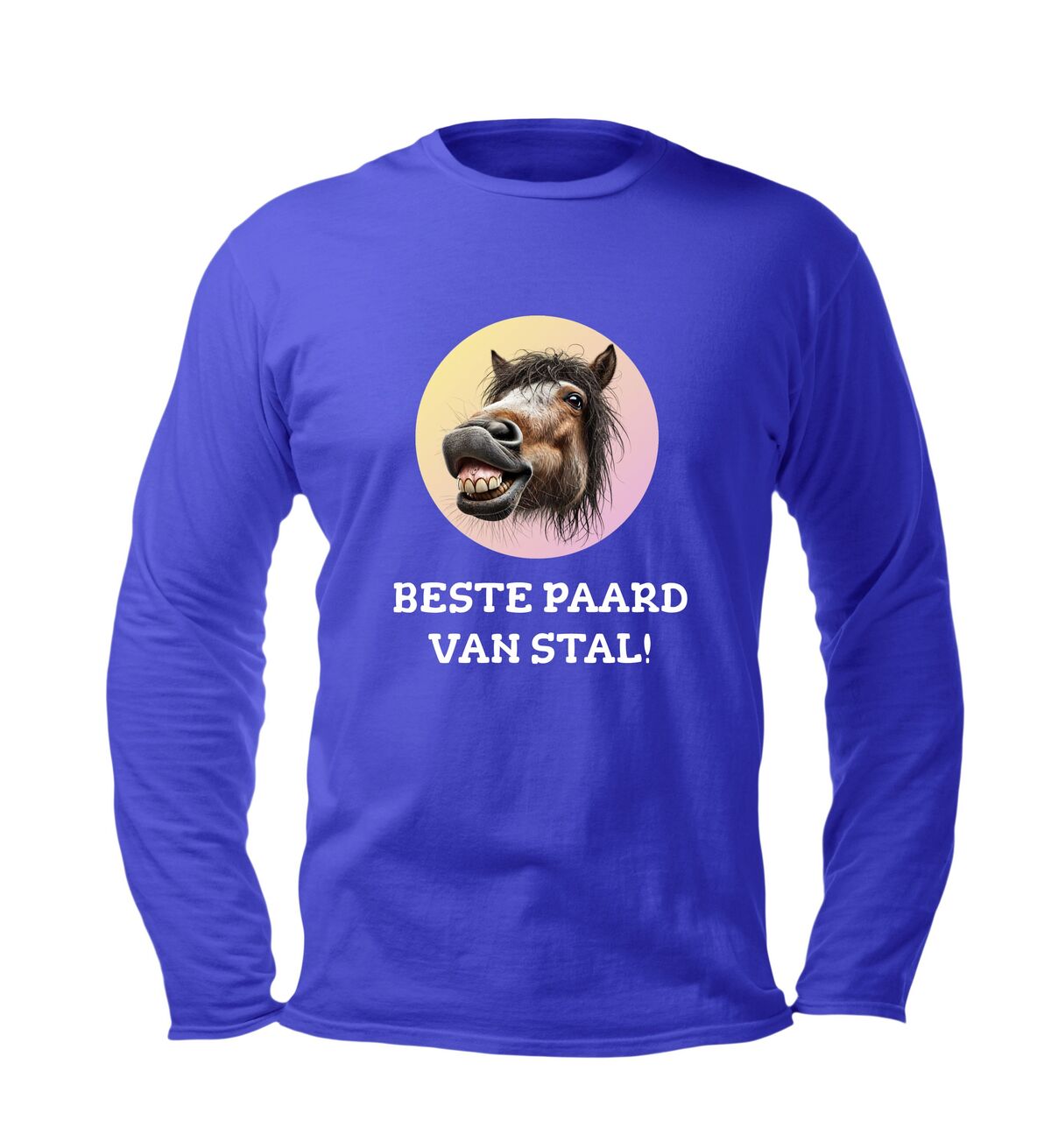 Deze unisex longsleeve combineert comfort, stijl en een vleugje humor. Met de krachtige opdruk “Beste Paard van Stal” en de elegante paardenafbeelding straal je meteen uit dat jij voorop loopt – zowel in de stal als daarbuiten.