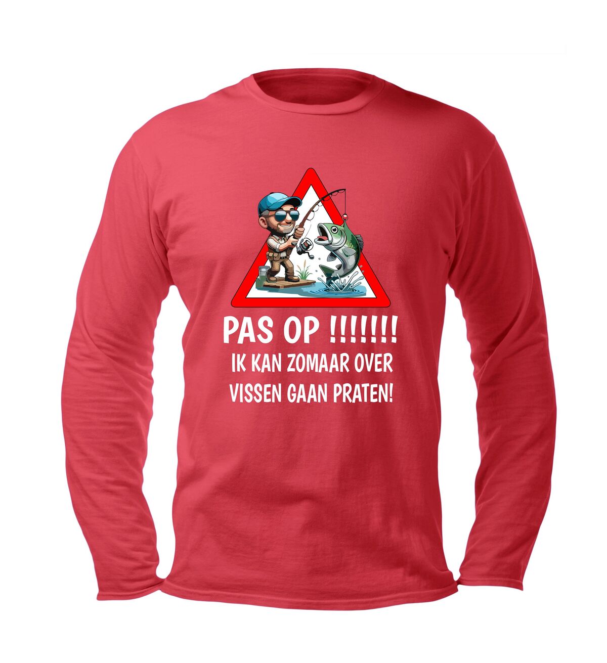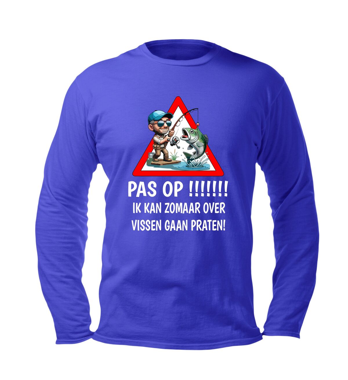 Ben jij zo iemand die tijdens verjaardagen, op het werk of zelfs op vakantie binnen no-time over vissen begint? Dan is deze longsleeve echt iets voor jou! Met de opvallende tekst “Pas op… ik kan zomaar over vissen gaan praten” en een stoere afbeelding van een visser, laat je op een grappige én stijlvolle manier zien waar jouw hart ligt.