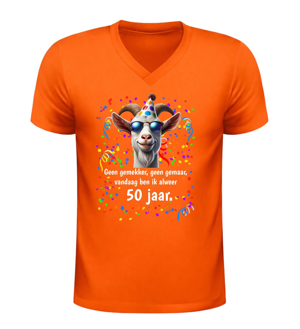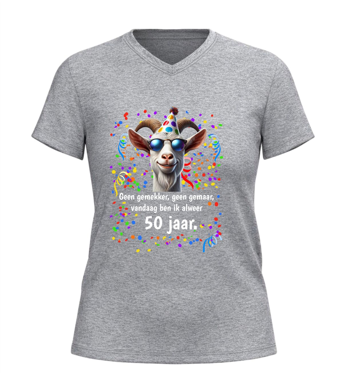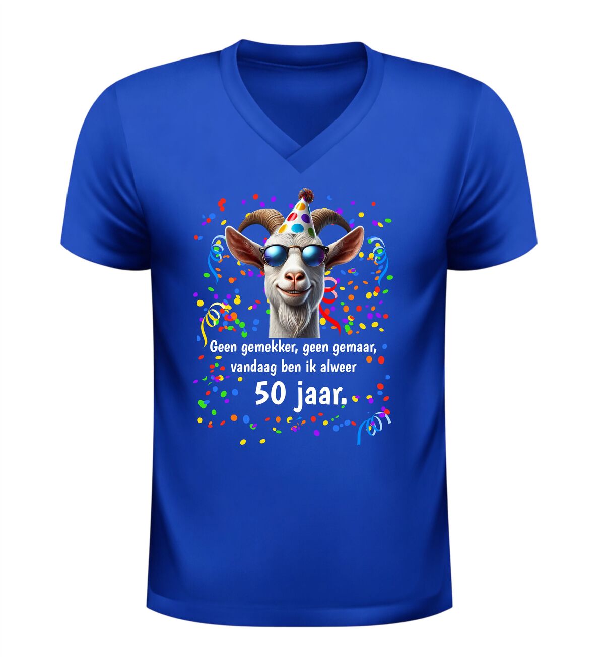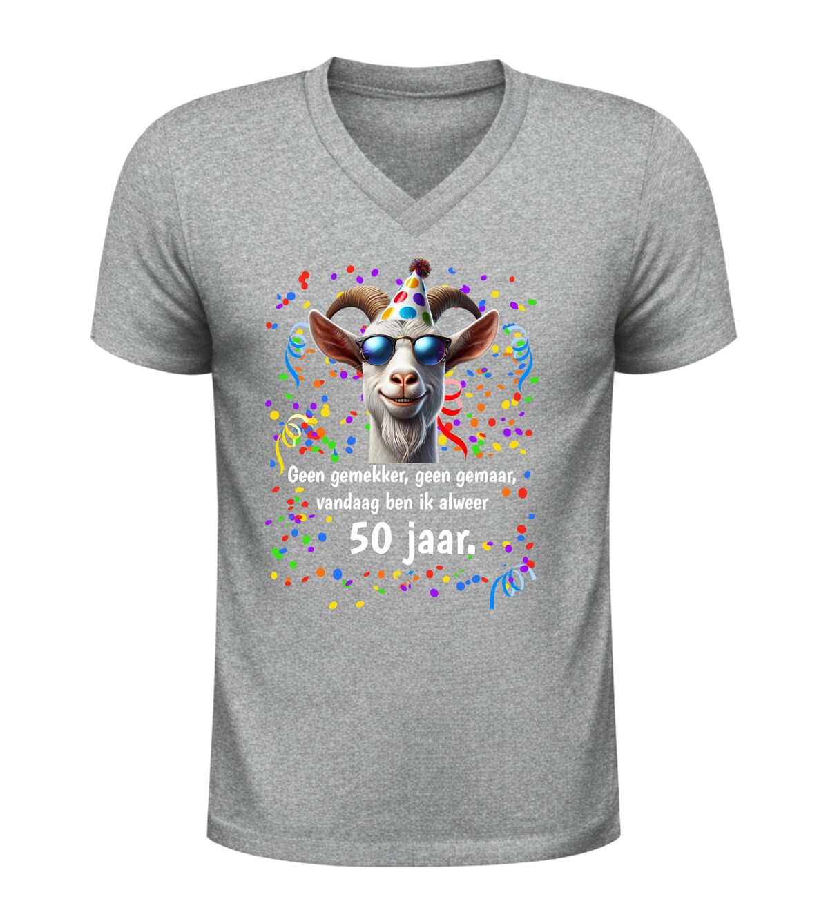 Dit V-hals 50 jaar verjaardag shirt met geit en tekst geen gemekker geen gemaar,vandaag ben ik al 50 jaar is hét perfecte shirt om het bereiken van Abraham of Sarah op een humoristische manier te vieren. Vijftig worden is een bijzondere mijlpaal en met dit shirt laat je zien dat dat vooral een reden is voor feest en gezelligheid.