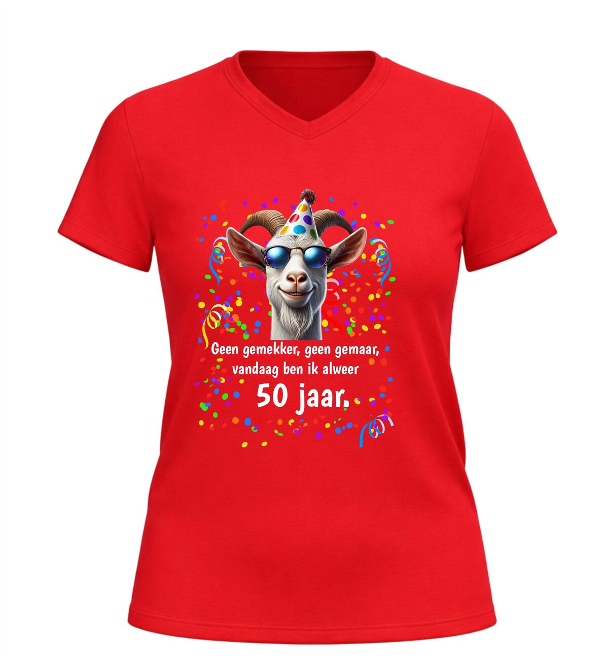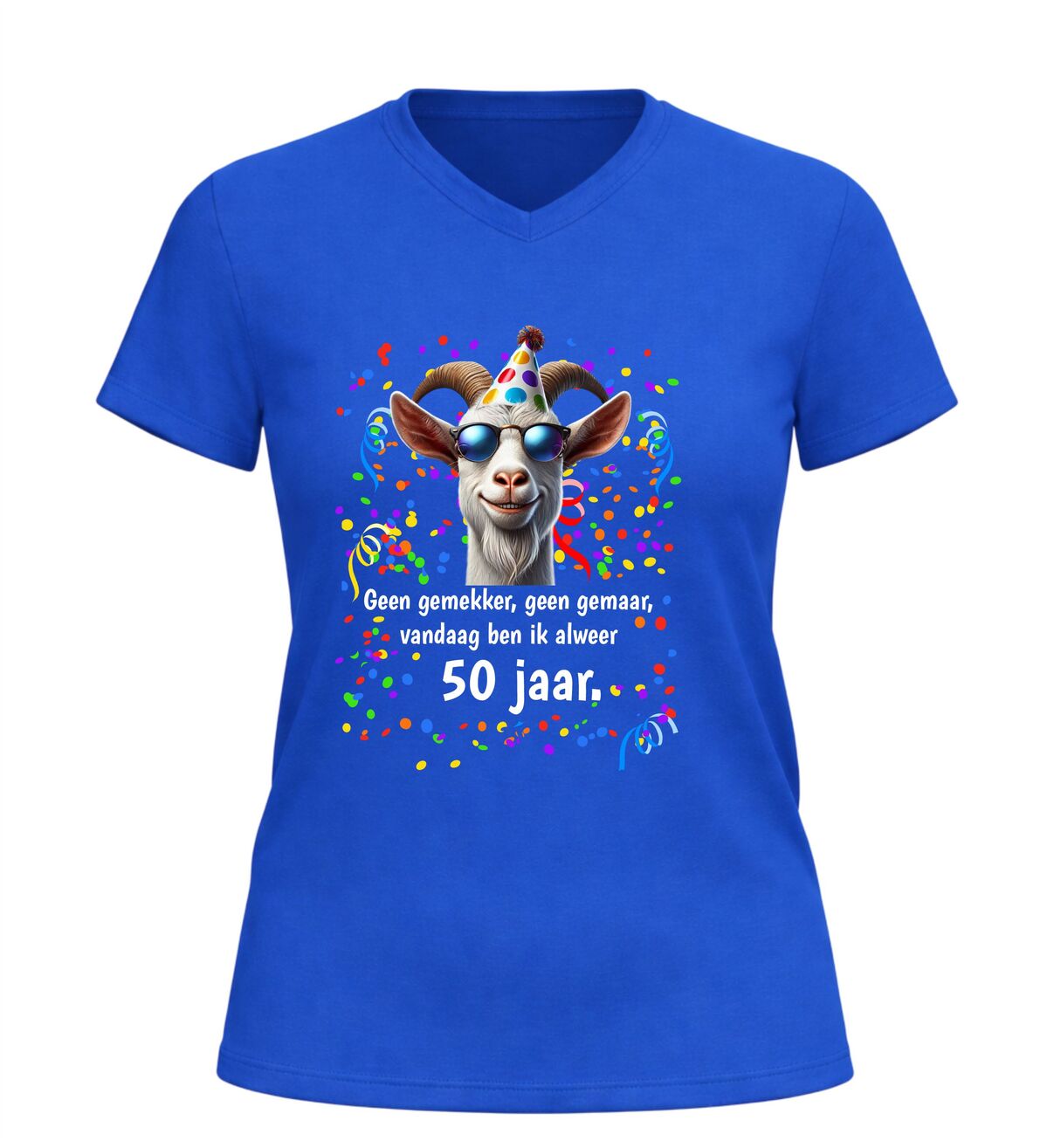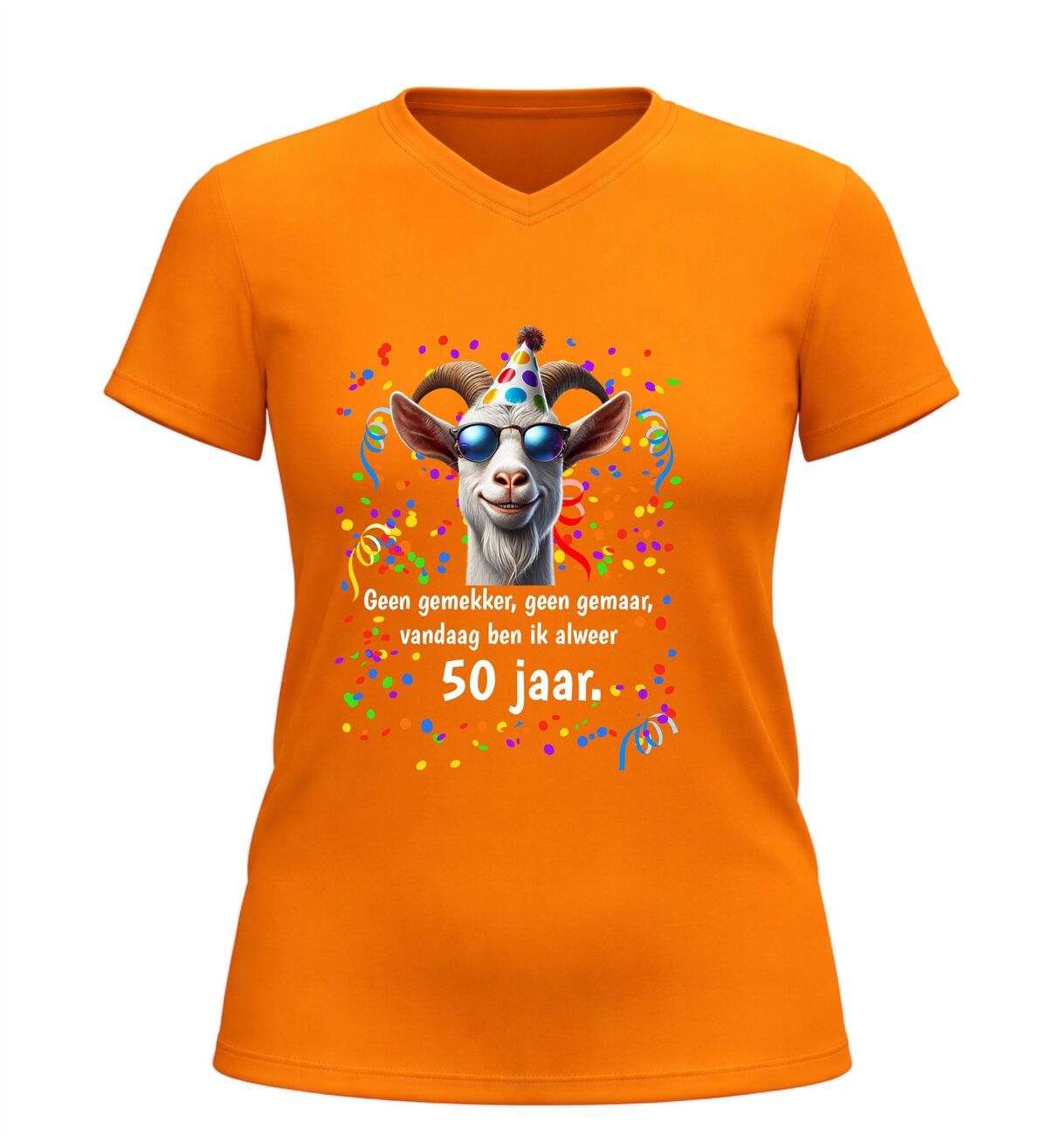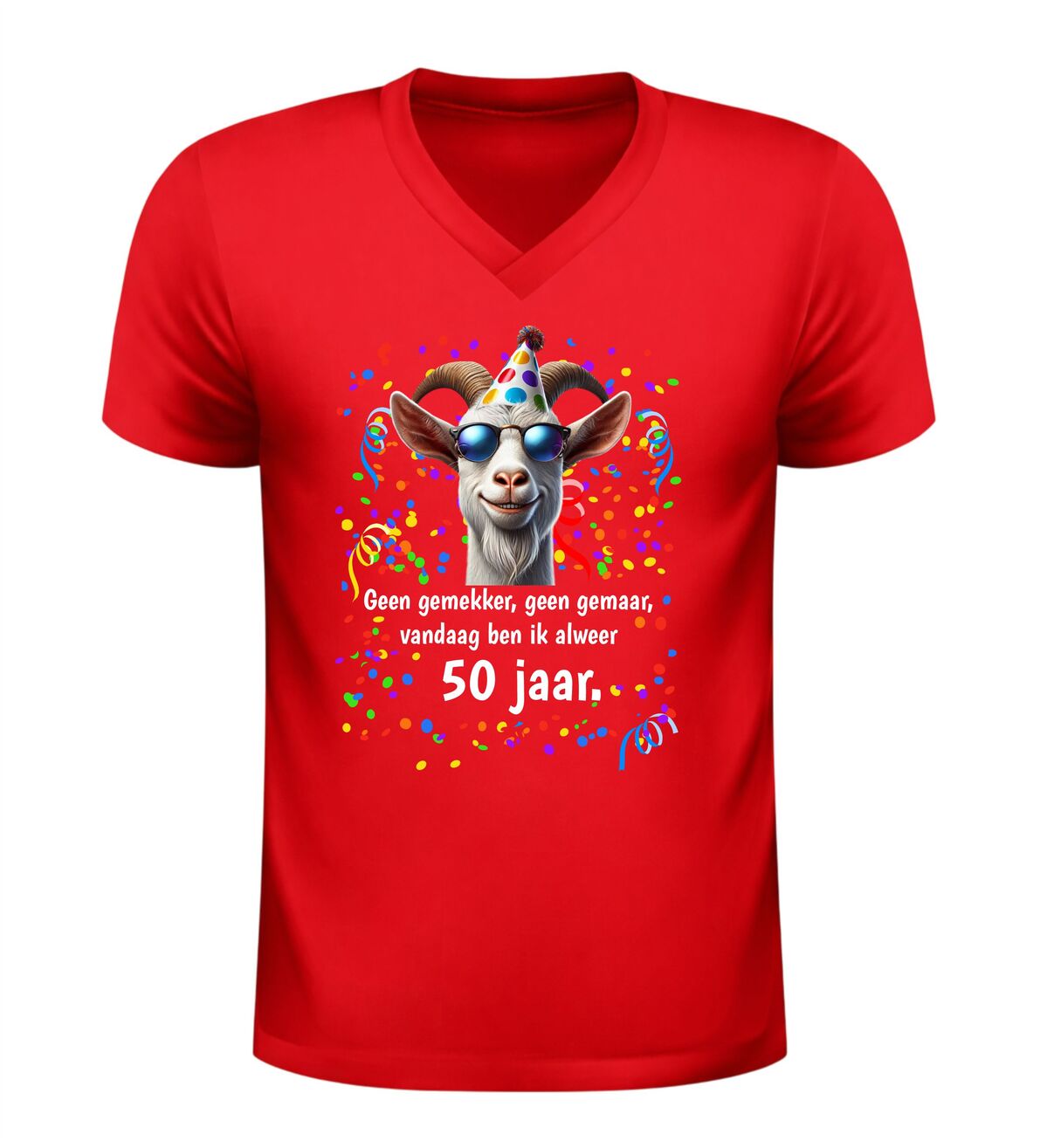 Dit V-hals 50 jaar verjaardag shirt met geit en tekst geen gemekker geen gemaar,vandaag ben ik al 50 jaar is hét perfecte shirt om het bereiken van Abraham of Sarah op een humoristische manier te vieren. Vijftig worden is een bijzondere mijlpaal en met dit shirt laat je zien dat dat vooral een reden is voor feest en gezelligheid.