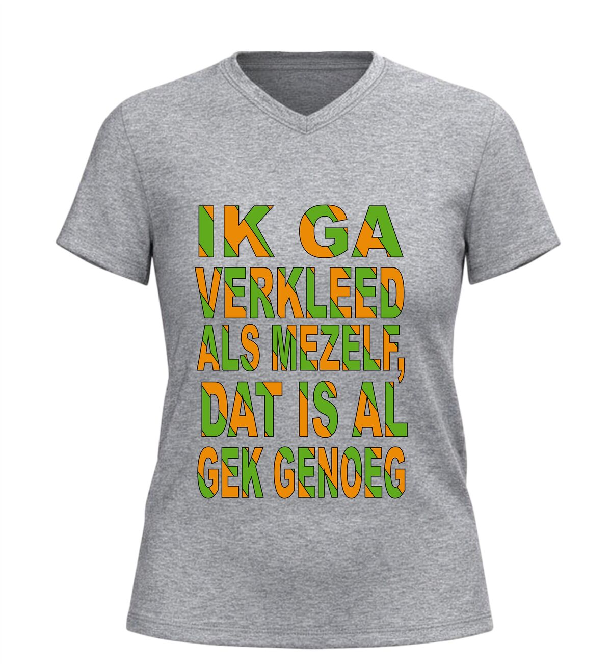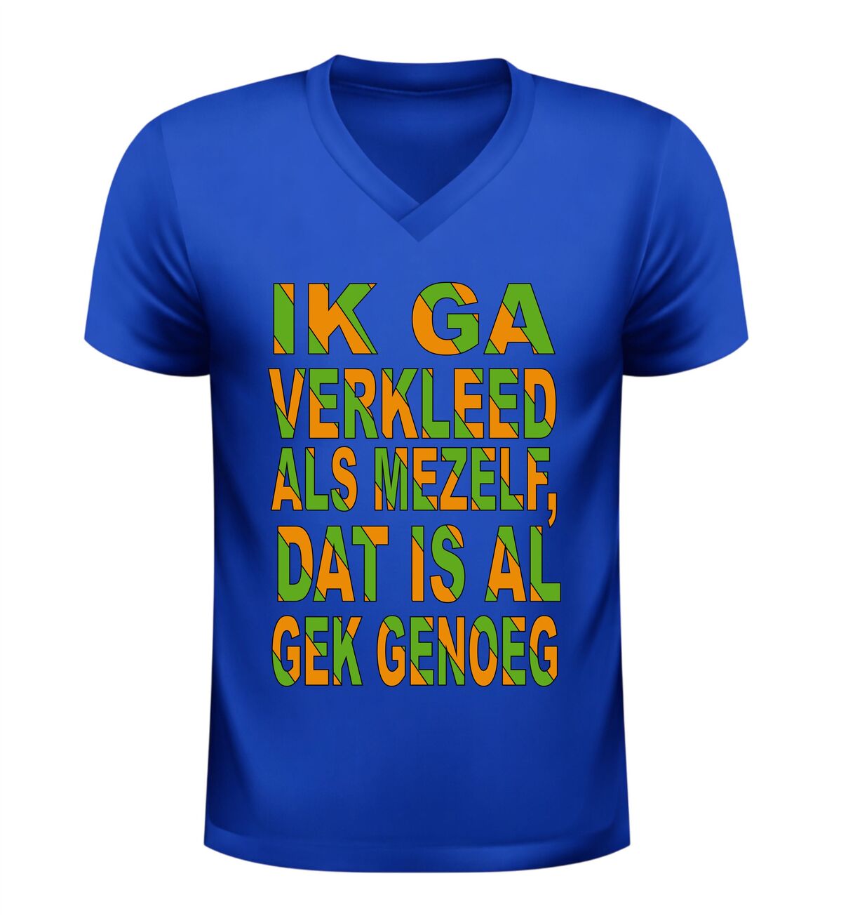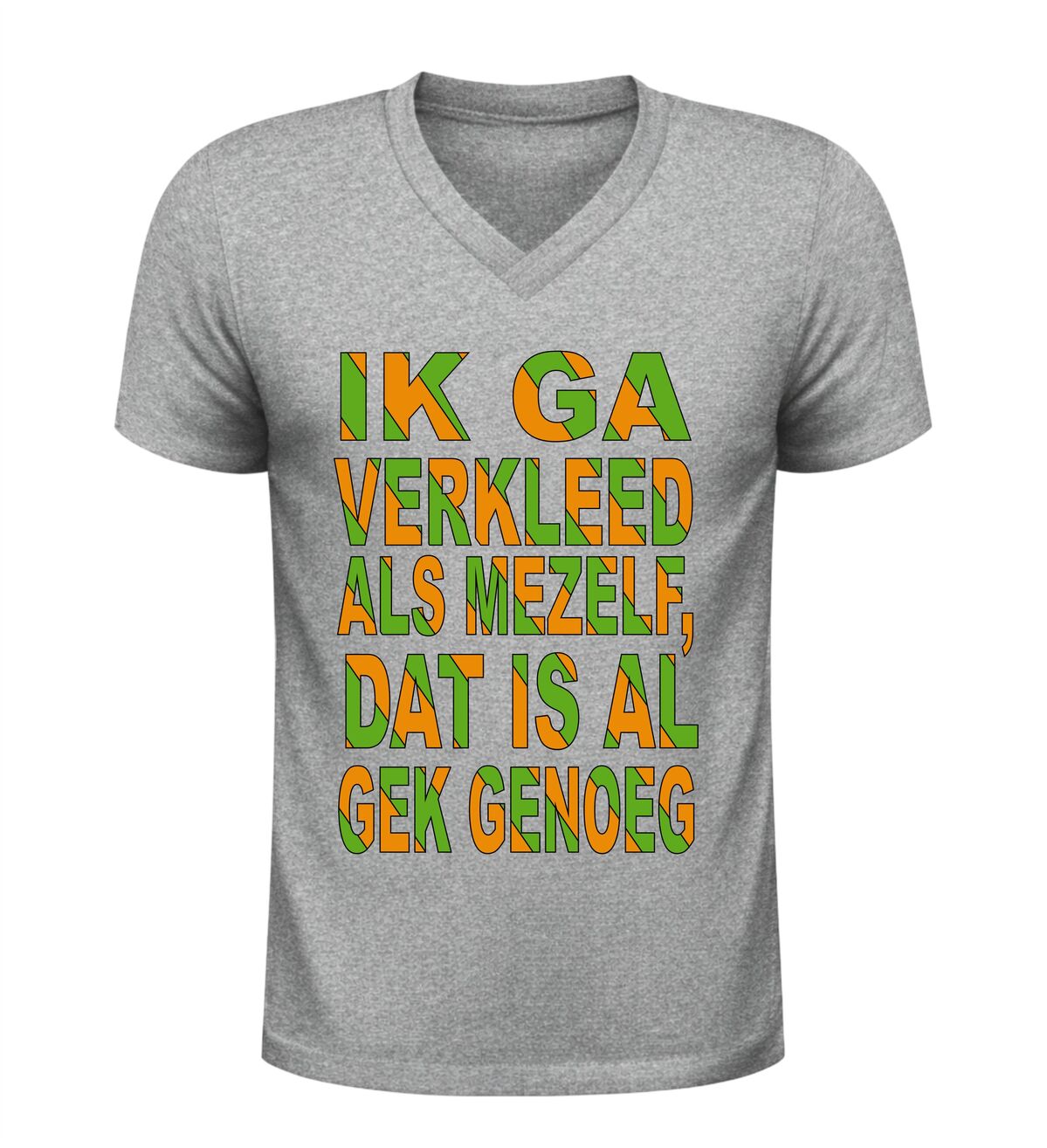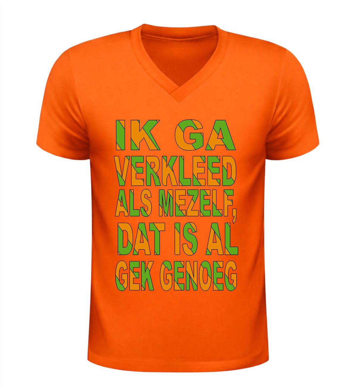 Dit v-hals carnavalsshirt is perfect voor iedereen die tijdens carnaval in Kruikenstad Tilburg wil laten zien dat verkleden soms helemaal niet nodig is. Met de herkenbare en humoristische tekst Ik ga verkleed als mezelf, dat is al gek genoeg sluit dit shirt naadloos aan bij de typische Tilburgse carnavalshumor. De kleuren groen en oranje maken direct duidelijk waar jouw carnavalshart ligt en zorgen ervoor dat je moeiteloos opgaat in de feestende menigte van Kruikenstad. De comfortabele V-hals pasvorm maakt het shirt ideaal om de hele dag en avond te dragen, of je nu in de stad staat te hossen, de kroeg induikt of de optocht volgt. Dit carnavals T-shirt is niet alleen een leuke eyecatcher, maar ook een populair item voor iedereen die zoekt naar een origineel Tilburg carnaval shirt, Kruikenstad kleding of een grappig carnavalsshirt met lokale knipoog.