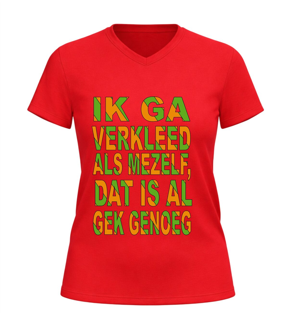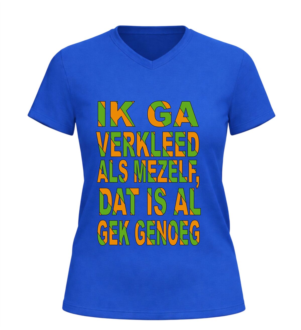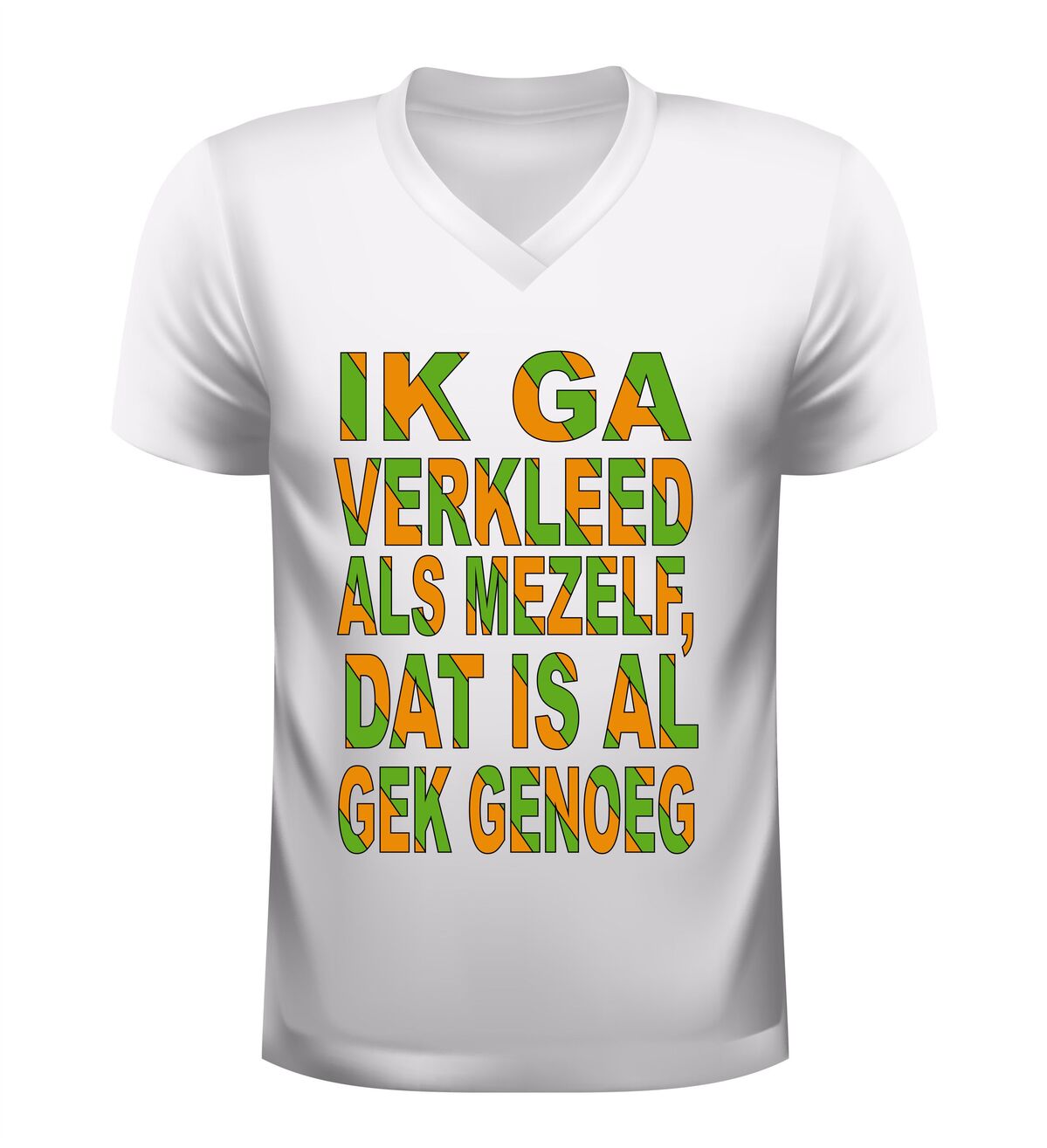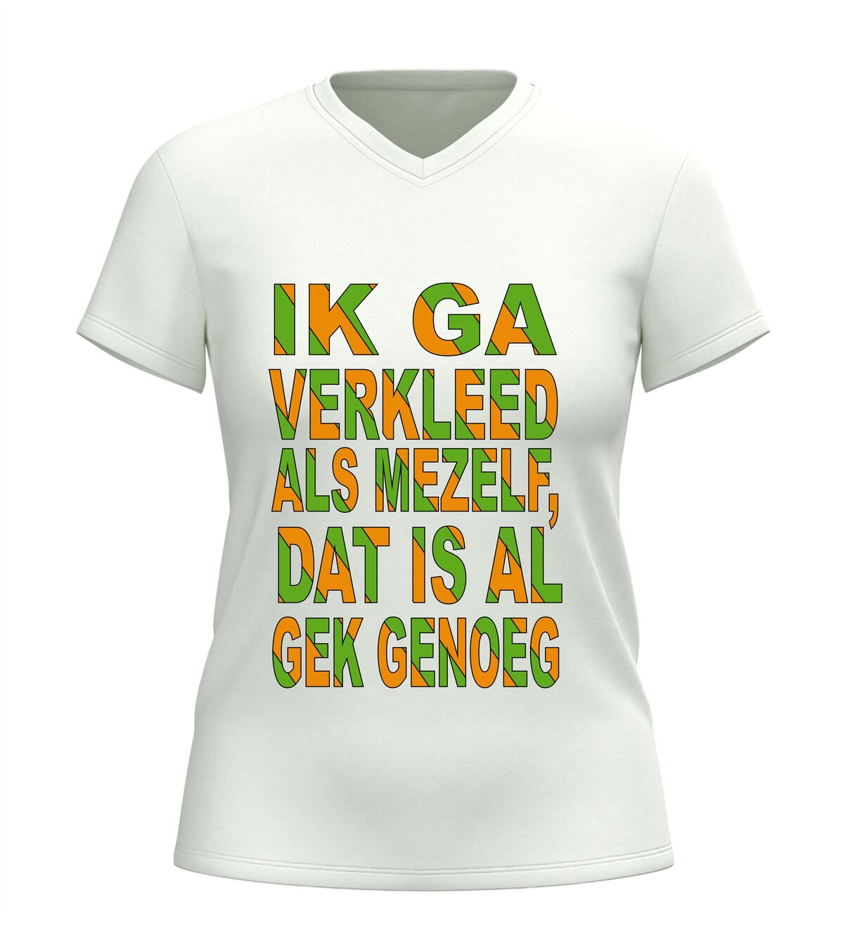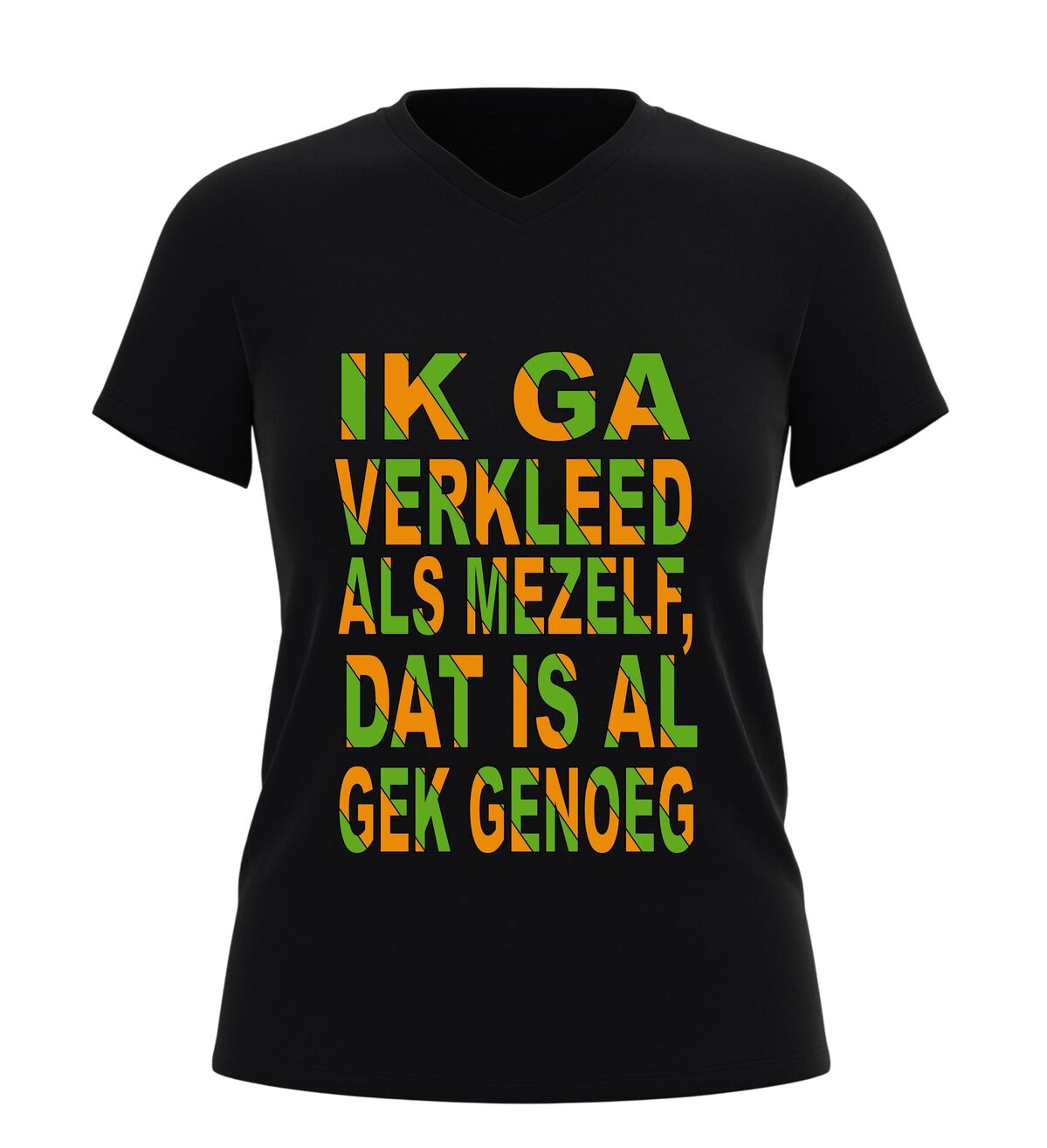 Dit v-hals carnavalsshirt is perfect voor iedereen die tijdens carnaval in Kruikenstad Tilburg wil laten zien dat verkleden soms helemaal niet nodig is. Met de herkenbare en humoristische tekst Ik ga verkleed als mezelf, dat is al gek genoeg sluit dit shirt naadloos aan bij de typische Tilburgse carnavalshumor. De kleuren groen en oranje maken direct duidelijk waar jouw carnavalshart ligt en zorgen ervoor dat je moeiteloos opgaat in de feestende menigte van Kruikenstad. De comfortabele V-hals pasvorm maakt het shirt ideaal om de hele dag en avond te dragen, of je nu in de stad staat te hossen, de kroeg induikt of de optocht volgt. Dit carnavals T-shirt is niet alleen een leuke eyecatcher, maar ook een populair item voor iedereen die zoekt naar een origineel Tilburg carnaval shirt, Kruikenstad kleding of een grappig carnavalsshirt met lokale knipoog.