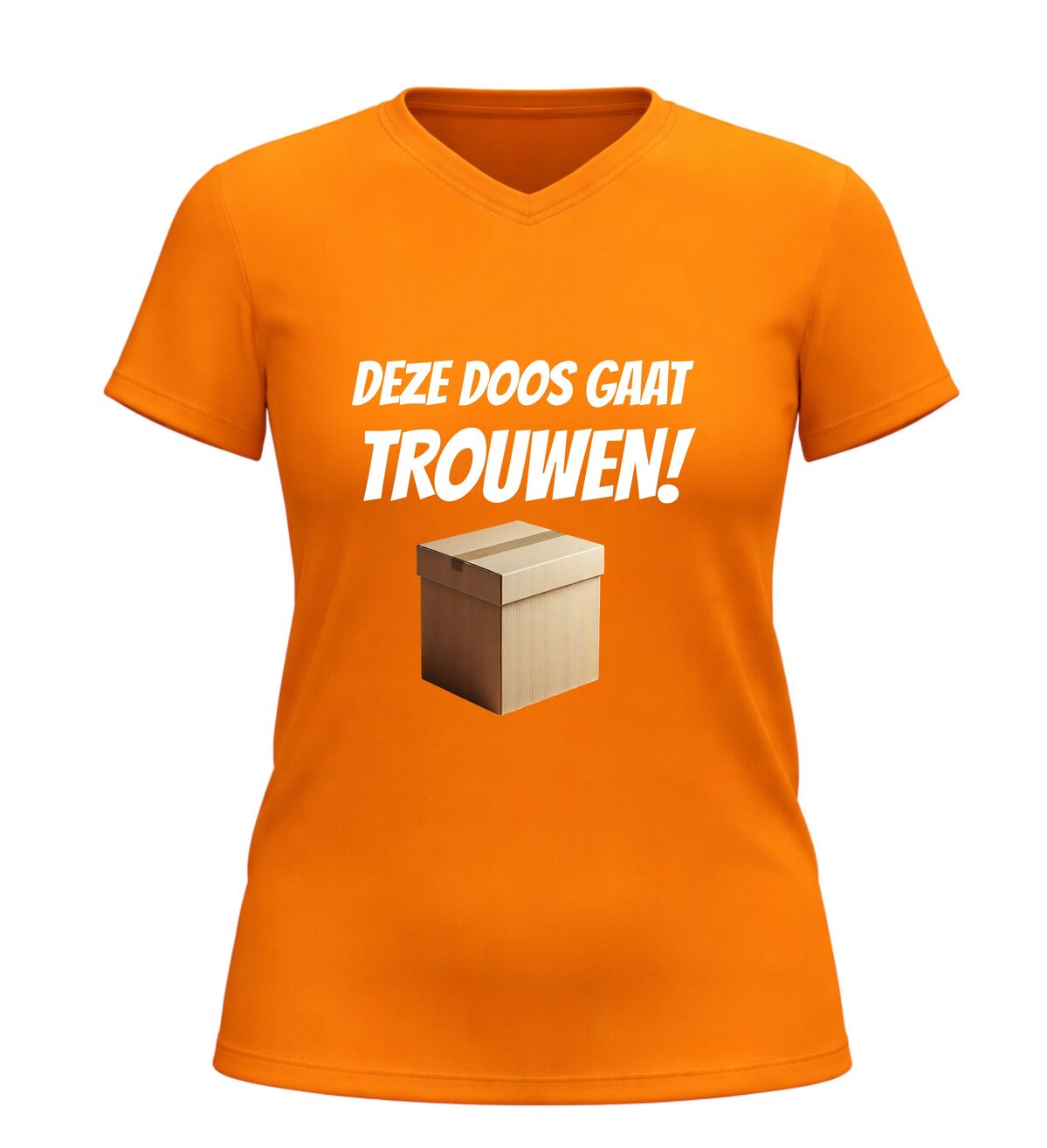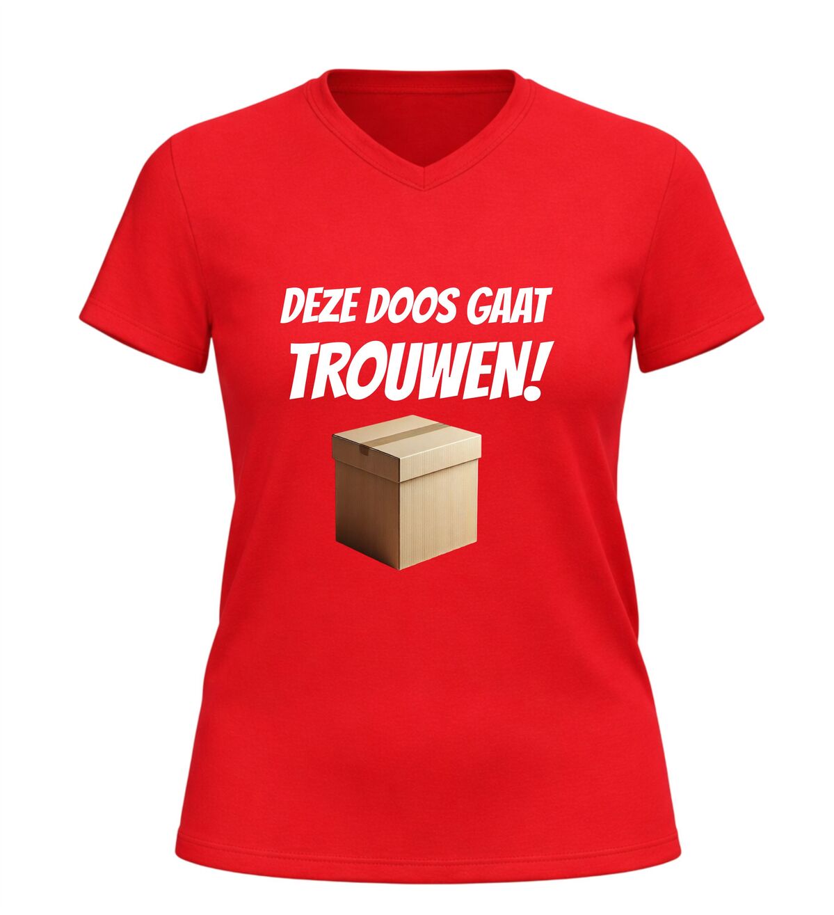 Dit V-hals dames shirt met de opvallende tekst deze doos gaat trouwen is dé perfecte blikvanger voor een vrijgezellenfeest. De speelse combinatie van de brutale tekst en de afbeelding van een doos zorgt direct voor hilariteit en aandacht. De woordgrap maakt dit shirt extra leuk: letterlijk een doos die gaat trouwen, maar natuurlijk bedoeld met een knipoog voor de aanstaande bruid. Ideaal voor een bride to be die wel van humor houdt en haar vrijgezellenfeest in stijl wil vieren.