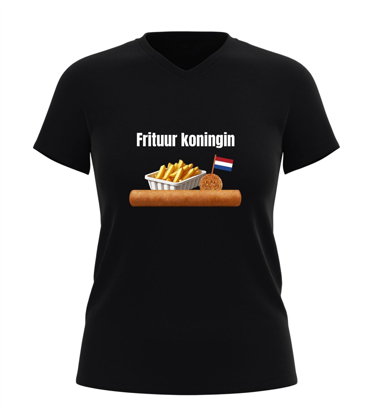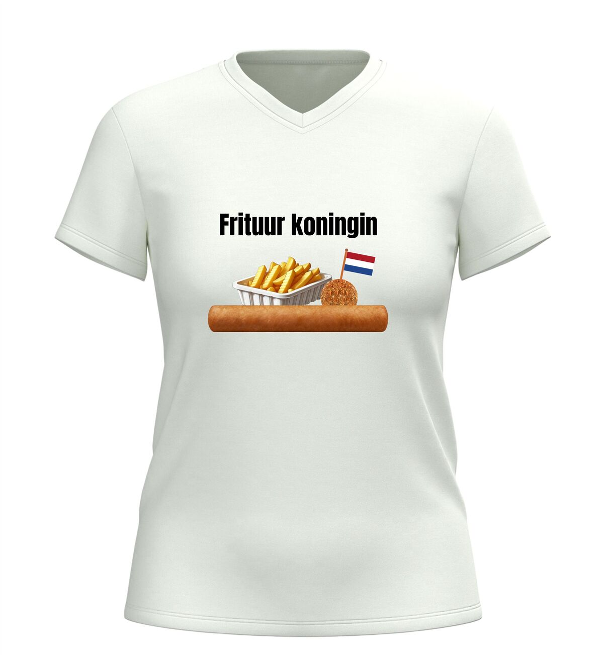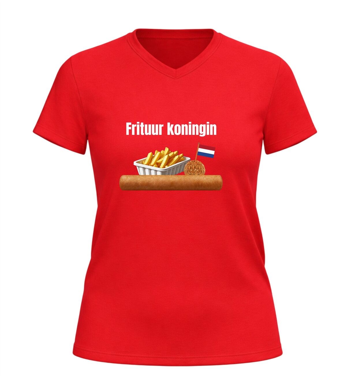 Dit V-hals dames T-shirt is een echte must-have voor iedereen die dol is op snacks en friet. Met de tekst Frituurkoningin en de herkenbare afbeeldingen van friet, een frikandel en een bitterbal laat je meteen zien waar jouw hart ligt: bij de snackbar. Dit shirt is perfect voor snackliefhebbers die hun passie met trots willen dragen, of je nu op een feestje bent, carnaval viert of gewoon zin hebt in iets grappigs en herkenbaars.