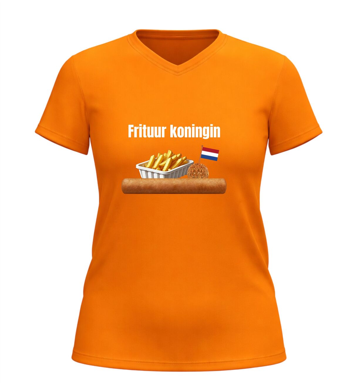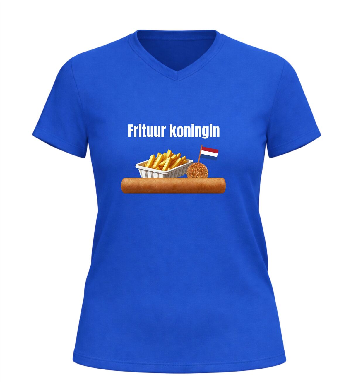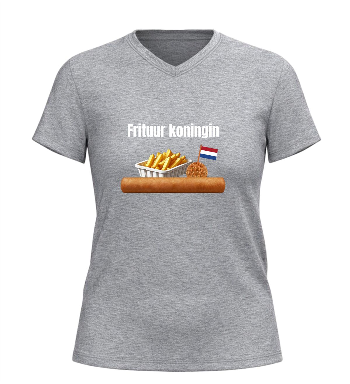 Dit V-hals dames T-shirt is een echte must-have voor iedereen die dol is op snacks en friet. Met de tekst Frituurkoningin en de herkenbare afbeeldingen van friet, een frikandel en een bitterbal laat je meteen zien waar jouw hart ligt: bij de snackbar. Dit shirt is perfect voor snackliefhebbers die hun passie met trots willen dragen, of je nu op een feestje bent, carnaval viert of gewoon zin hebt in iets grappigs en herkenbaars.