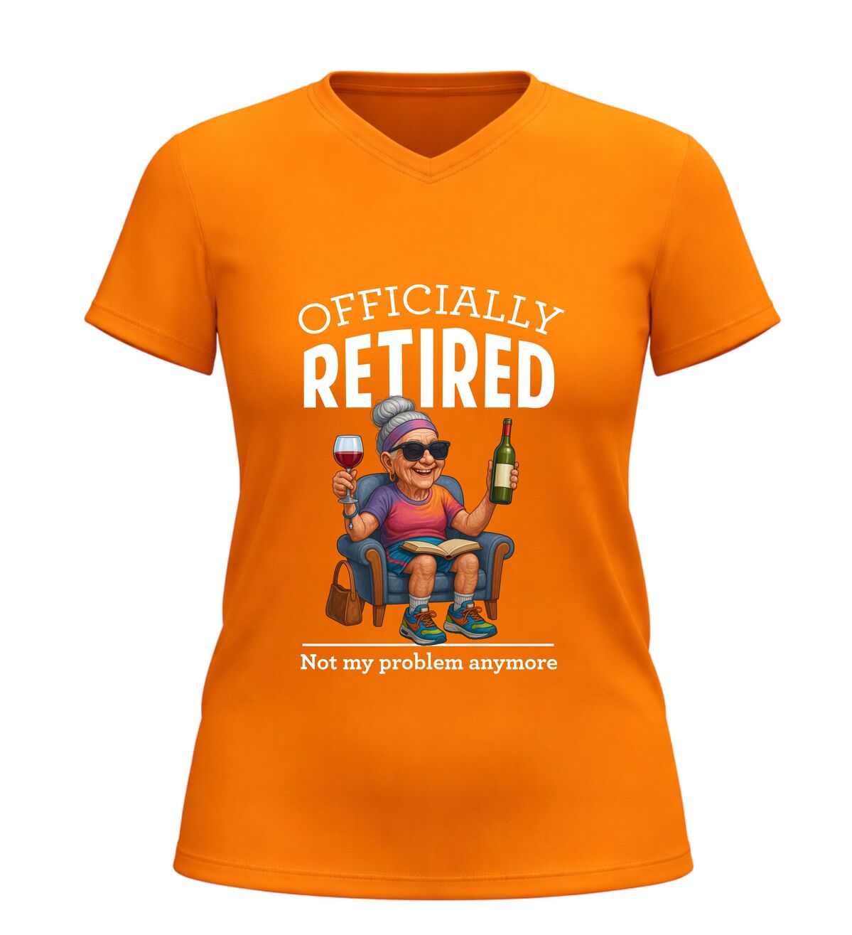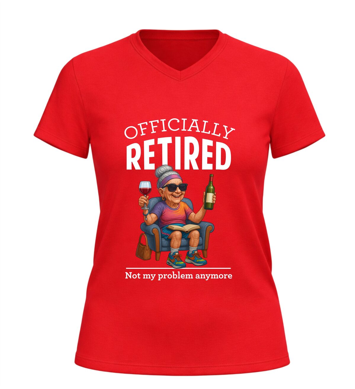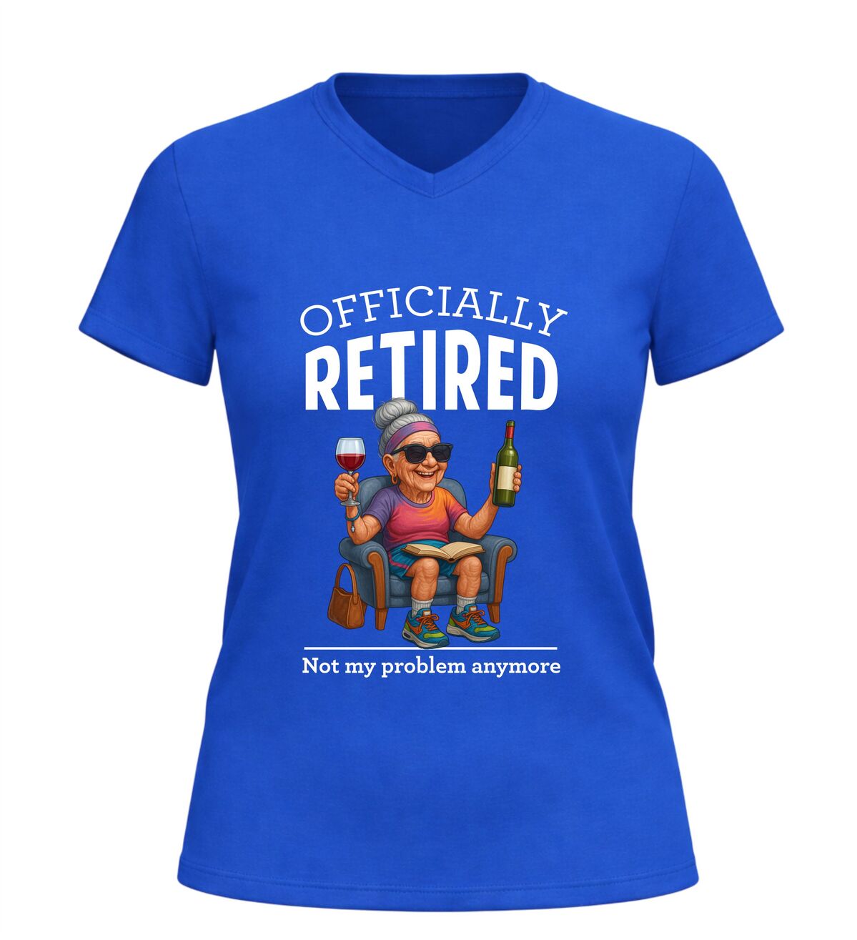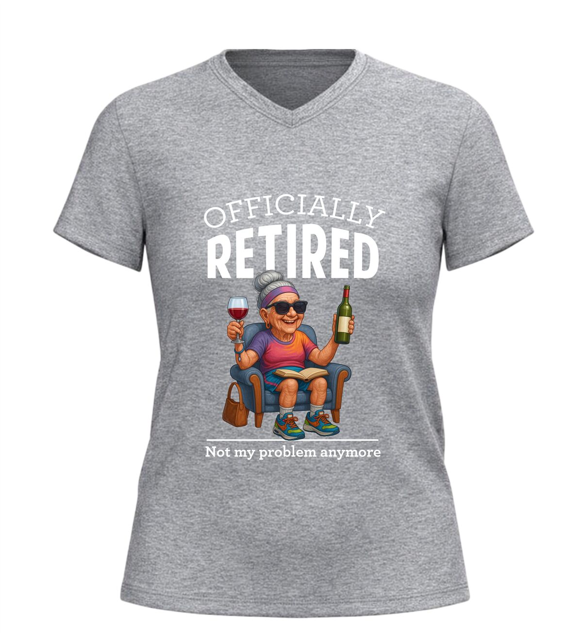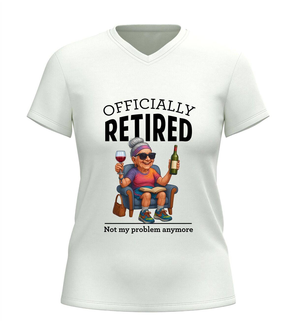 Vier het pensioen op een ontspannen en stijlvolle manier met dit V-hals dames T-shirt met de tekst officially retired not my problem. De speelse illustratie van een relaxte dame in een stoel met een fles wijn en een glas in de hand laat precies zien waar pensioen om draait: genieten van vrijheid, rust en een welverdiend moment voor jezelf. Dit grappige pensioen shirt is perfect voor vrouwen die met trots hun nieuwe levensfase omarmen.