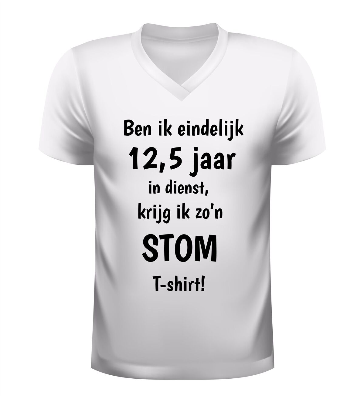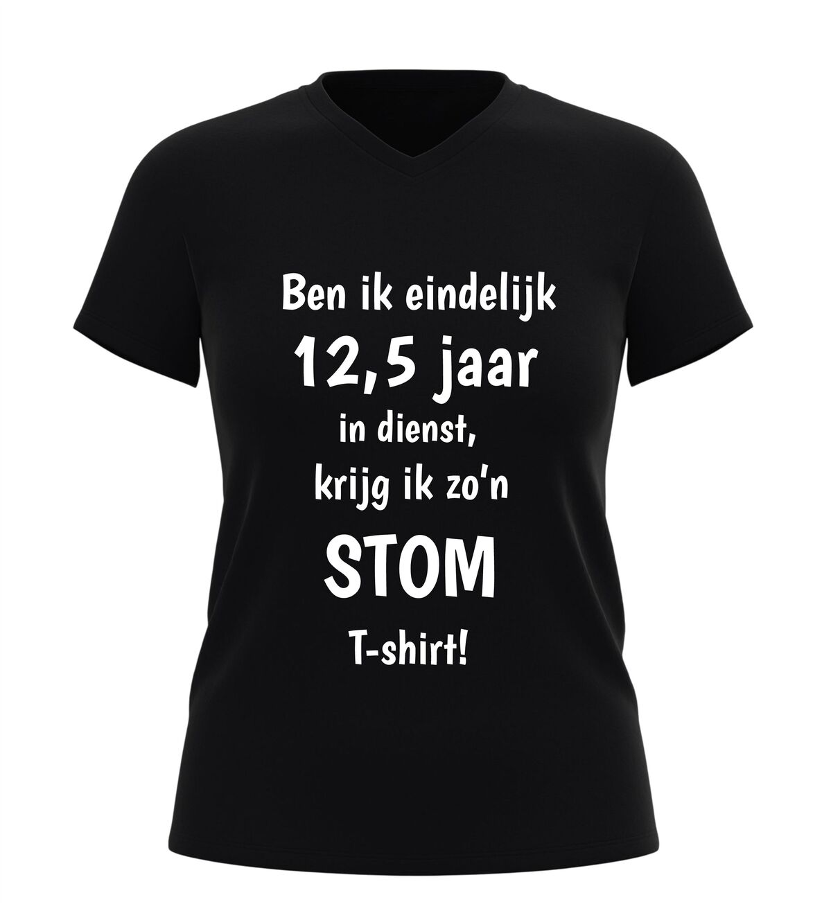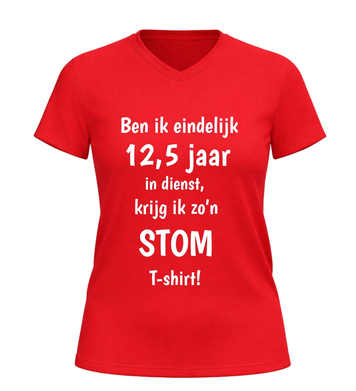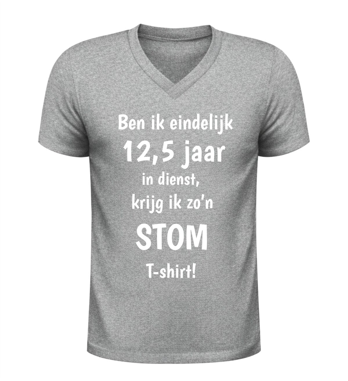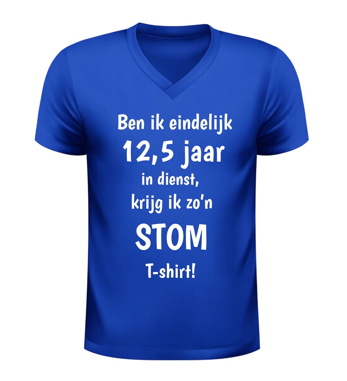 Dit V-hals shirt met de tekst ben ik eindelijk 12,5 jaar in dienst, krijg ik zo’n stom shirtis het perfecte cadeau voor een werkjubileum met een flinke dosis humor. Het shirt is gemaakt van comfortabel en ademend materiaal en heeft een moderne V-hals die prettig draagt tijdens werk, vrije tijd of een jubileumfeest. Dankzij de zachte stof en fijne pasvorm is dit jubileum T-shirt geschikt voor dagelijks gebruik en langdurig draagcomfort. De grappige opdruk maakt het shirt ideaal als origineel cadeau voor een collega, werknemer of vriend die 12,5 jaar in dienst is en daar met een knipoog aandacht aan wil geven. Dit V-hals jubileumshirt is perfect voor een 12,5-jarig dienstverband, personeelsfeest of als ludiek bedankje van werkgever of team.