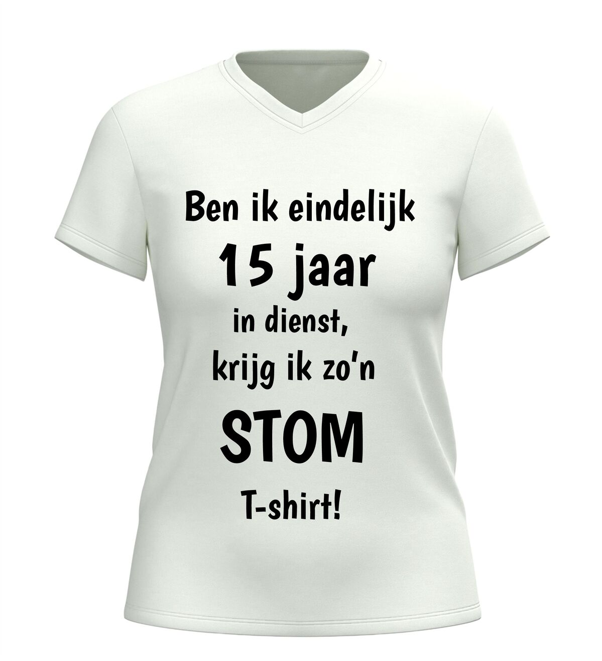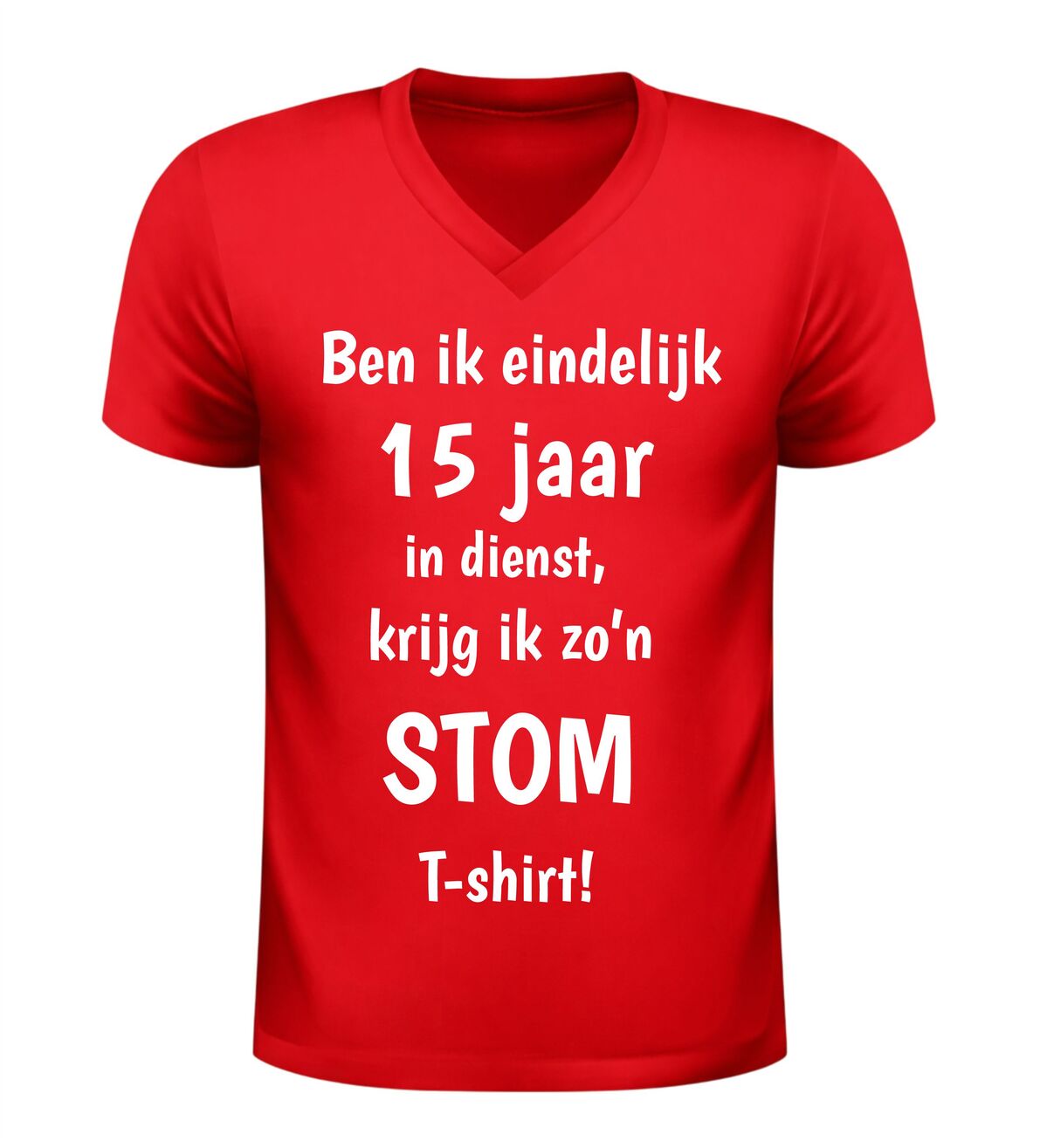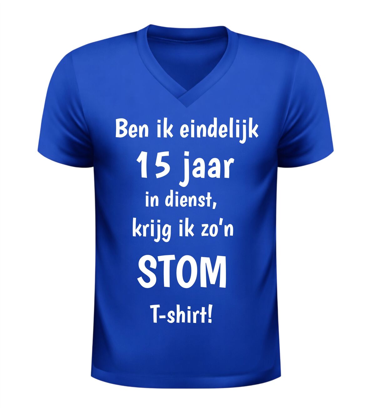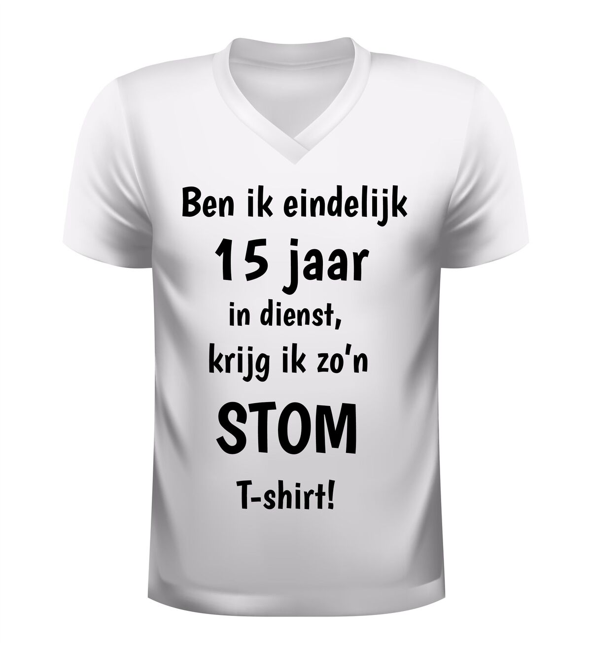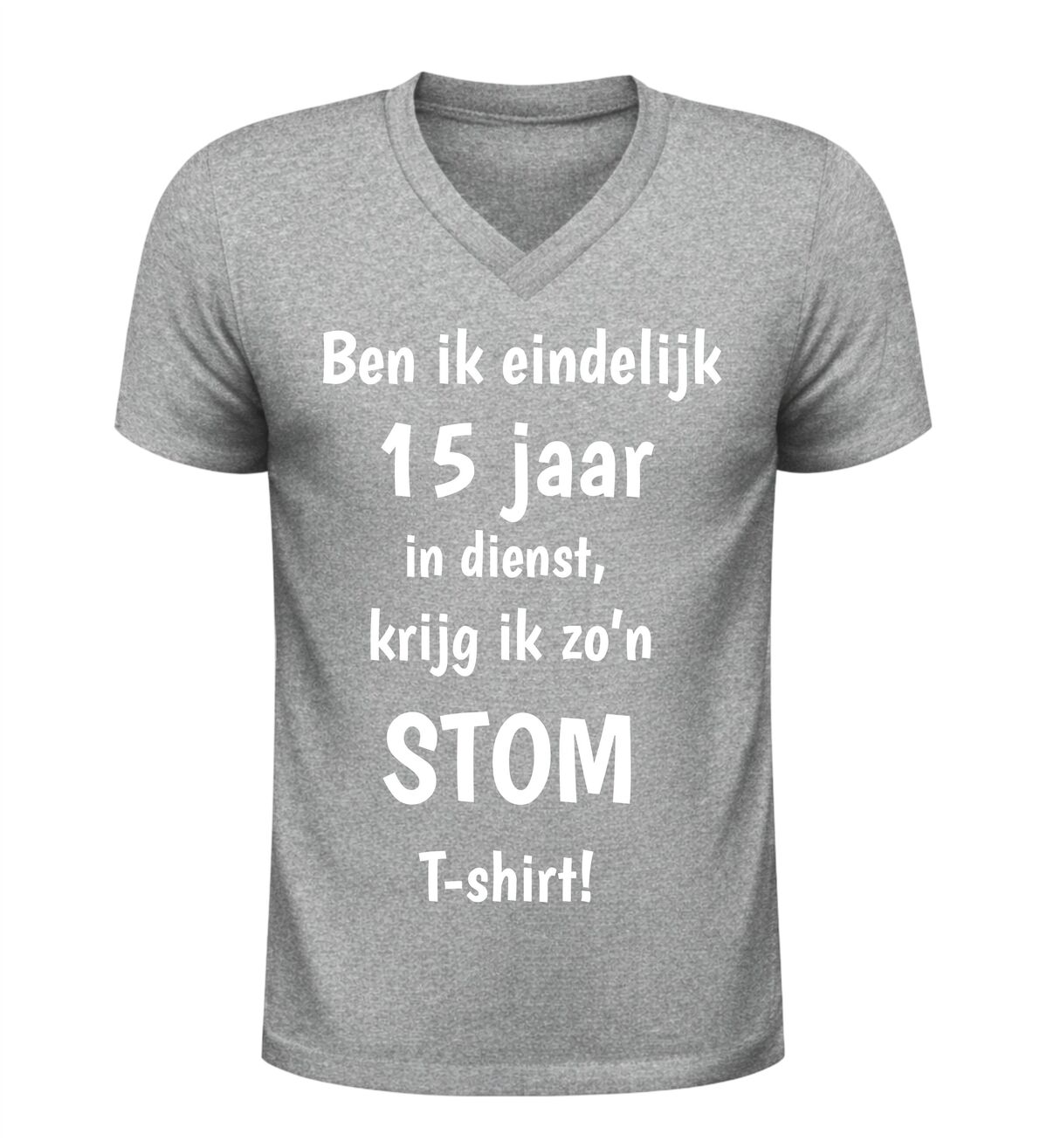 Vier een werkjubileum met een flinke dosis humor met dit grappige V-hals shirt met de tekst ben ik eindelijk 15 jaar in dienst, krijg ik zo’n stom shirt. Dit originele 15 jaar jubileum T-shirt is perfect voor collega’s die hun lange dienstverband op een ludieke manier willen vieren. De humoristische tekst maakt het shirt een echte blikvanger tijdens een jubileumfeest, borrel of bedrijfsuitje.