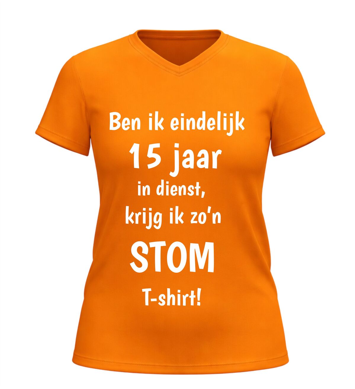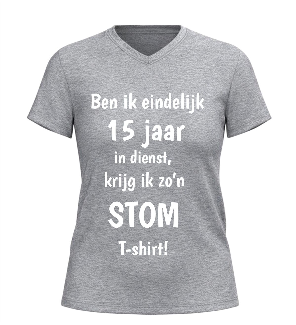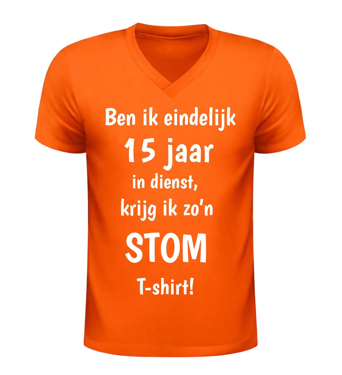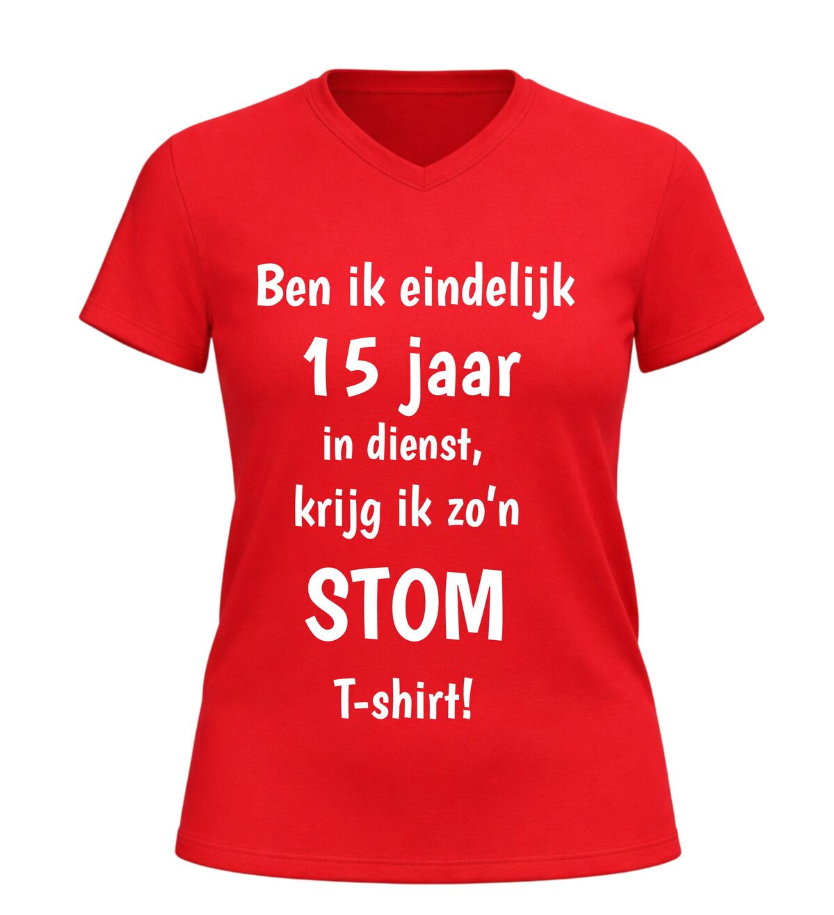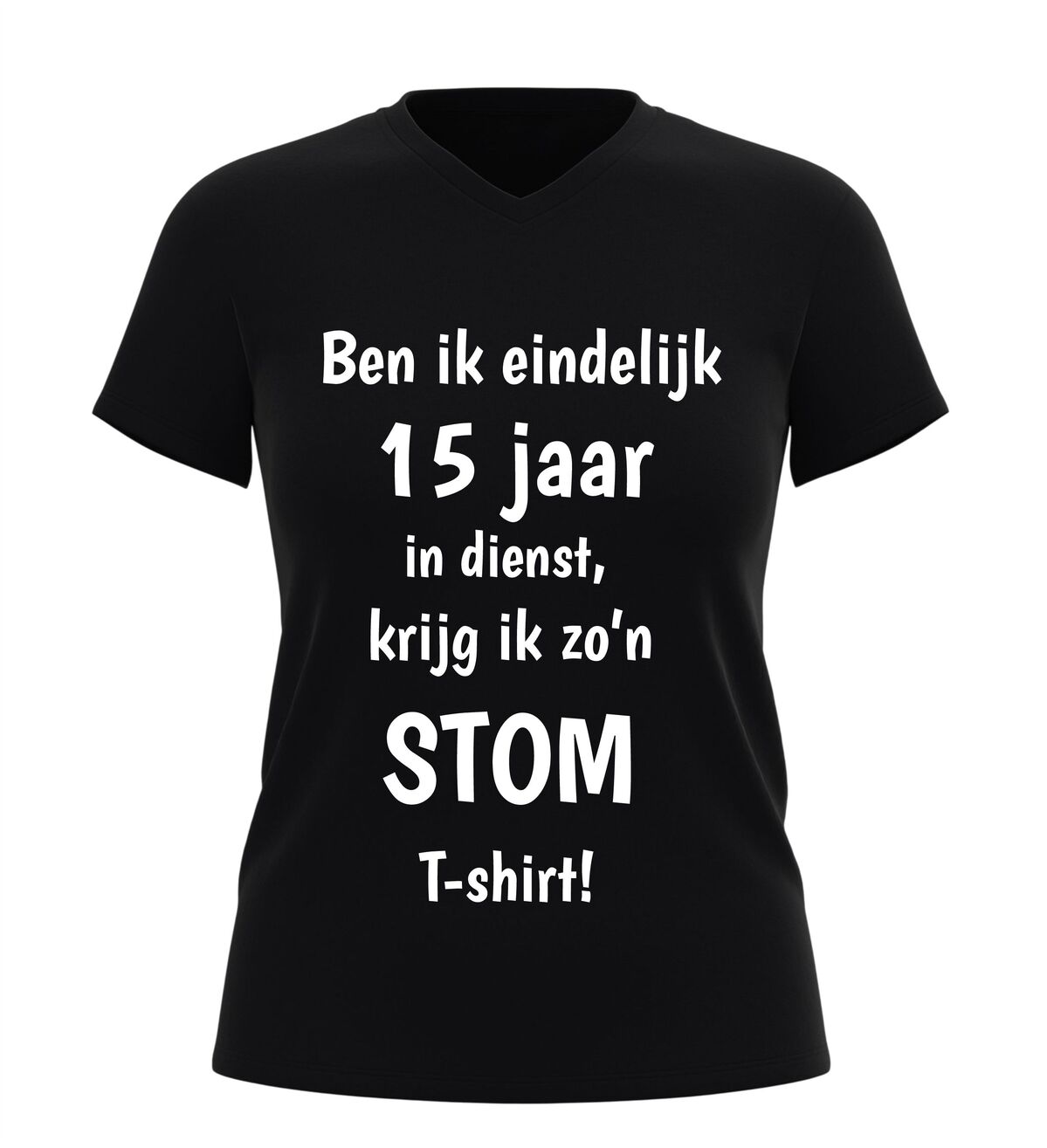Vier een werkjubileum met een flinke dosis humor met dit grappige V-hals shirt met de tekst ben ik eindelijk 15 jaar in dienst, krijg ik zo’n stom shirt. Dit originele 15 jaar jubileum T-shirt is perfect voor collega’s die hun lange dienstverband op een ludieke manier willen vieren. De humoristische tekst maakt het shirt een echte blikvanger tijdens een jubileumfeest, borrel of bedrijfsuitje.