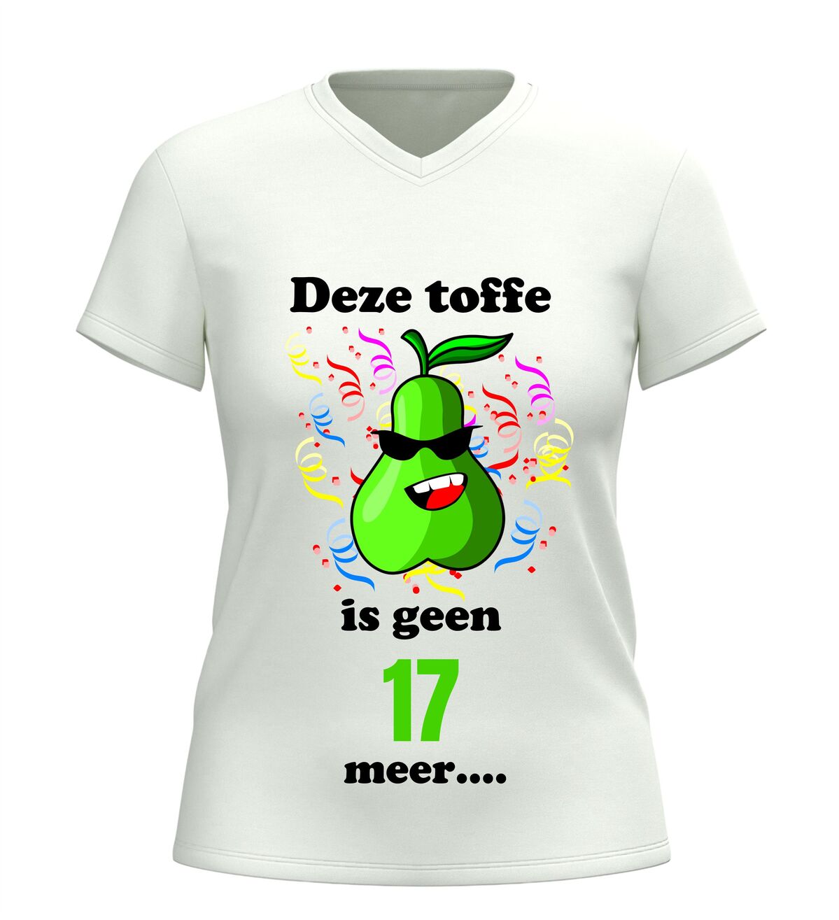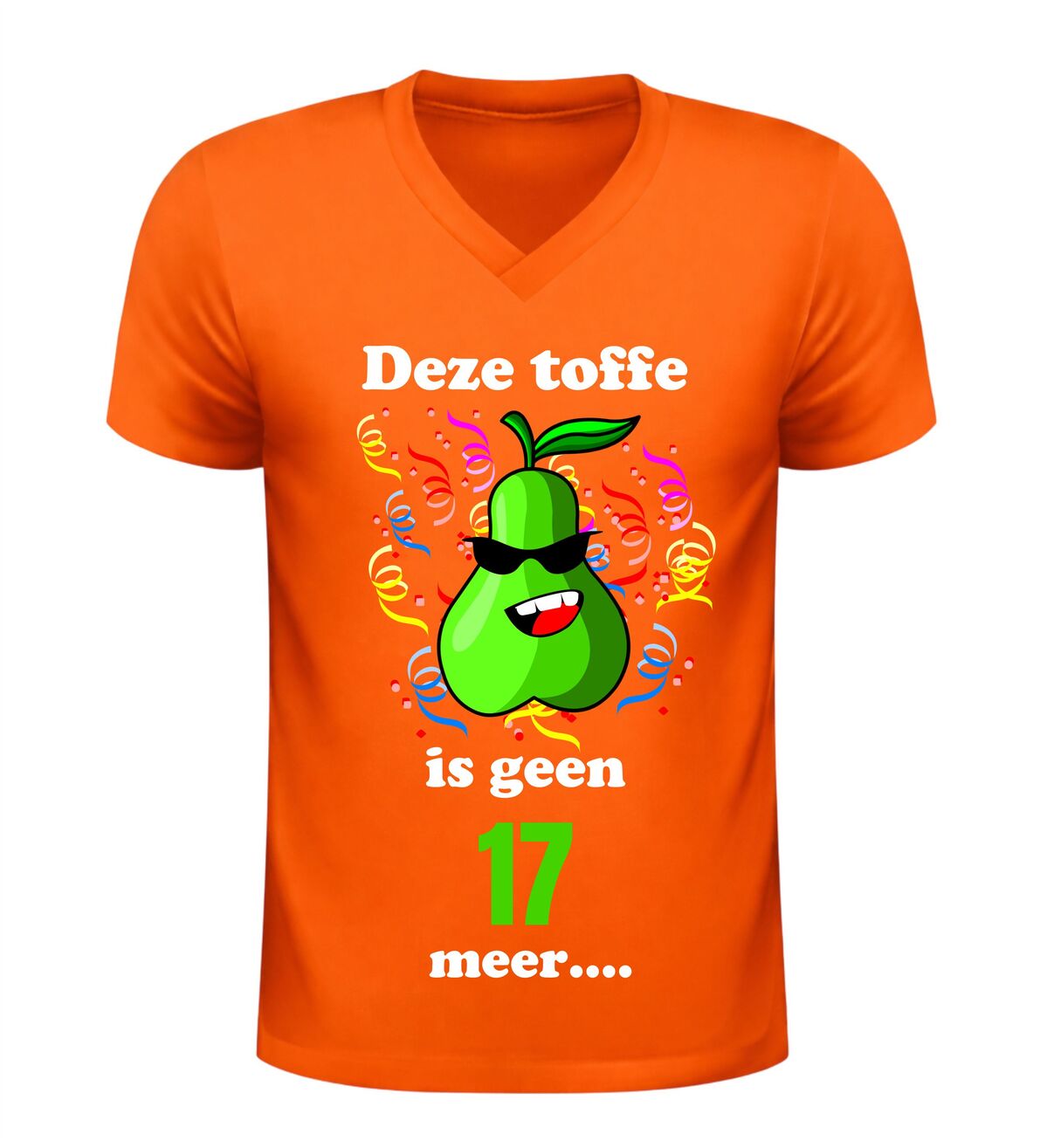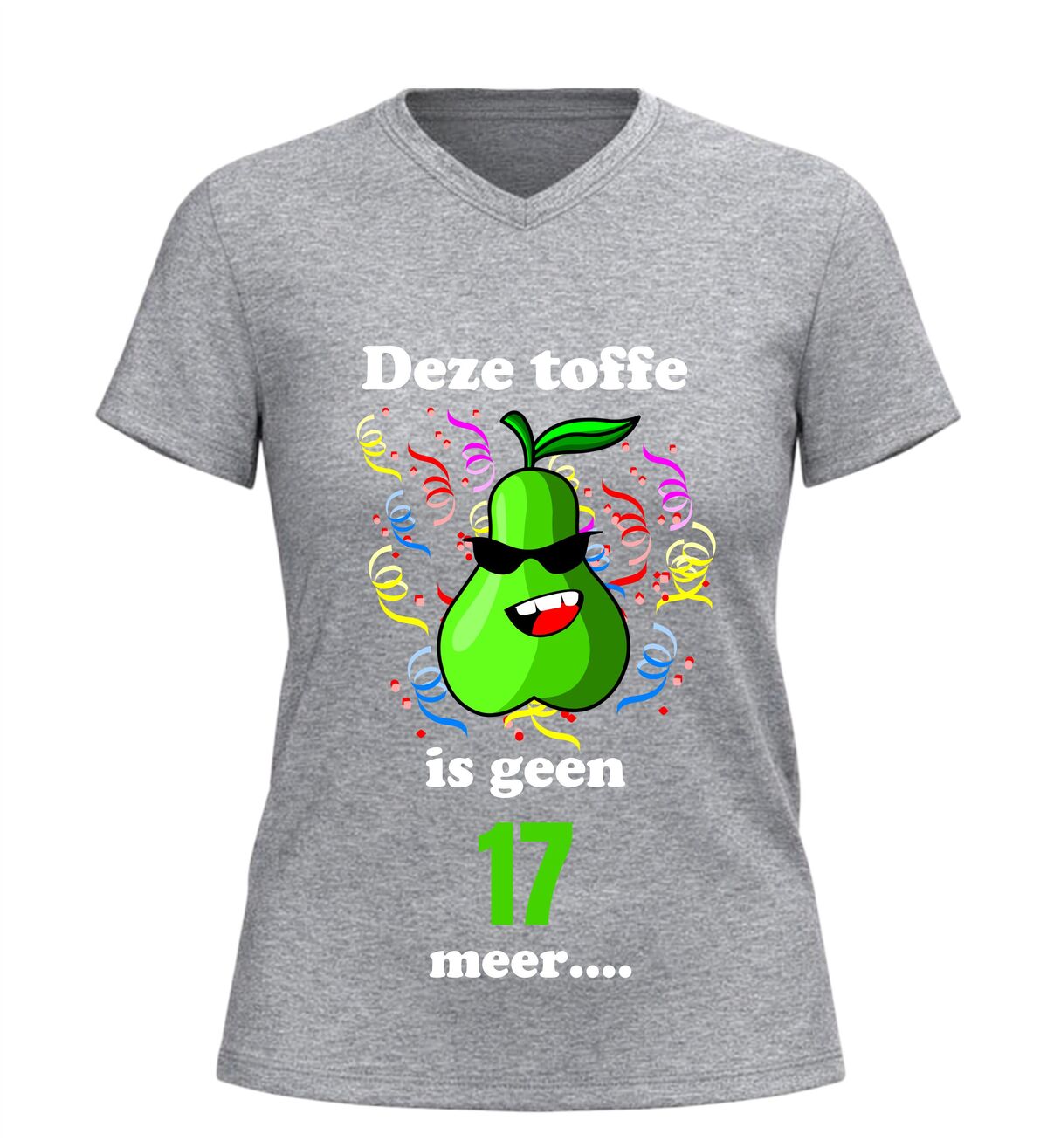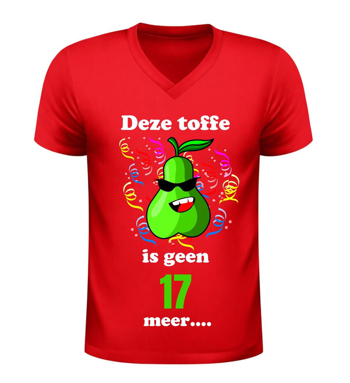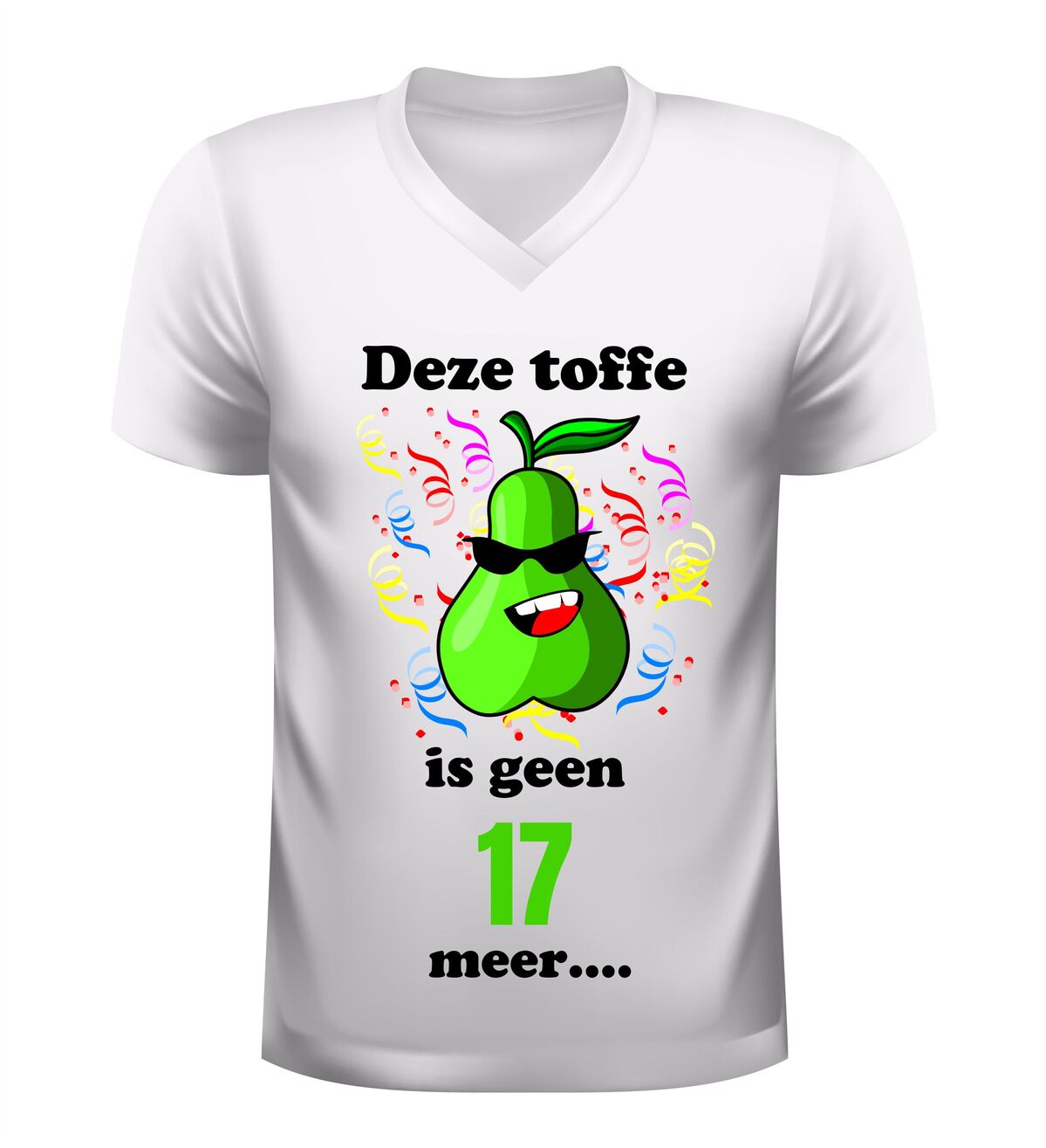 Vier de 18e verjaardag in stijl met dit grappige v-hals shirt met de tekst deze toffe peer is geen 17 meer en een leuke afbeelding van een toffe peer. Dit originele verjaardag T-shirt is perfect voor iedereen die eindelijk 18 jaar wordt en dit bijzondere moment met humor wil vieren. De speelse woordgrap maakt het shirt ideaal voor een feest, verjaardagspartij of als opvallende outfit tijdens de grote dag.