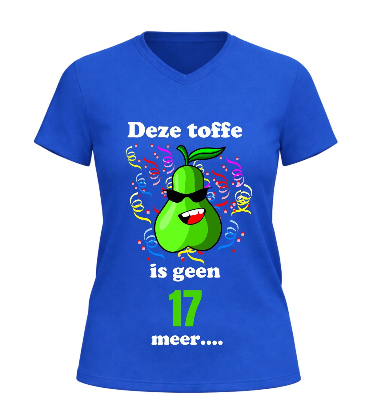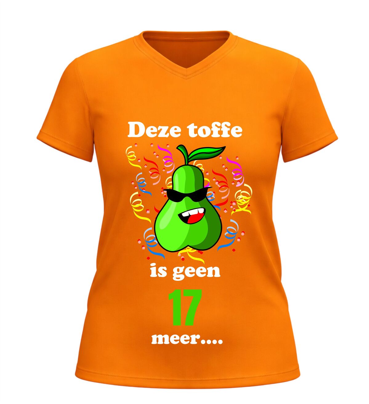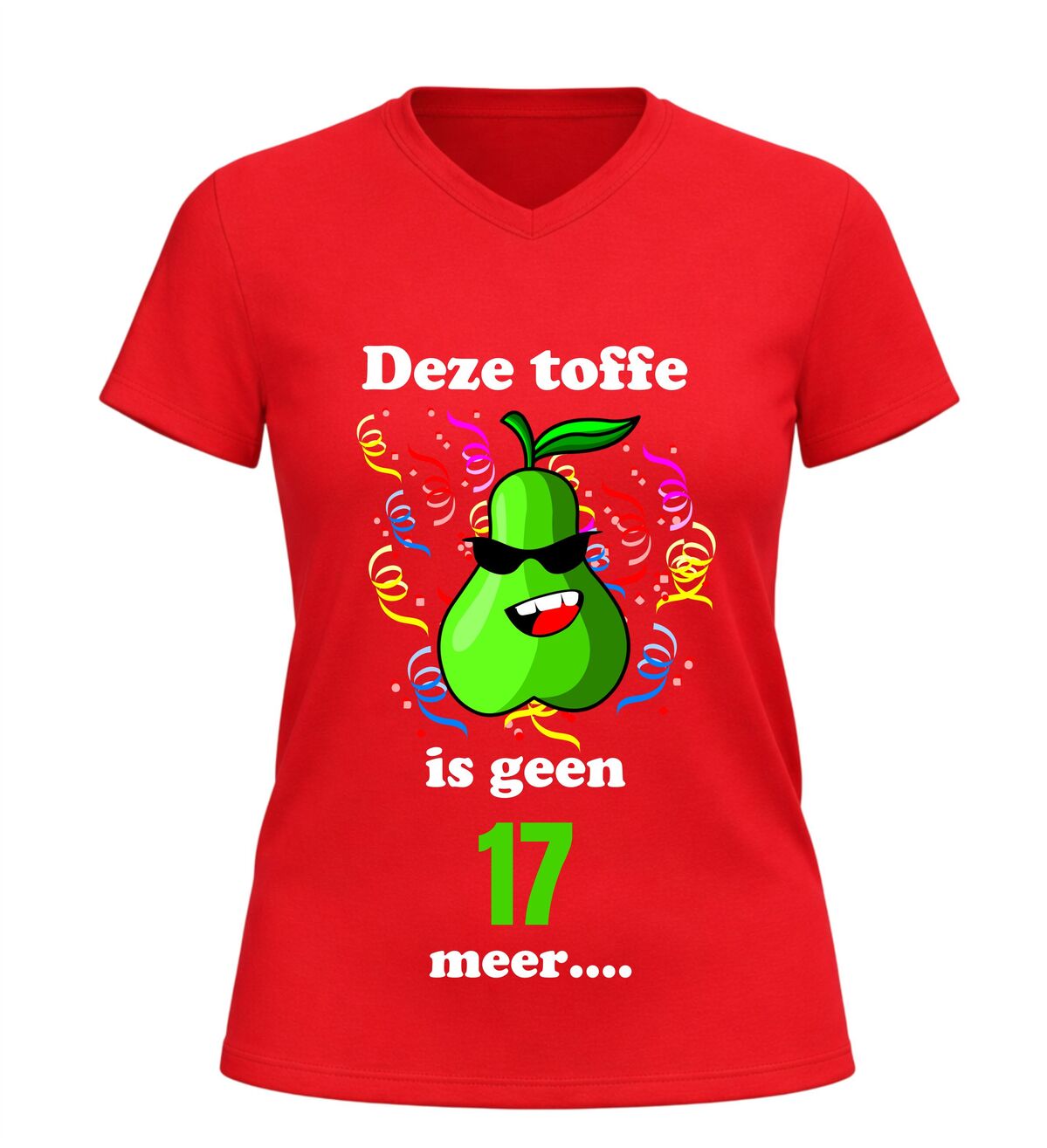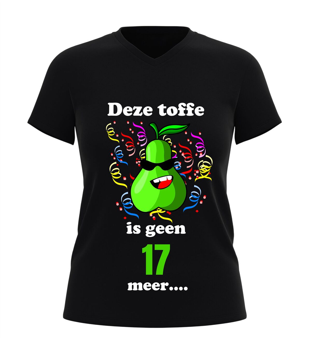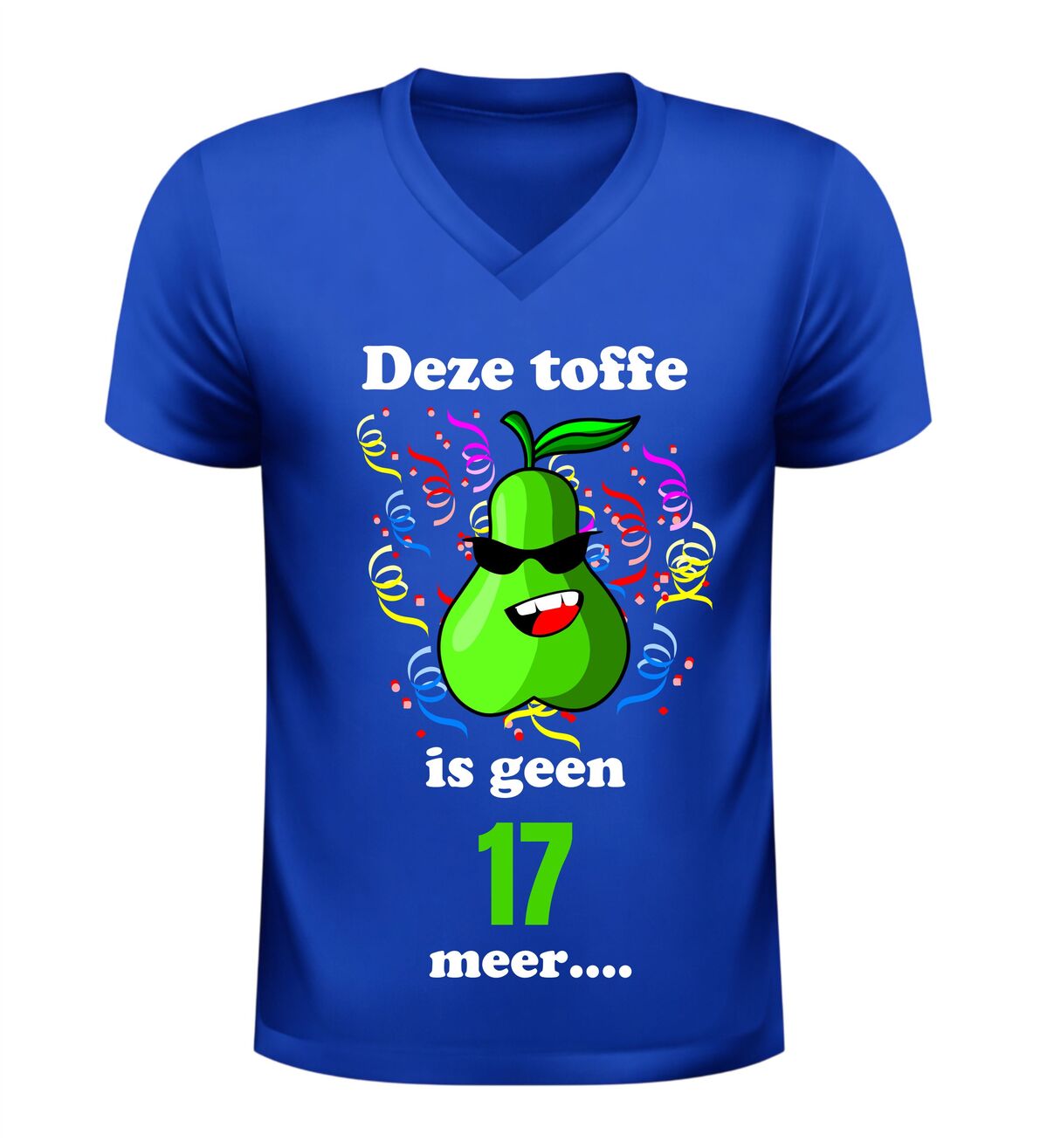 Vier de 18e verjaardag in stijl met dit grappige v-hals shirt met de tekst deze toffe peer is geen 17 meer en een leuke afbeelding van een toffe peer. Dit originele verjaardag T-shirt is perfect voor iedereen die eindelijk 18 jaar wordt en dit bijzondere moment met humor wil vieren. De speelse woordgrap maakt het shirt ideaal voor een feest, verjaardagspartij of als opvallende outfit tijdens de grote dag.