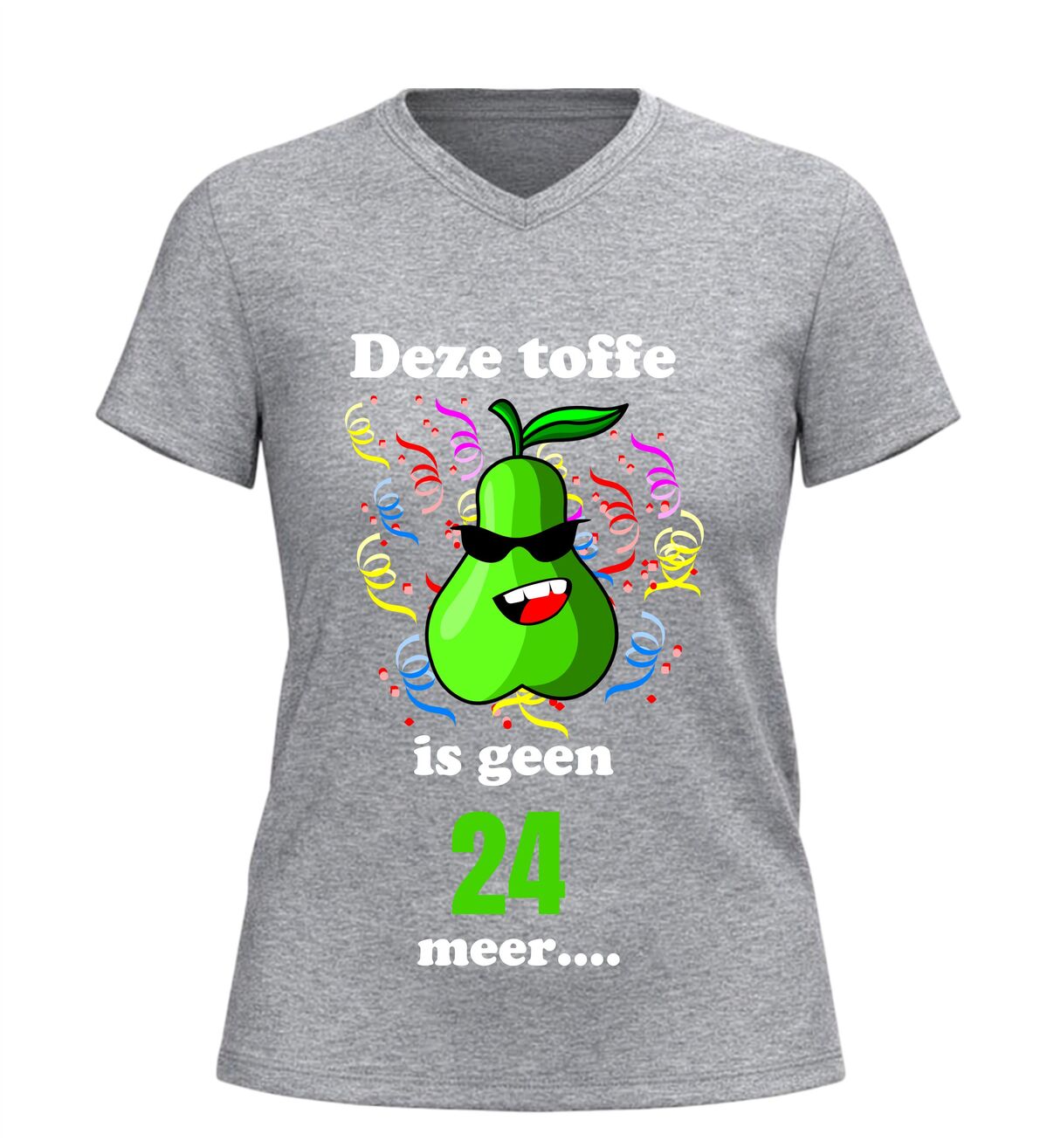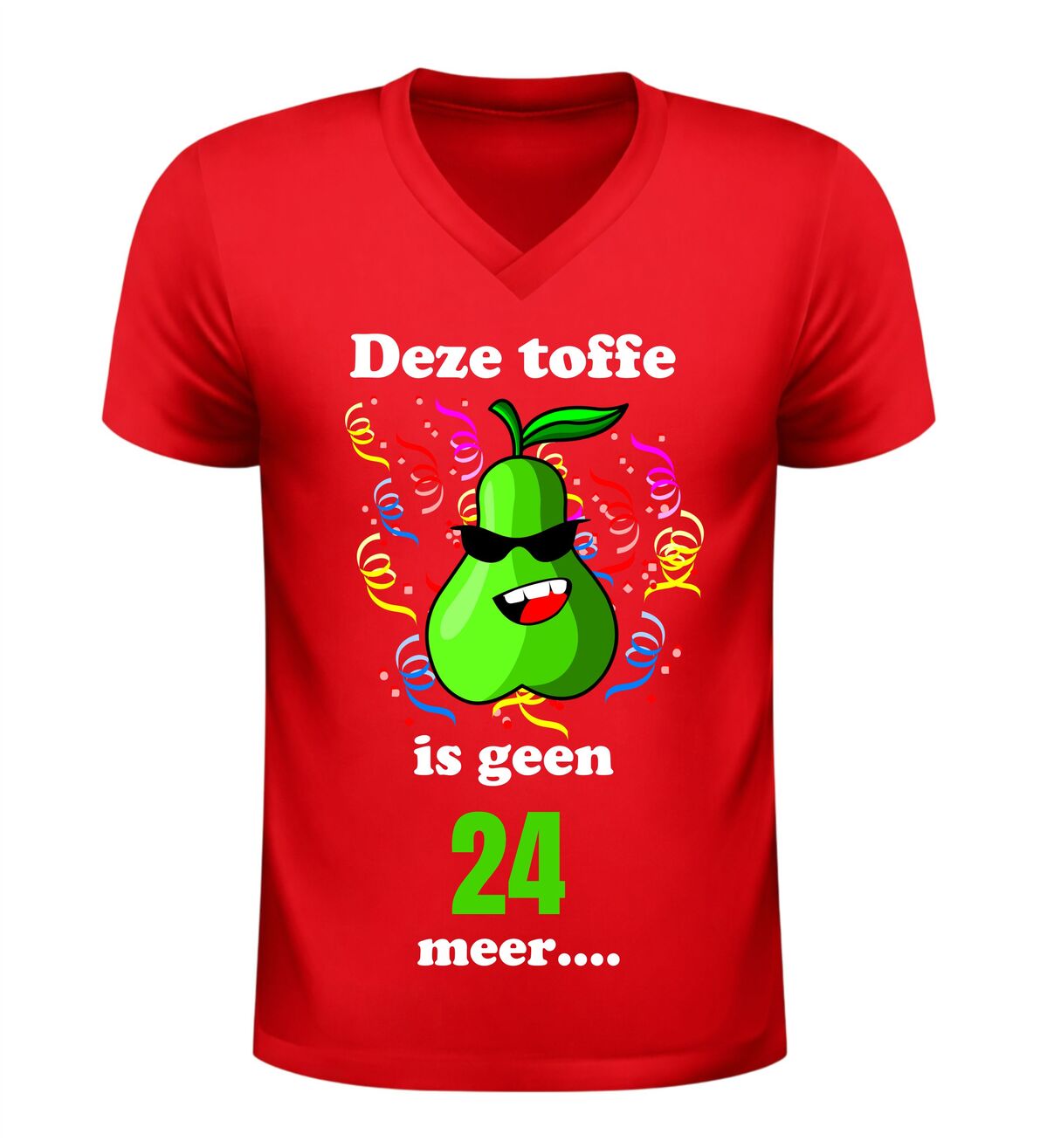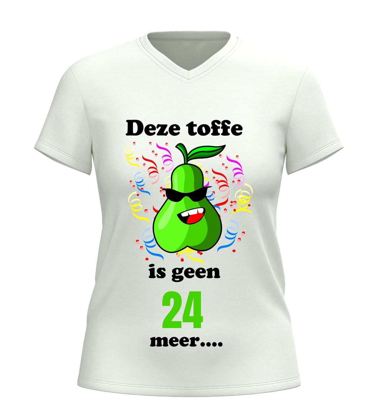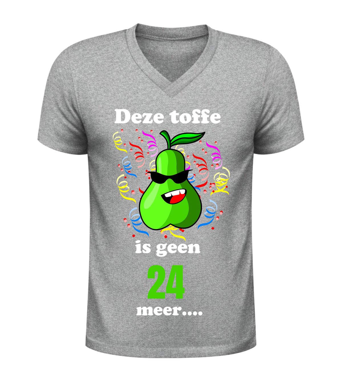 Maak van de 25ste verjaardag een feest om nooit te vergeten met dit grappige V-hals shirt met de tekst Deze toffe peer is geen 24 jaar meer. Dit originele 25 jaar verjaardag shirt is perfect voor iedereen die deze mijlpaal met humor wil vieren. De speelse woordgrap en het feestelijke karakter maken dit T-shirt een echte blikvanger tijdens ieder verjaardagsfeest.