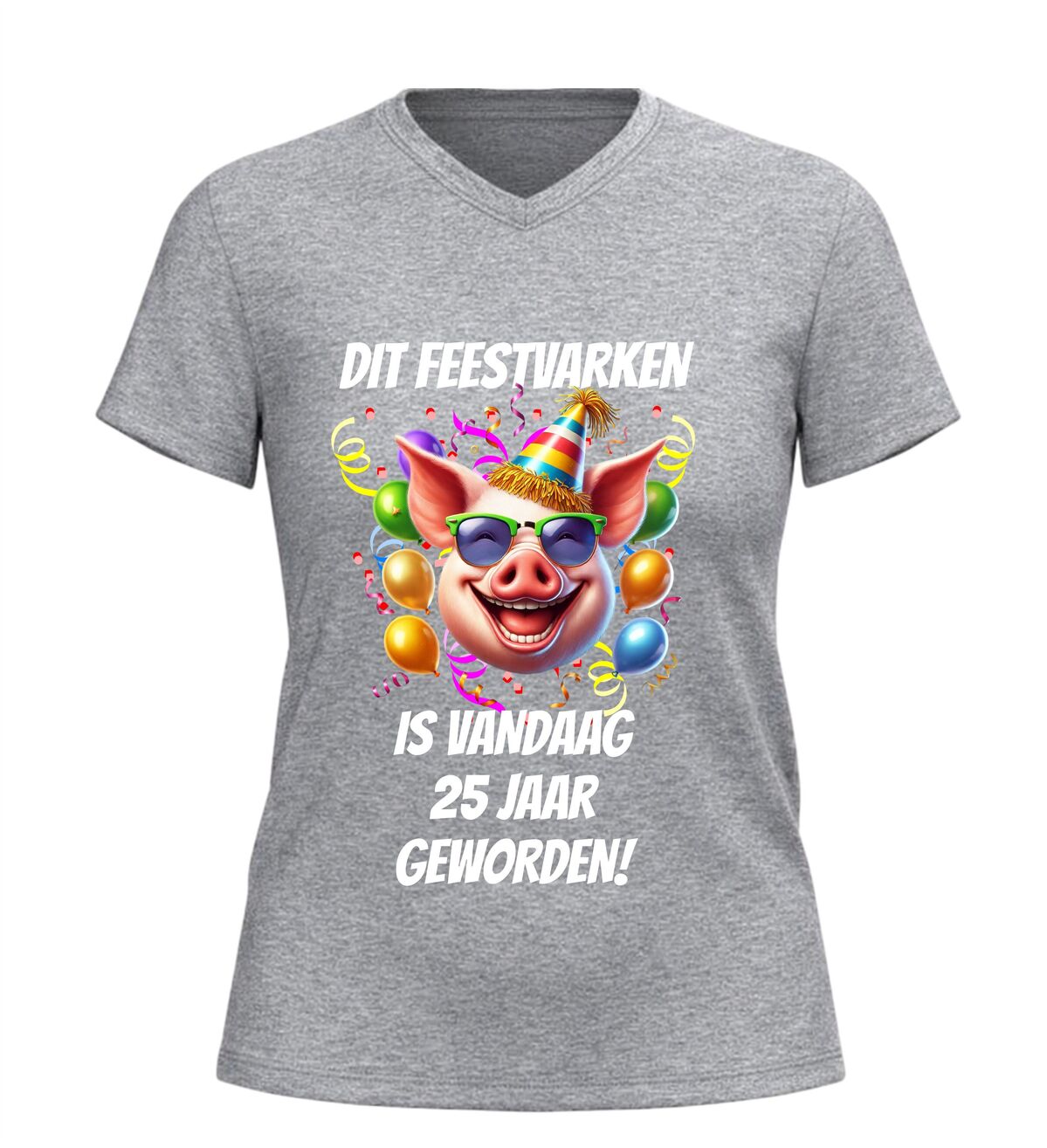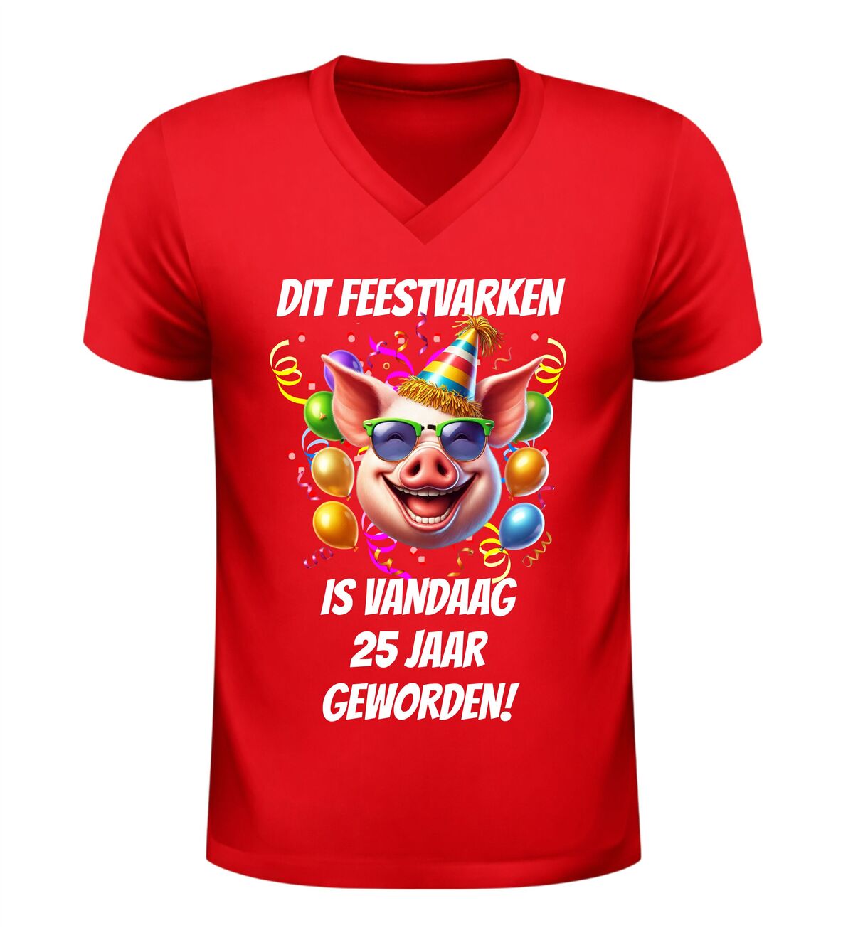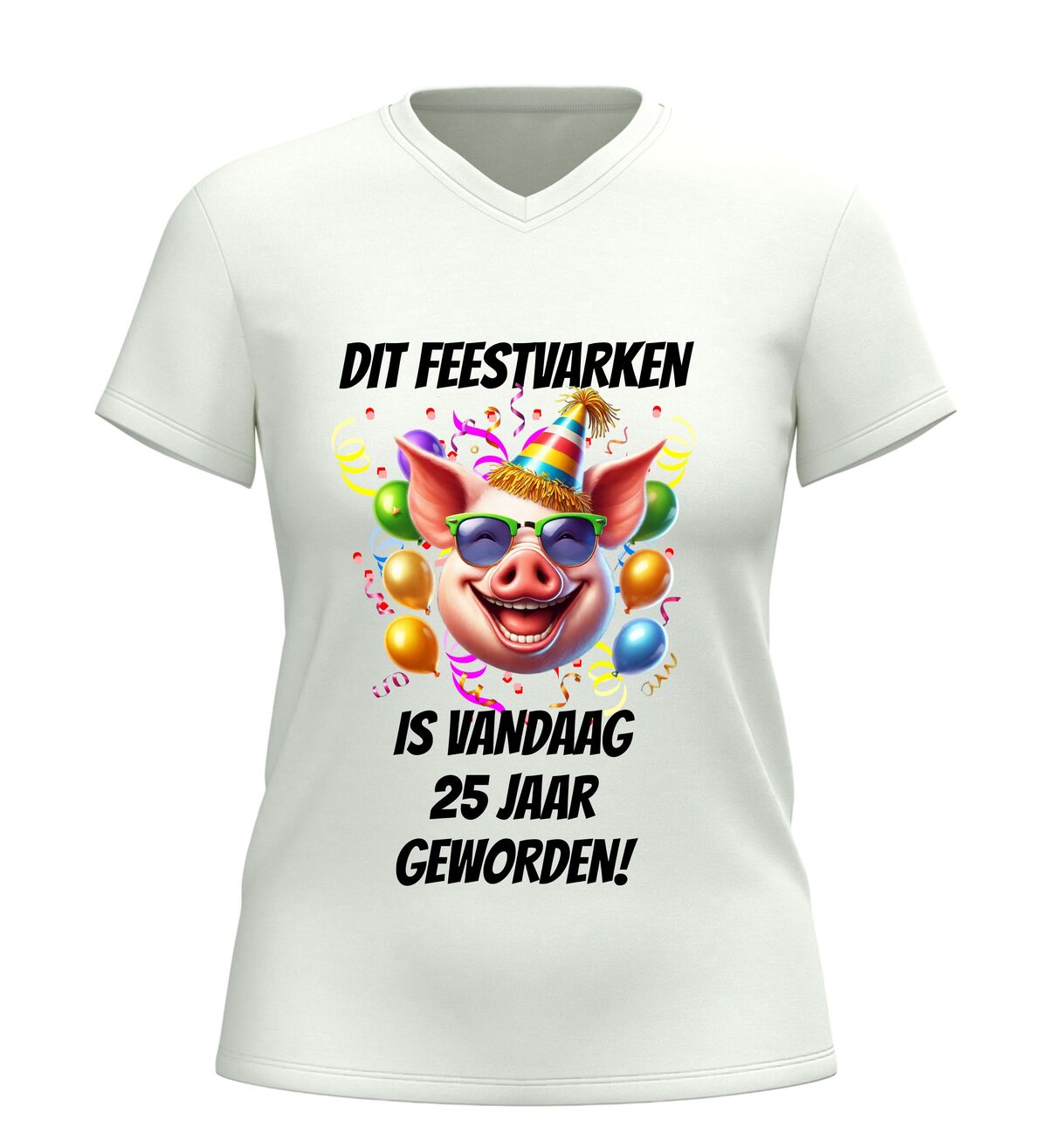 Vier een bijzondere mijlpaal met dit grappige V-hals shirt met de tekst dit feestvarken is vandaag 25 jaar geworden. Dit originele 25e verjaardag T-shirt is perfect voor iedereen die zijn of haar 25e verjaardag groots wil vieren. De humoristische tekst maakt het shirt een echte blikvanger tijdens het feest en zorgt gegarandeerd voor lachende gezichten.