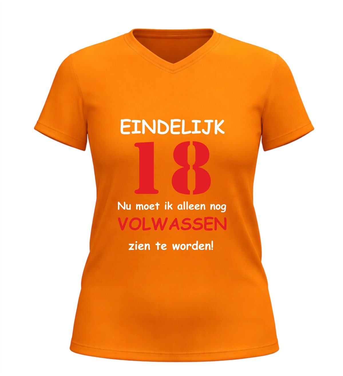 Dit V-hals t-shirt met de tekst eindelijk 18, nu moet ik nog volwassen worden, is het perfecte shirt voor een 18e verjaardag met een flinke dosis humor. Achttien worden is een bijzondere mijlpaal en met dit grappige 18 jaar T-shirt laat je op een luchtige manier zien dat volwassen worden misschien nog even op zich mag laten wachten. Ideaal om te dragen tijdens een verjaardagsfeest, festival of gezellig avondje uit.