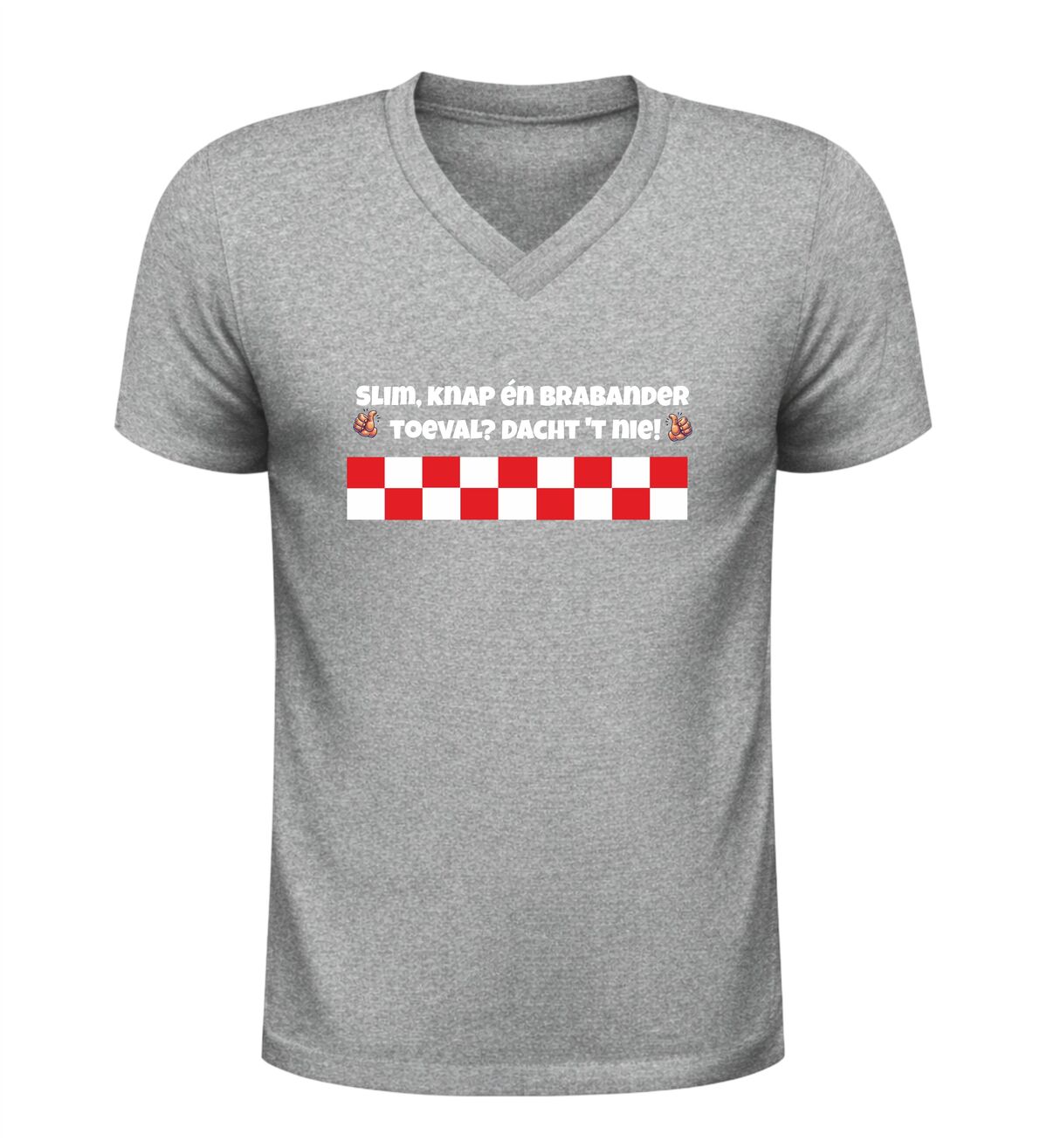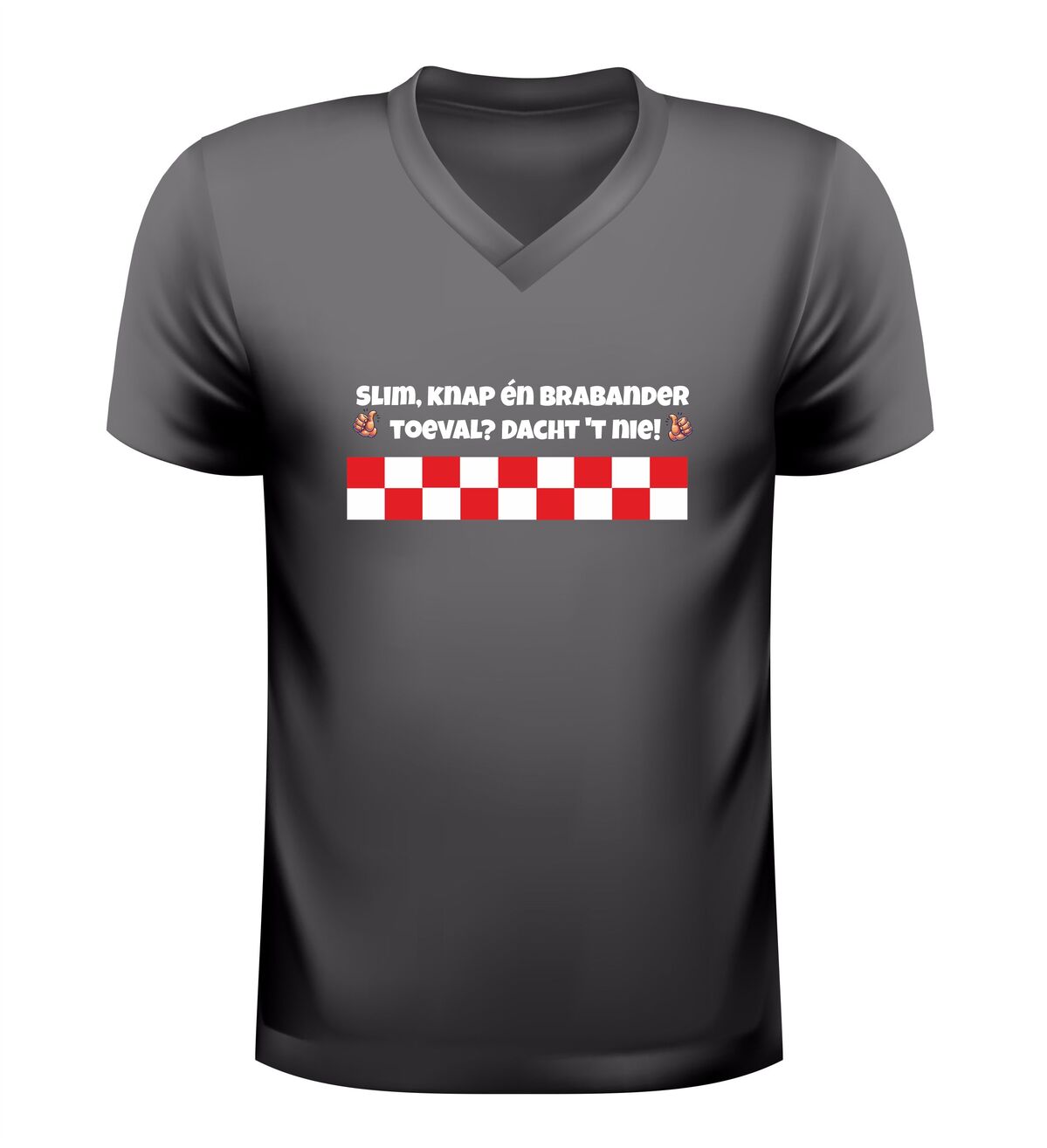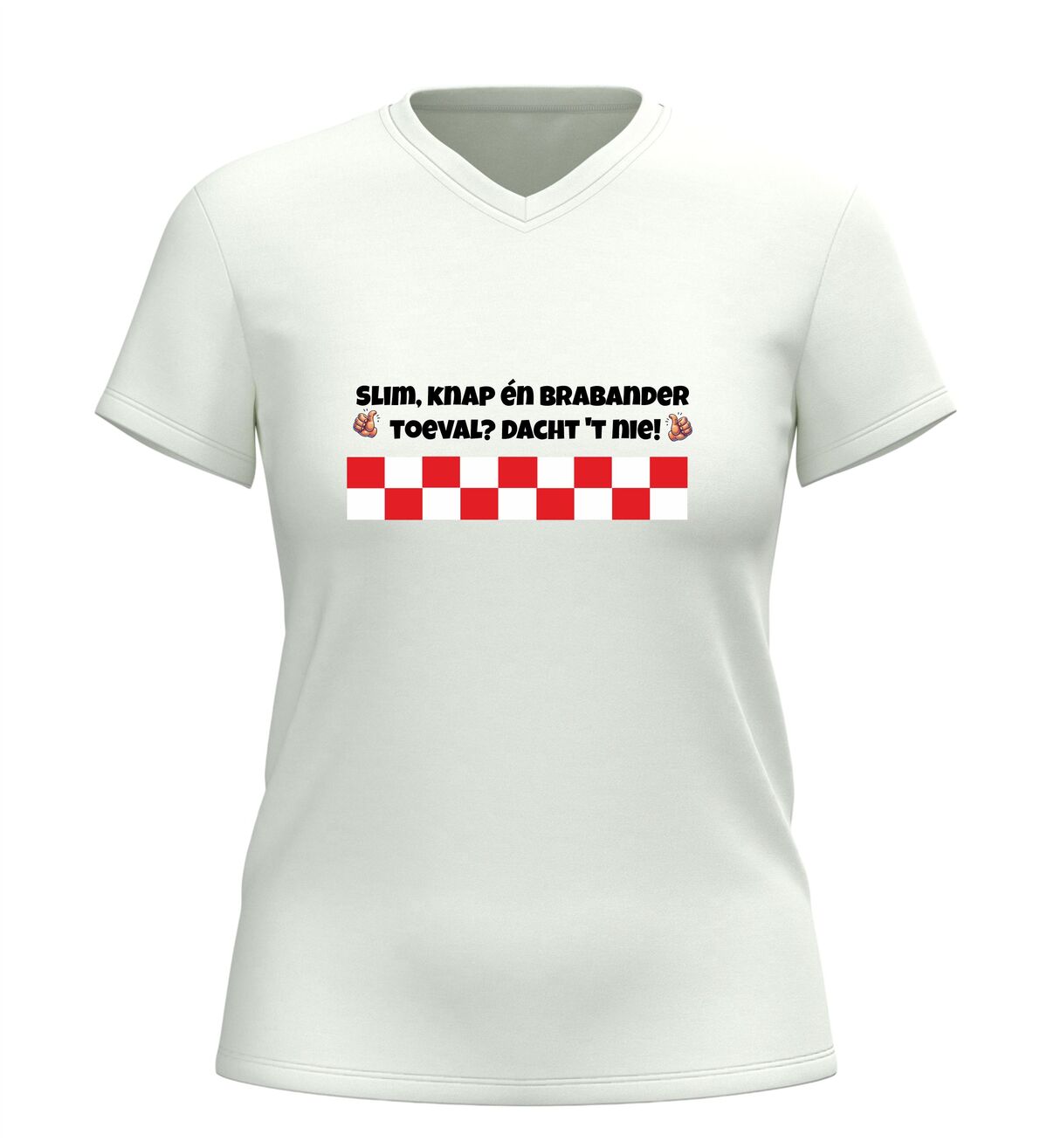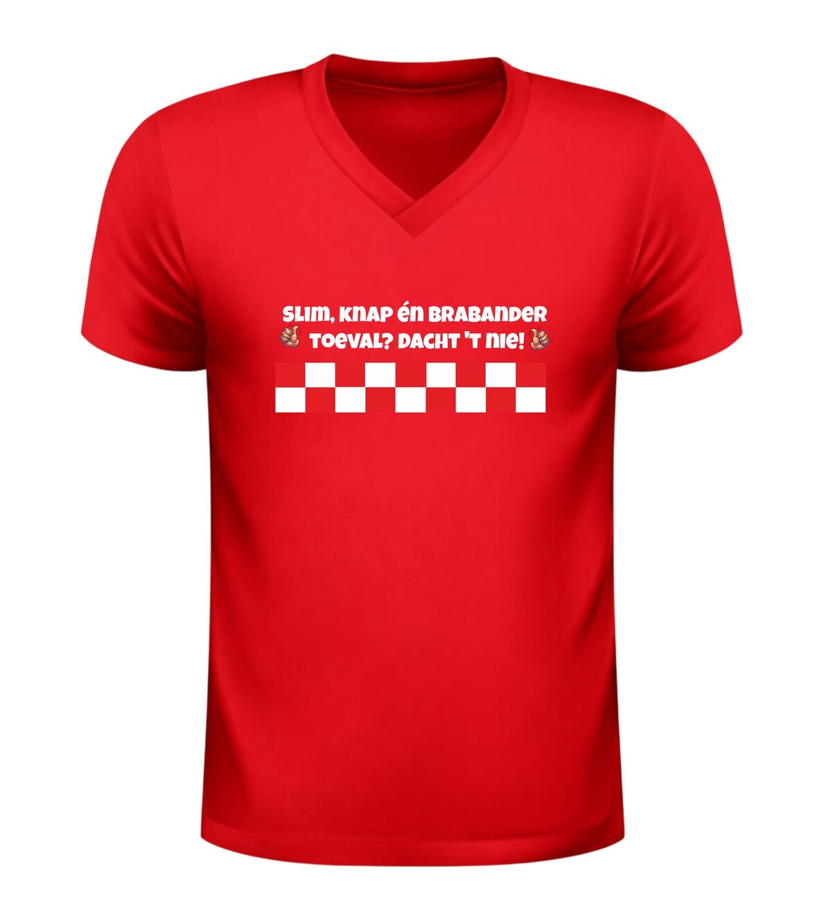 Dit V-hals T-shirt met de opvallende tekst Slim, Knap, Brabander. Toeval? Dacht het niet. is gemaakt voor iedereen die trots is op zijn Brabantse afkomst en dat graag met een knipoog laat zien. Brabant staat bekend om zijn gezelligheid, humor en levenslust, maar ook om slimme en ondernemende mensen. Met dit Brabants shirt combineer je zelfvertrouwen, humor en regionale trots in één krachtig statement. De tekst is herkenbaar, speels en typisch Brabants, waardoor het shirt direct opvalt en zorgt voor positieve reacties.