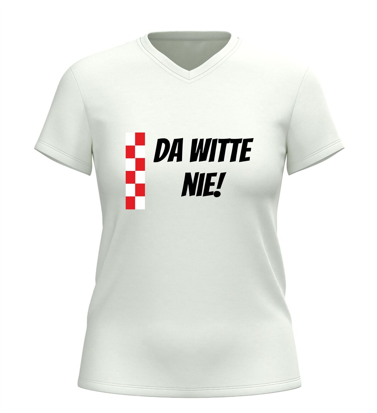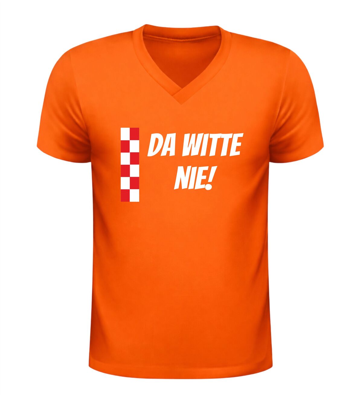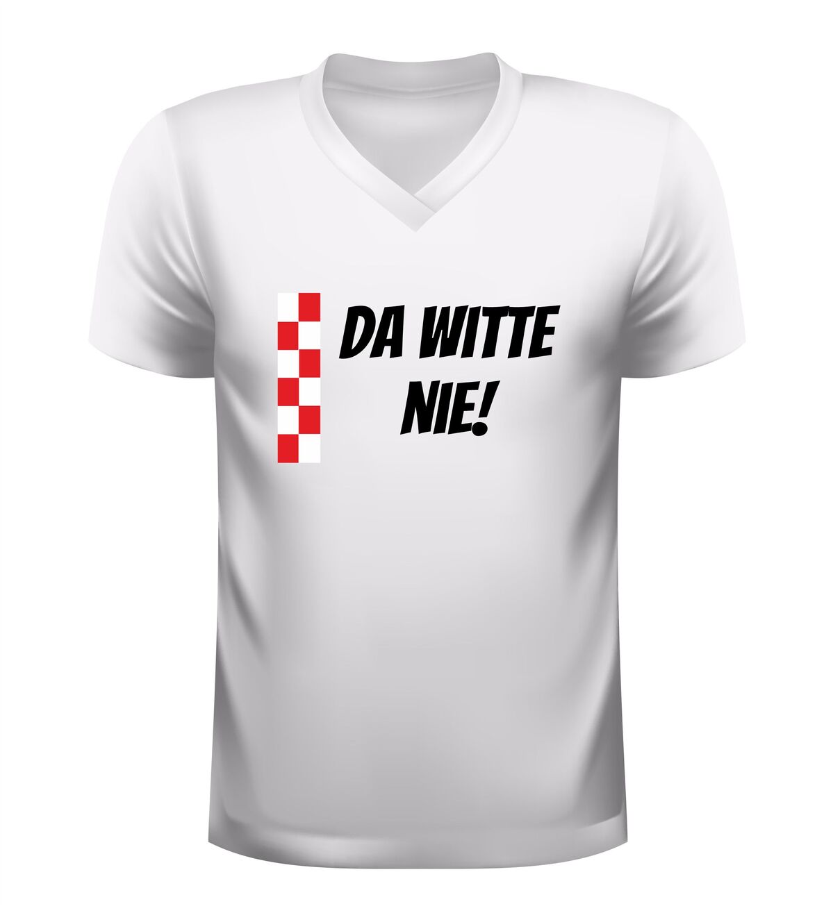 Dit Brabants V-hals T-shirt met de tekst da witte nie en een rood-wit geblokte Brabantse vlag is perfect voor carnaval, festivals en Brabantse feesten. Het shirt combineert een opvallende print met een comfortabele pasvorm en is geschikt voor zowel dames als heren. Dankzij het zachte en ademende materiaal zit het T-shirt prettig tijdens lange feestdagen. Ideaal als carnavalskleding, Brabants outfit of origineel cadeau voor iedereen die trots is op Brabant.