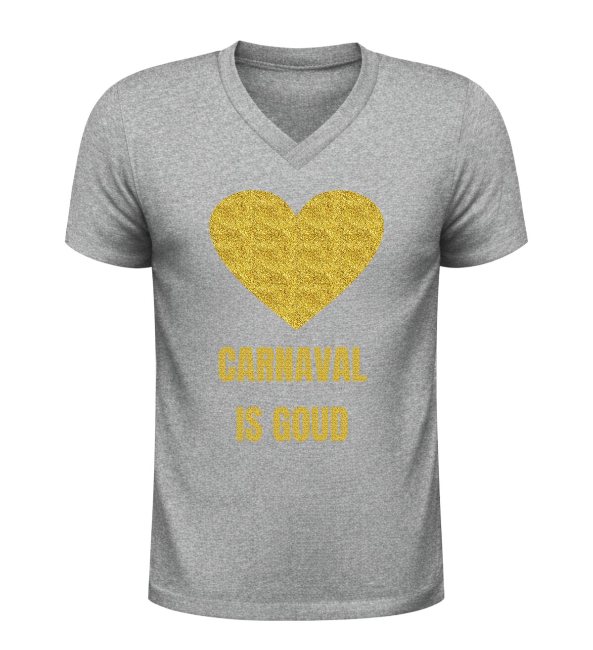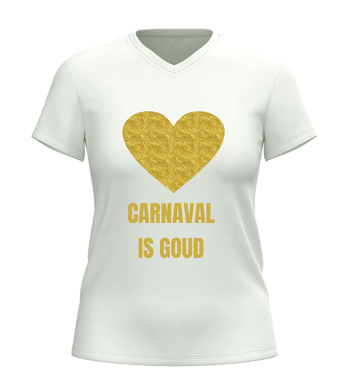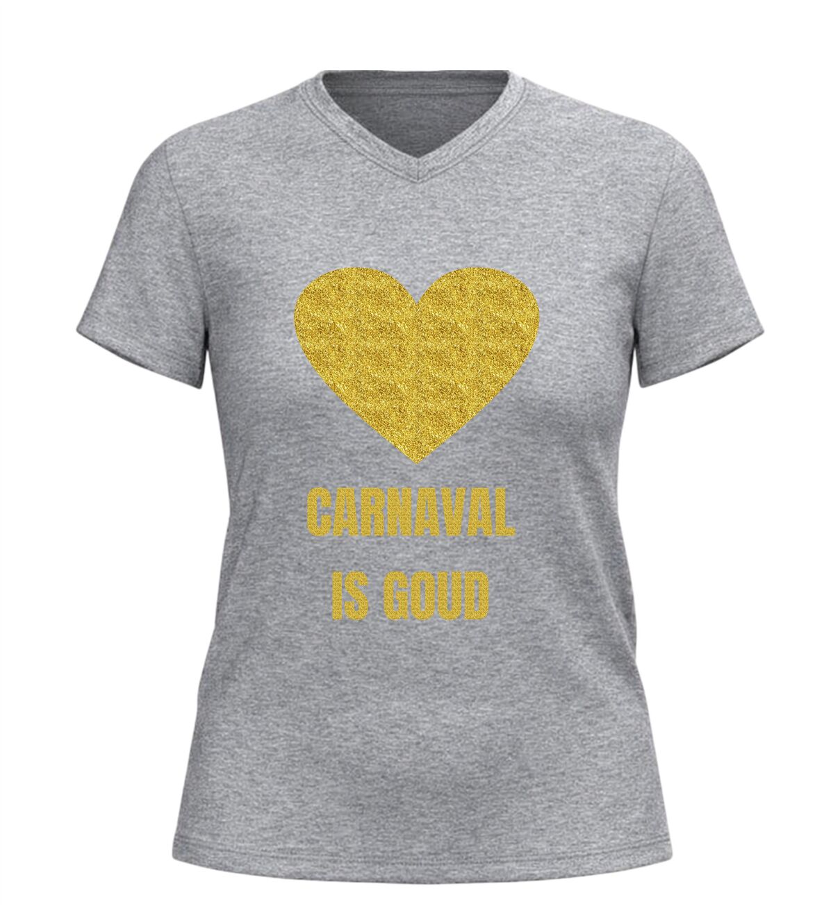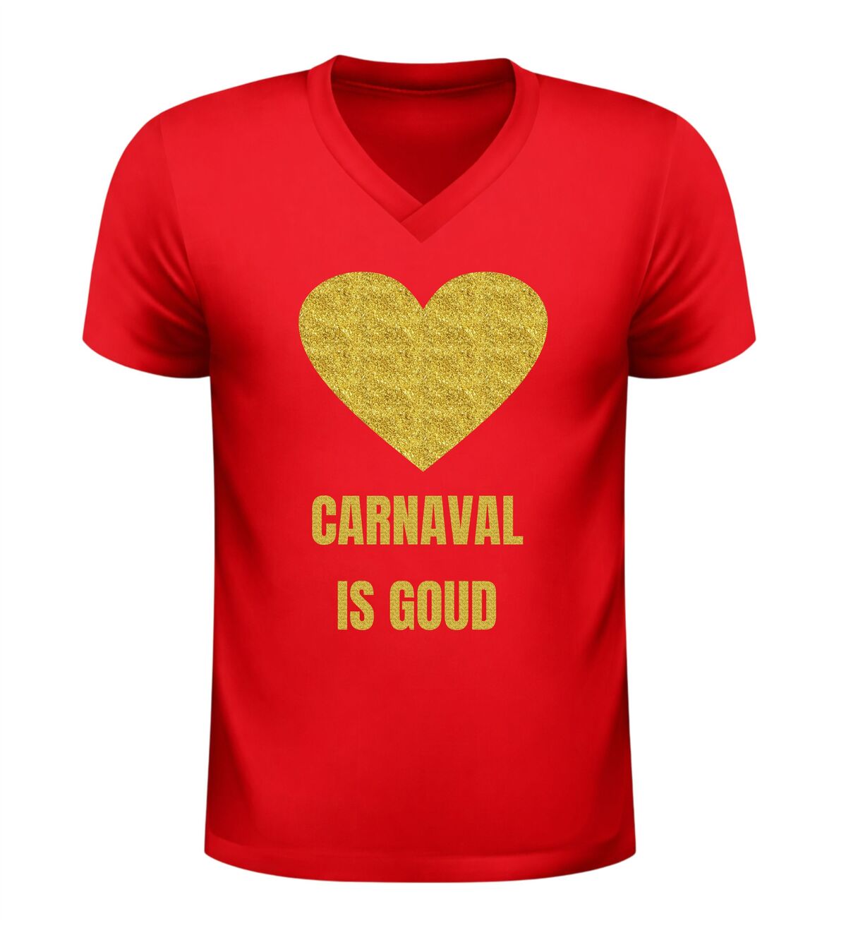 Dit V-hals shirt voor dames en heren met de tekst “Carnaval is goud” en een hartje is hét perfecte shirt voor iedereen die tijdens carnaval wil stralen. Carnaval is het moment om te schitteren, op te vallen en plezier te maken, en dat doe je moeiteloos met deze opvallende gouden glitter bedrukking. De combinatie van carnaval en een gouden glitter bedrukking zorgt direct voor een feestelijke uitstraling die perfect past bij de sfeer van carnaval. Zodra je dit shirt aantrekt, laat je zien dat carnaval voor jou draait om feest, trots en samen vieren.