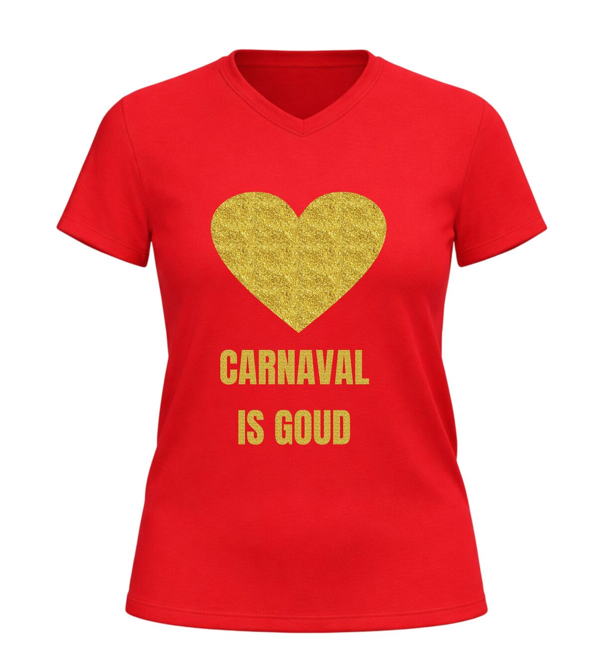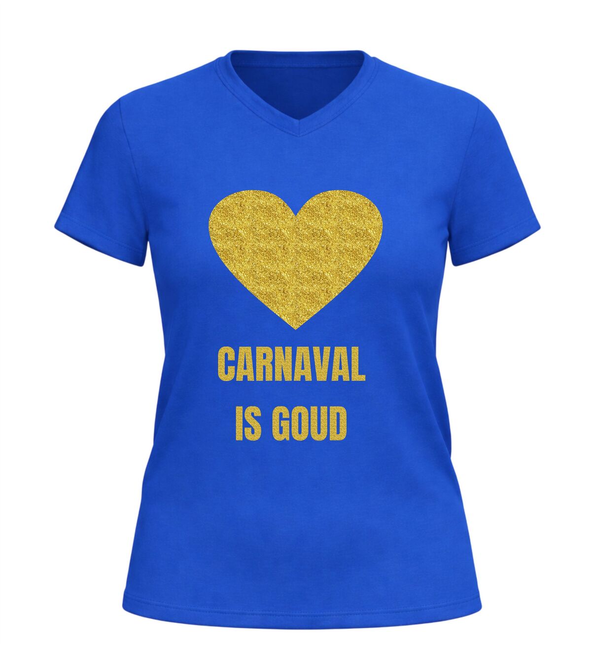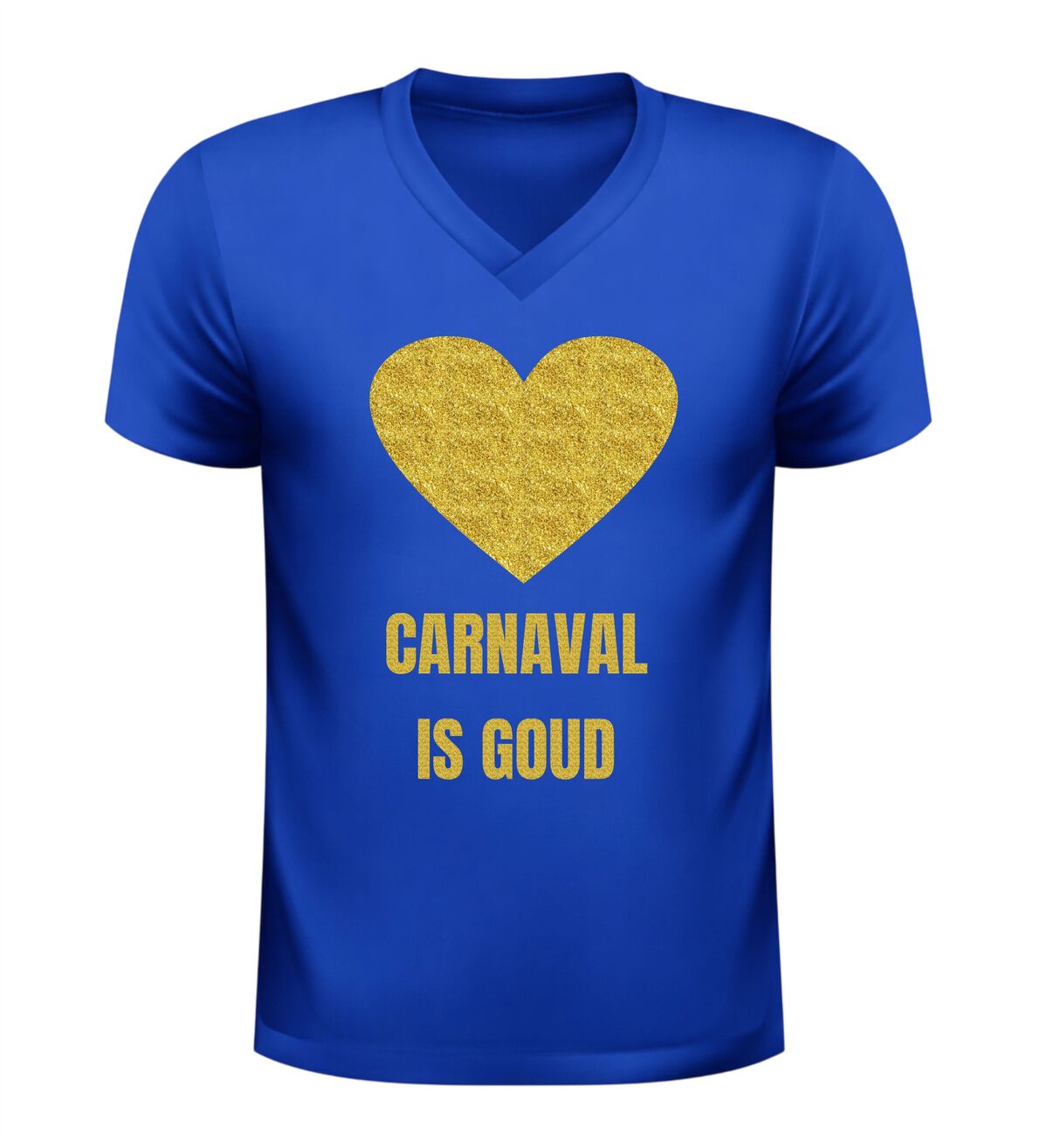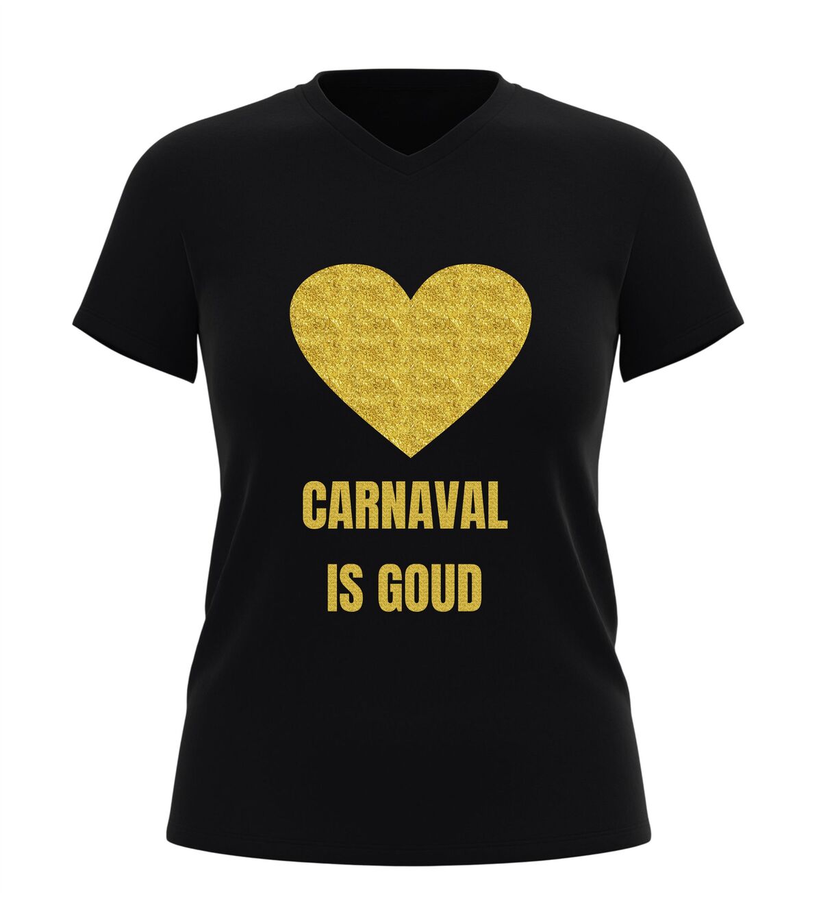 Dit V-hals shirt voor dames en heren met de tekst “Carnaval is goud” en een hartje is hét perfecte shirt voor iedereen die tijdens carnaval wil stralen. Carnaval is het moment om te schitteren, op te vallen en plezier te maken, en dat doe je moeiteloos met deze opvallende gouden glitter bedrukking. De combinatie van carnaval en een gouden glitter bedrukking zorgt direct voor een feestelijke uitstraling die perfect past bij de sfeer van carnaval. Zodra je dit shirt aantrekt, laat je zien dat carnaval voor jou draait om feest, trots en samen vieren.