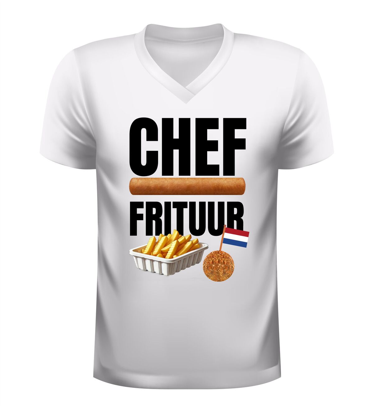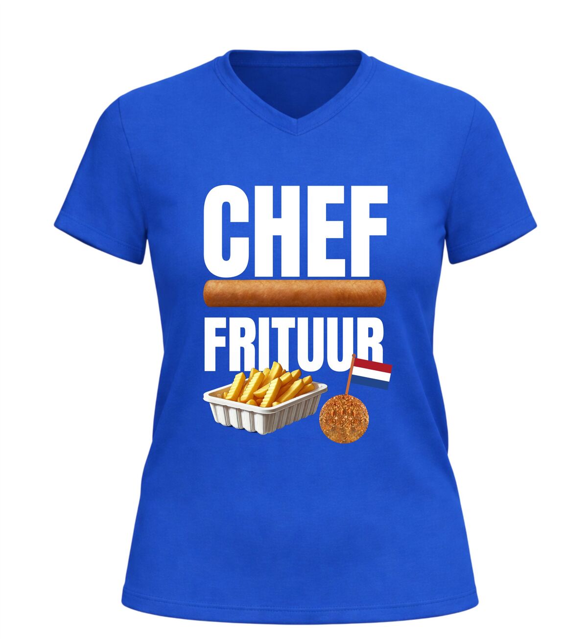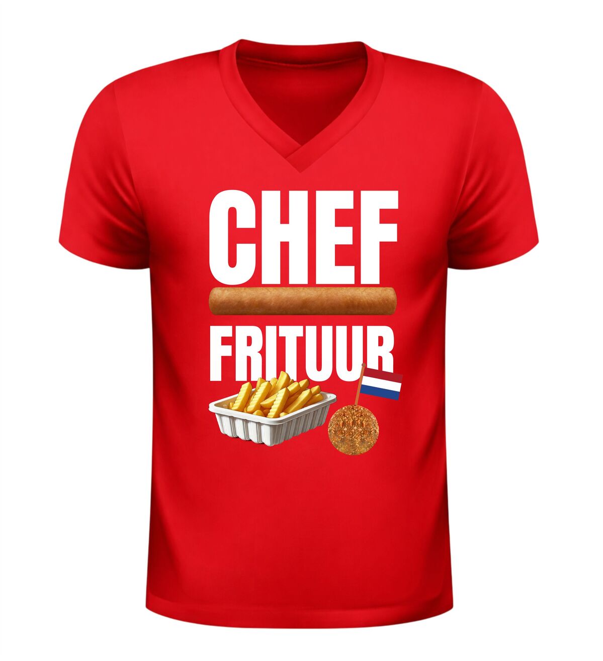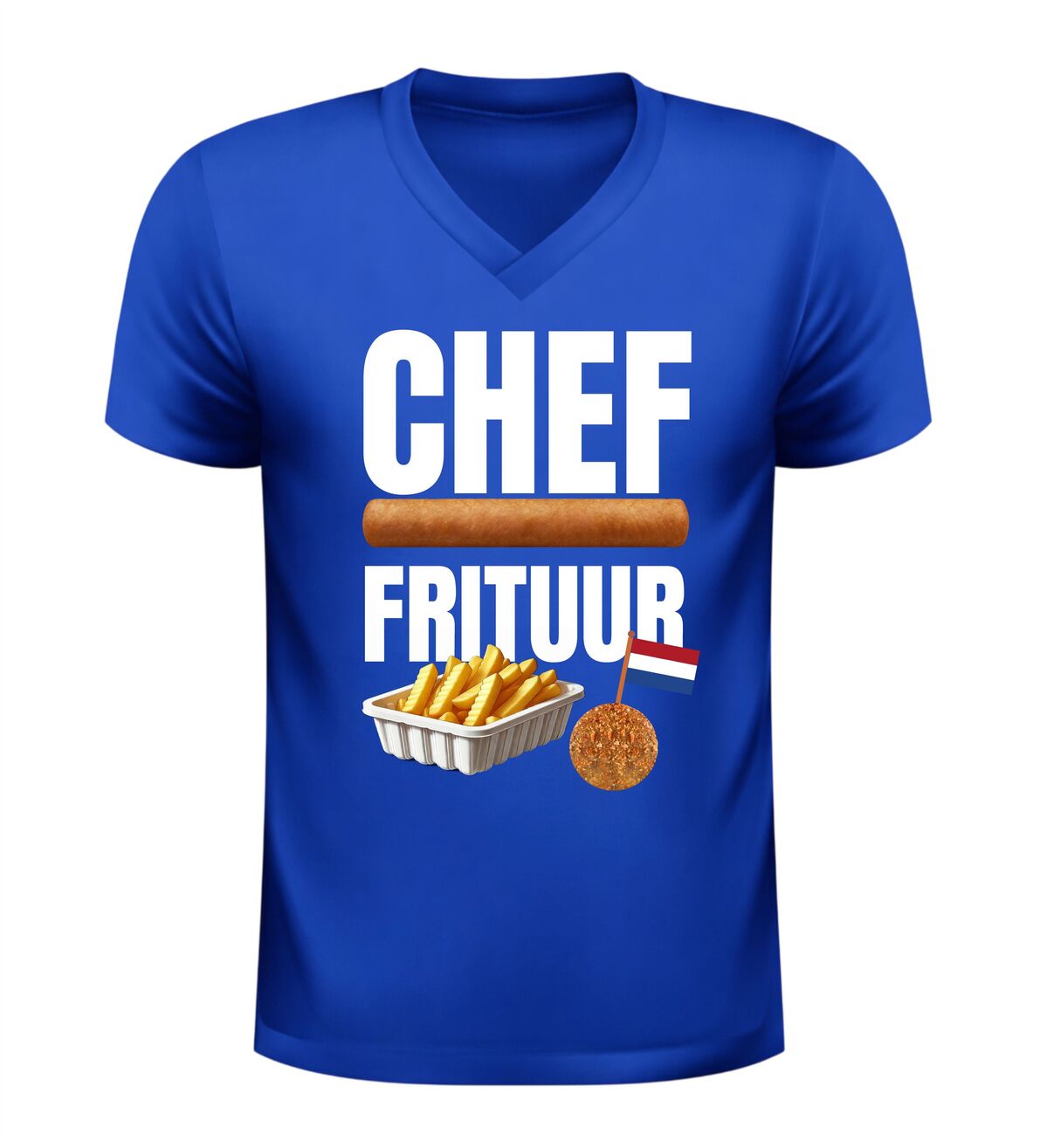 Dit V-hals shirt voor dames en heren met de tekst Chef Frituur is gemaakt voor iedereen die zich thuis voelt bij de frituur en trots is op zijn of haar snack skills. Met een duidelijke en grappige afbeelding van patat, frikandel en bitterbal laat dit shirt meteen zien wie de echte chef frituur is. Snacks zoals patat, frikandel en bitterbal zijn niet meer weg te denken uit de Nederlandse eetcultuur en dit shirt brengt die liefde voor de frituur perfect samen in één opvallend ontwerp.