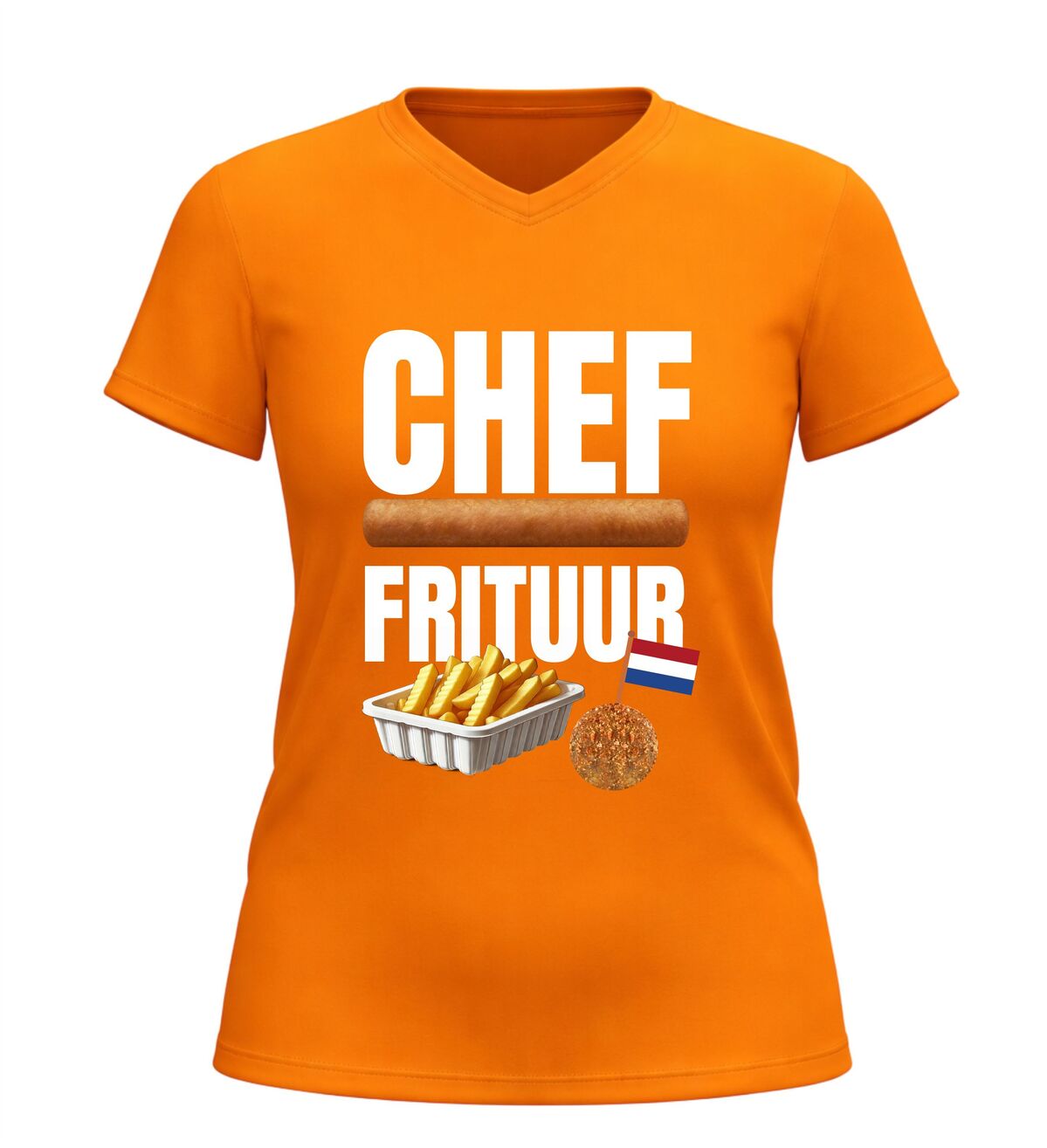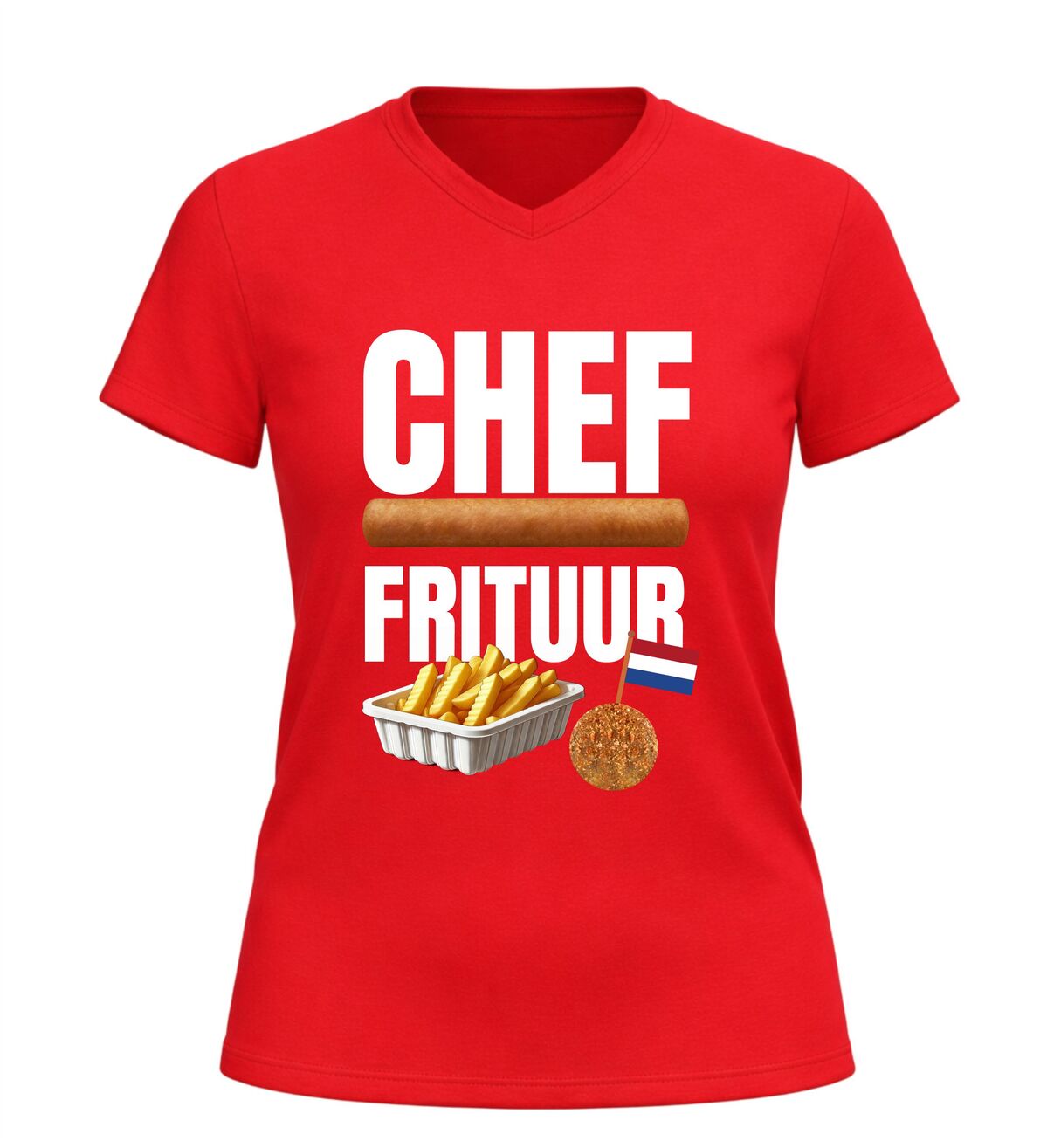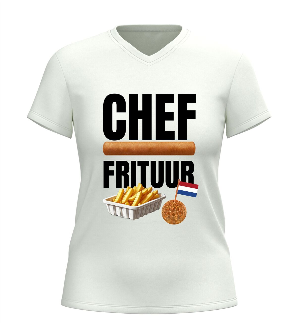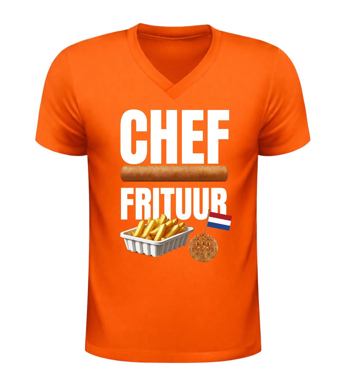 Dit V-hals shirt voor dames en heren met de tekst Chef Frituur is gemaakt voor iedereen die zich thuis voelt bij de frituur en trots is op zijn of haar snack skills. Met een duidelijke en grappige afbeelding van patat, frikandel en bitterbal laat dit shirt meteen zien wie de echte chef frituur is. Snacks zoals patat, frikandel en bitterbal zijn niet meer weg te denken uit de Nederlandse eetcultuur en dit shirt brengt die liefde voor de frituur perfect samen in één opvallend ontwerp.