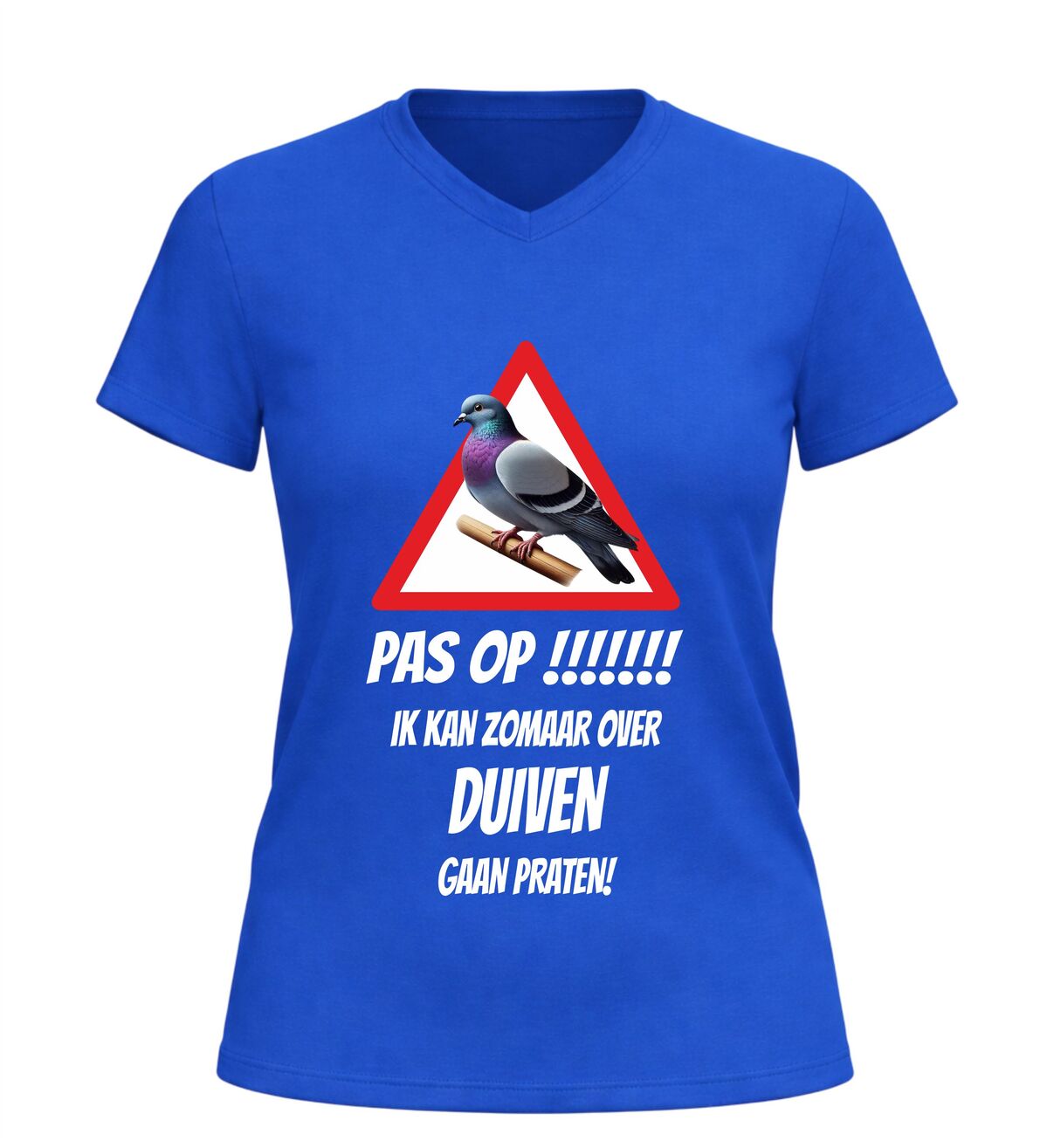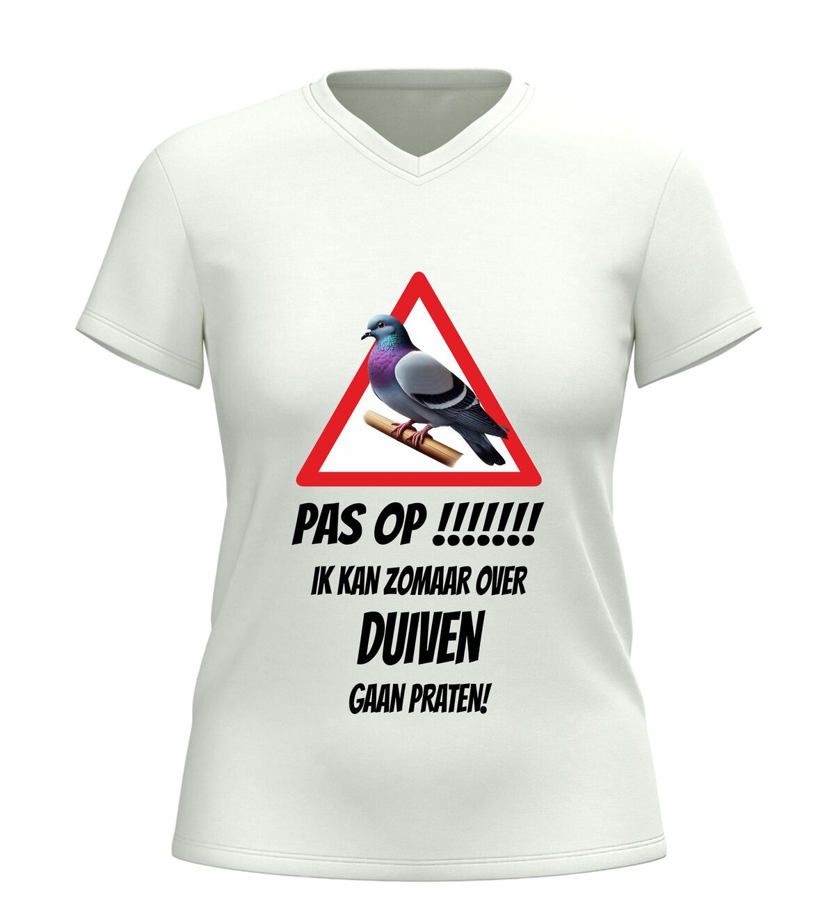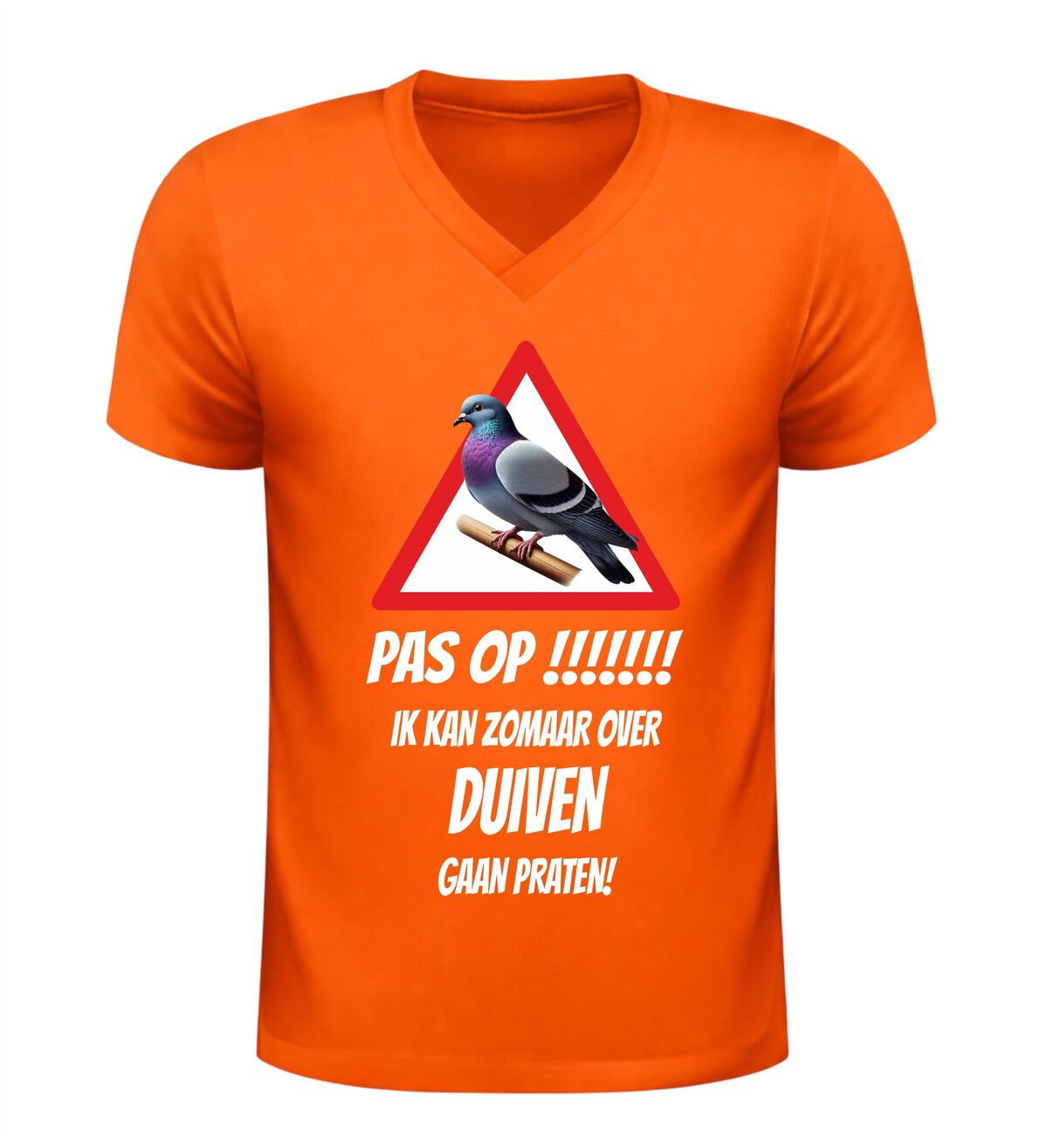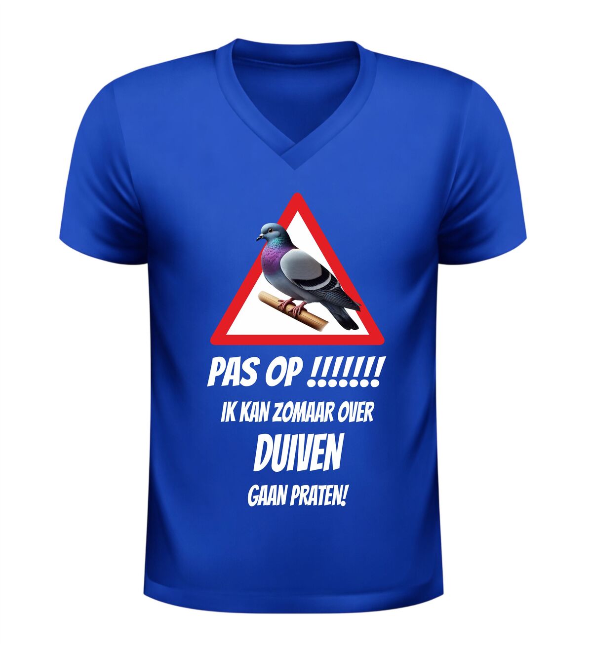 Dit V-hals shirt met de tekst Pas op ik kan zomaar over duiven gaan praten en een bijpassende duif-afbeelding is perfect voor iedereen die een passie heeft voor duiven en daar met humor voor uitkomt. Het shirt is verkrijgbaar voor dames en heren en heeft een comfortabele V-hals met een fijne pasvorm, waardoor het prettig draagt tijdens dagelijkse activiteiten, hobbybijeenkomsten of gezellige momenten met vrienden. De grappige tekst in combinatie met de duif-afbeelding maakt dit shirt een echte eyecatcher en zorgt gegarandeerd voor herkenning en leuke gesprekken. Of je nu een duivenliefhebber bent, graag praat over je hobby of op zoek bent naar een origineel cadeau, dit V-hals shirt laat op een speelse manier zien waar jouw interesse ligt. Het shirt is eenvoudig te combineren met andere outfits en is een leuk cadeau voor iedereen die zonder waarschuwing enthousiast over duiven kan beginnen.