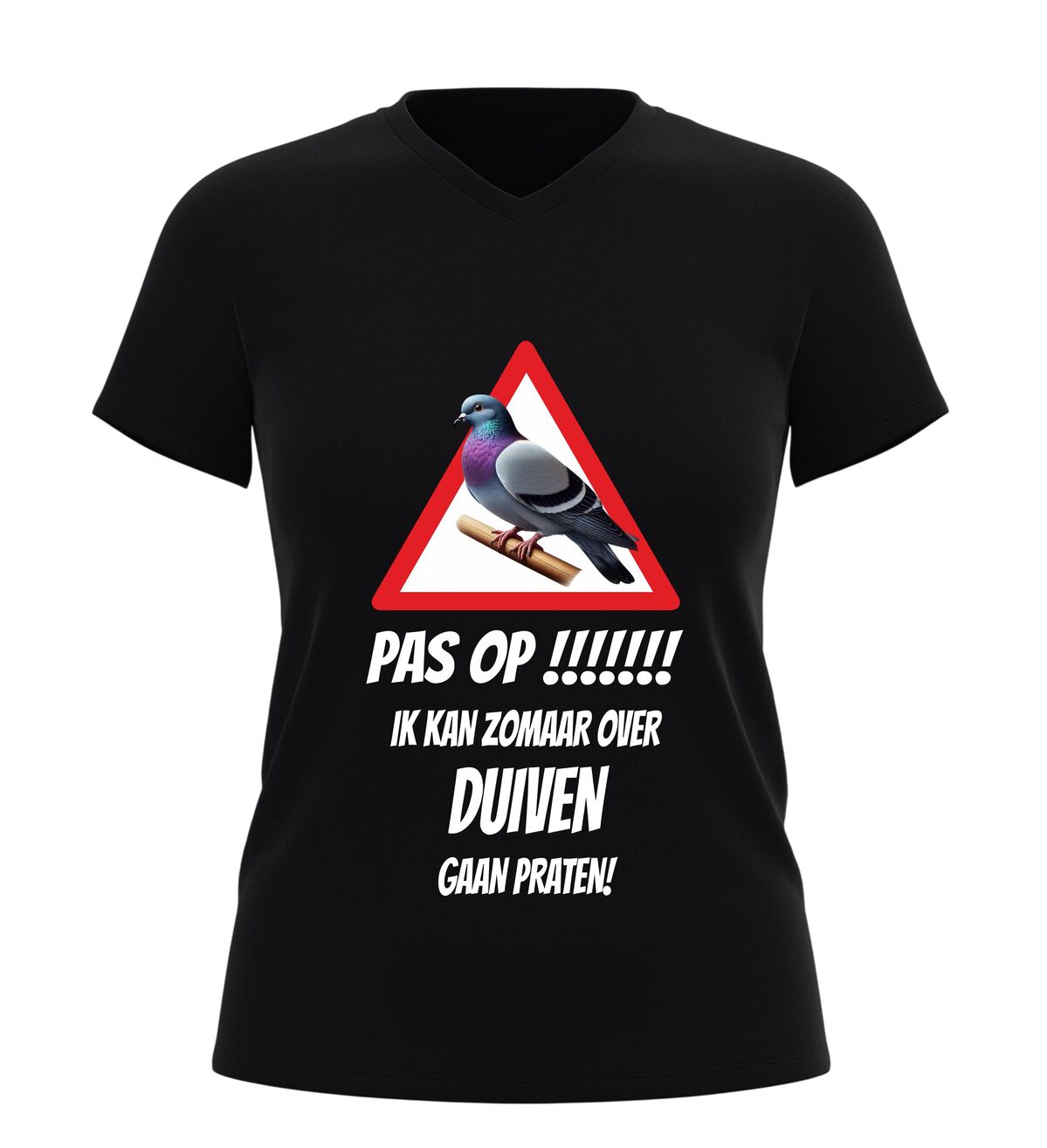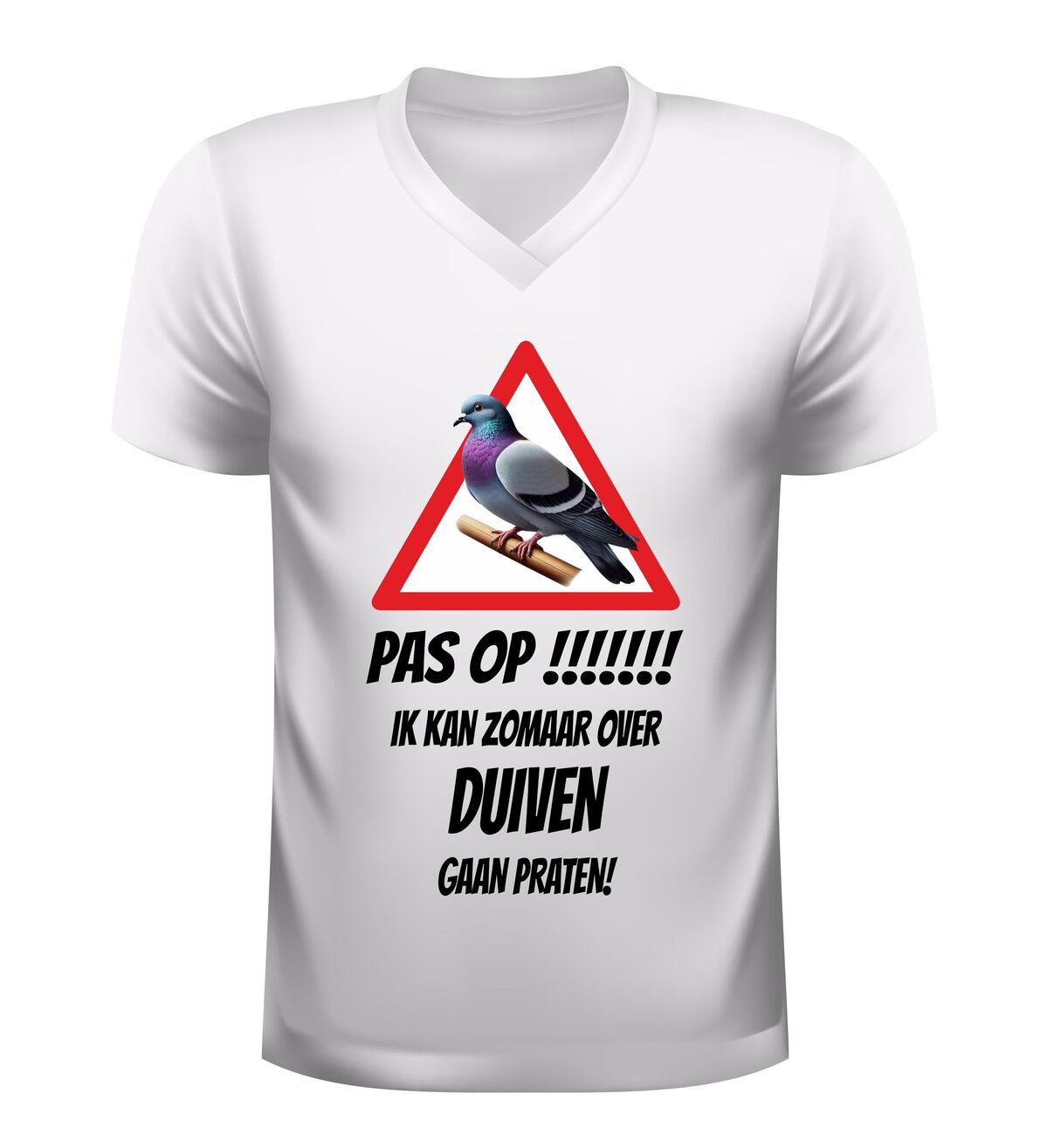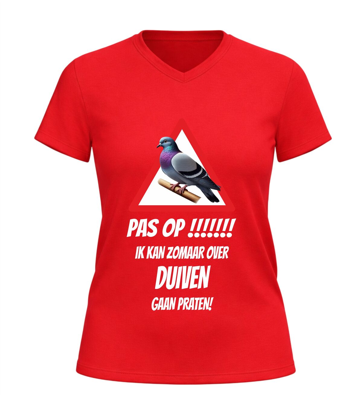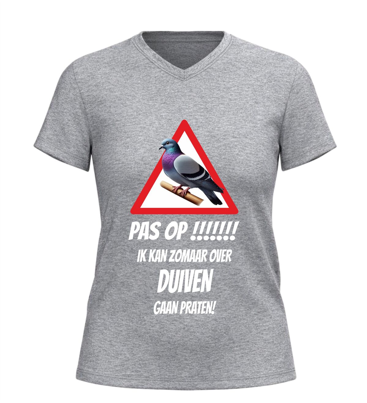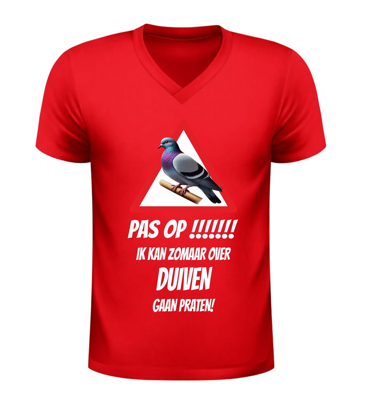 Dit V-hals shirt met de tekst Pas op ik kan zomaar over duiven gaan praten en een bijpassende duif-afbeelding is perfect voor iedereen die een passie heeft voor duiven en daar met humor voor uitkomt. Het shirt is verkrijgbaar voor dames en heren en heeft een comfortabele V-hals met een fijne pasvorm, waardoor het prettig draagt tijdens dagelijkse activiteiten, hobbybijeenkomsten of gezellige momenten met vrienden. De grappige tekst in combinatie met de duif-afbeelding maakt dit shirt een echte eyecatcher en zorgt gegarandeerd voor herkenning en leuke gesprekken. Of je nu een duivenliefhebber bent, graag praat over je hobby of op zoek bent naar een origineel cadeau, dit V-hals shirt laat op een speelse manier zien waar jouw interesse ligt. Het shirt is eenvoudig te combineren met andere outfits en is een leuk cadeau voor iedereen die zonder waarschuwing enthousiast over duiven kan beginnen.