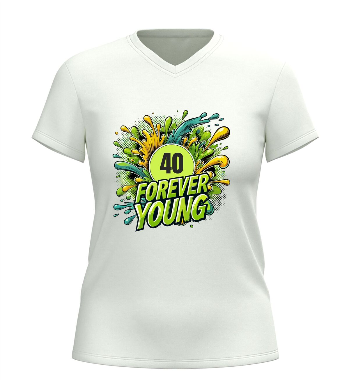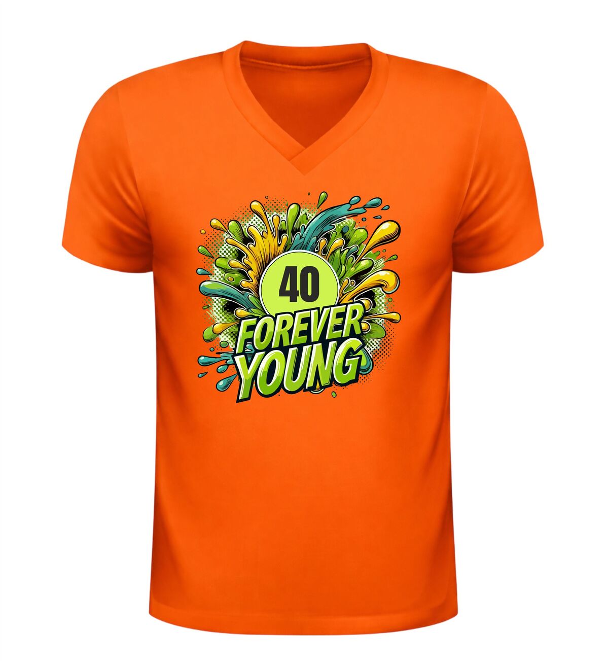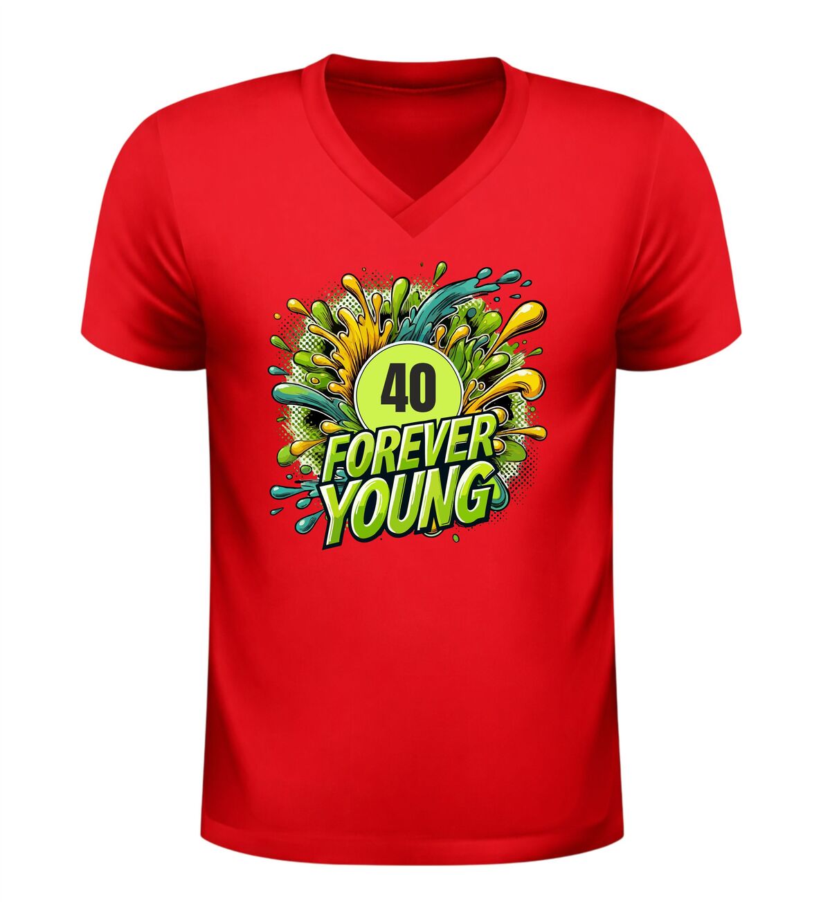 Veertig worden! Dat is geen leeftijd, dat is een mijlpaal. Dit V-hals T-shirt met de tekst forever young 40 jaar is perfect voor iedereen die bewijst dat leeftijd maar een getal is. Het shirt straalt feest, humor en zelfvertrouwen uit en is ideaal om te dragen tijdens een 40e verjaardag, een feestavond of een gezellig jubileummoment met vrienden en familie.