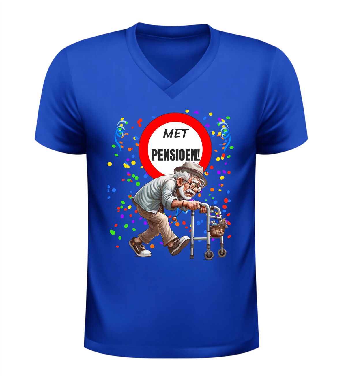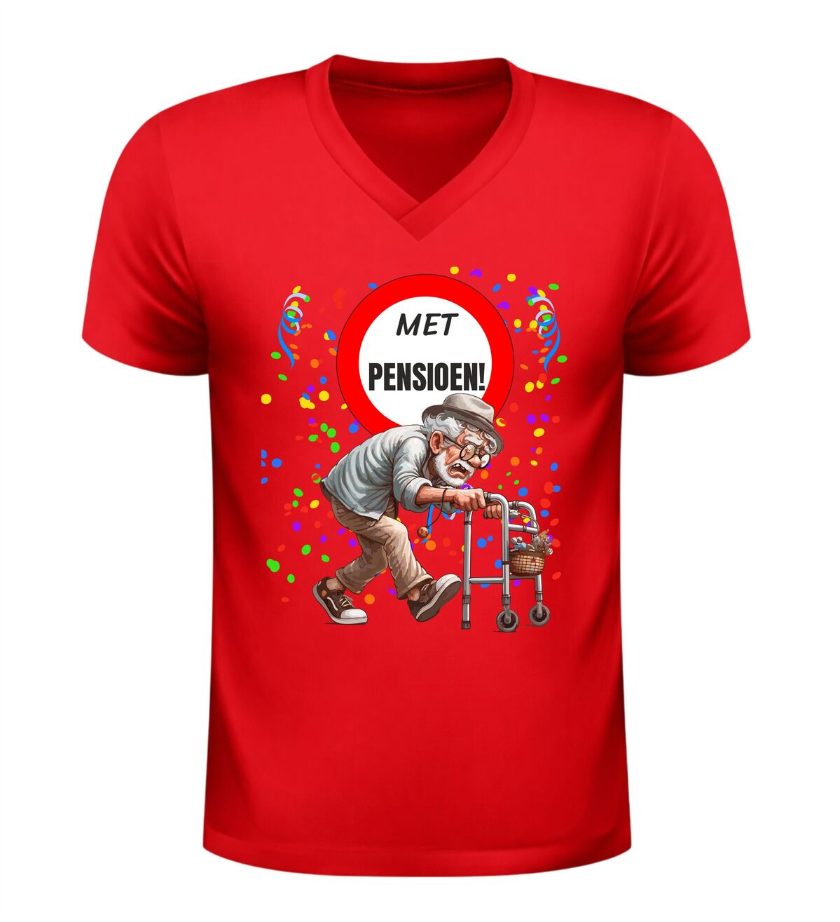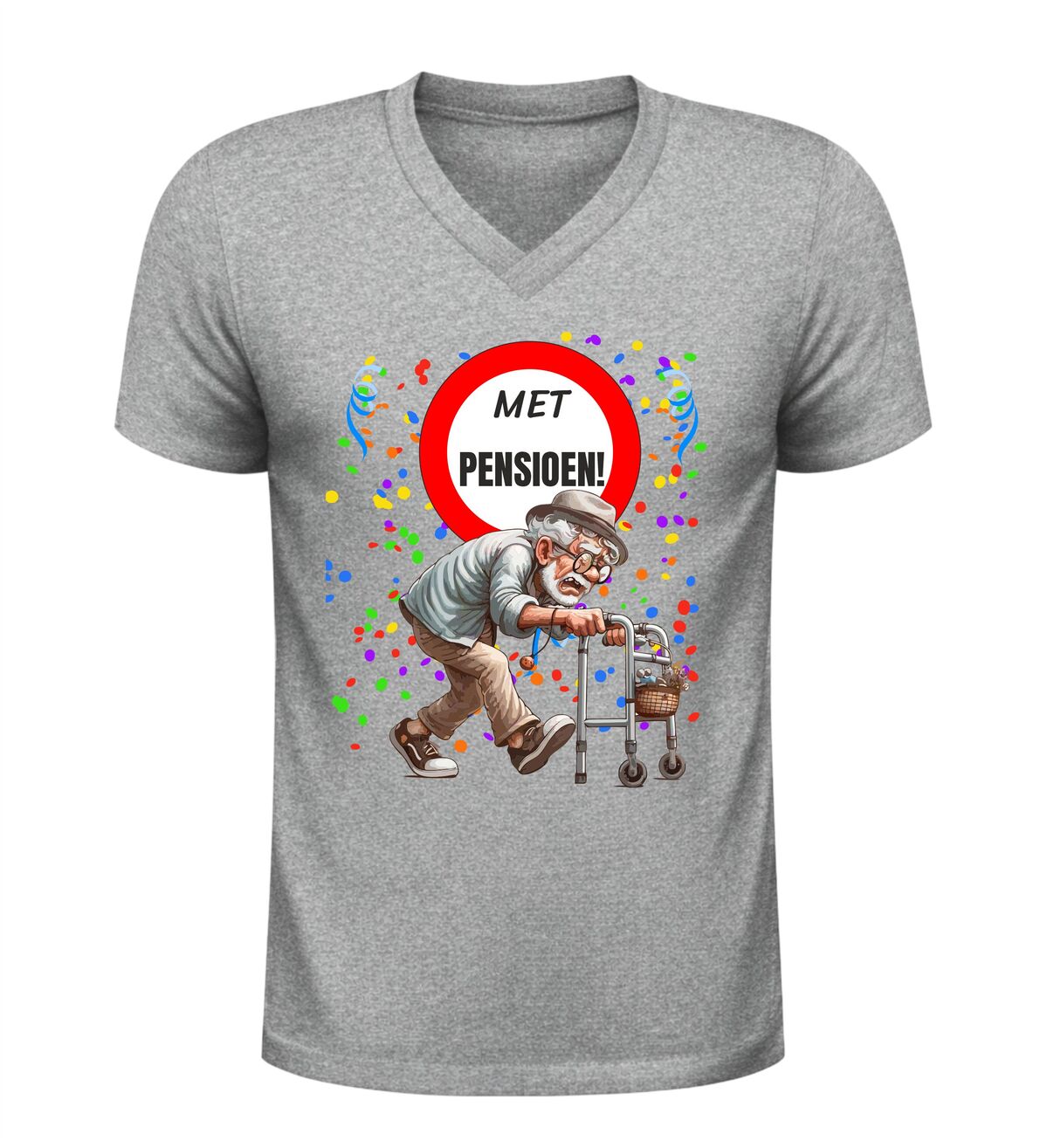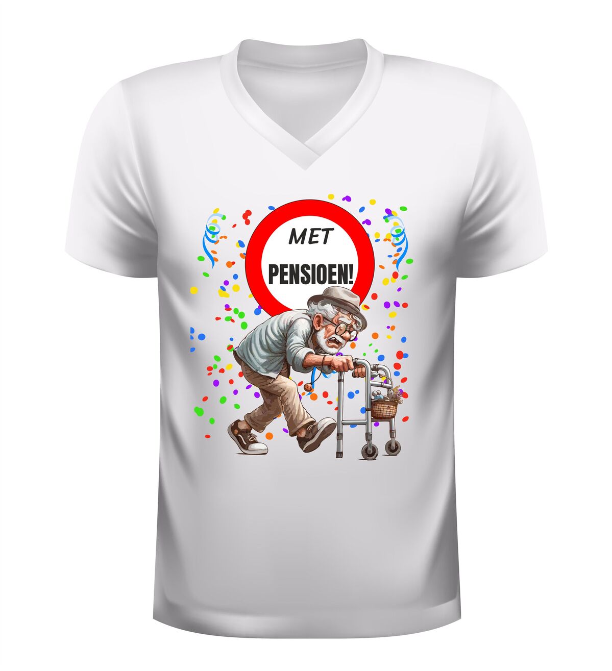 Dit V-hals heren shirt met de tekst Met Pensioen en een vrolijke afbeelding van een oude man met rollator en confetti is een perfecte manier om het pensioen te vieren. Met pensioen gaan is een bijzondere mijlpaal en dit pensioen shirt laat op een humoristische en ontspannen manier zien dat het werkende leven voorbij is. De combinatie van de duidelijke tekst met pensioen en de feestelijke pensioen afbeelding met confetti maakt dit shirt ideaal voor iedereen die met pensioen gaat of net met pensioen is.